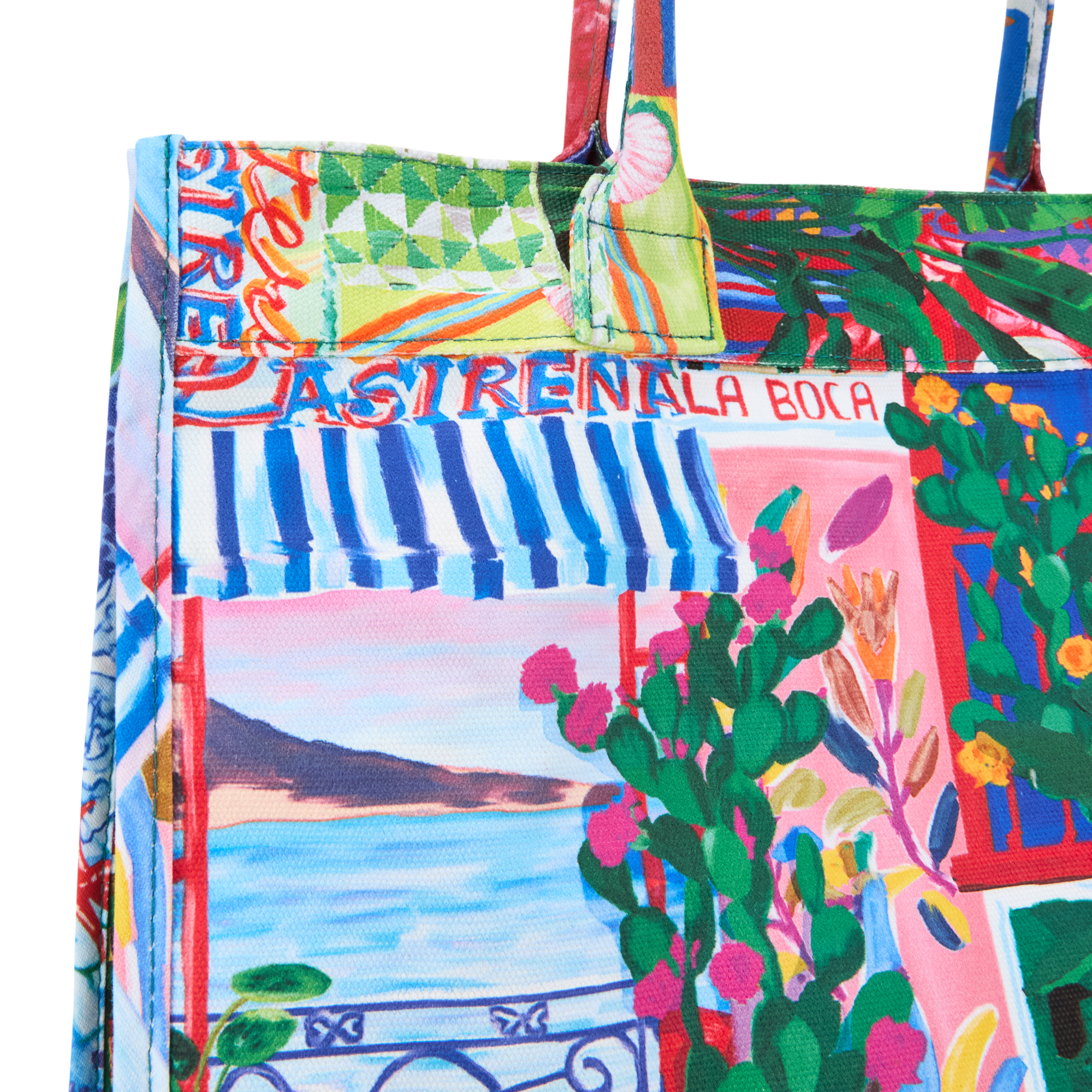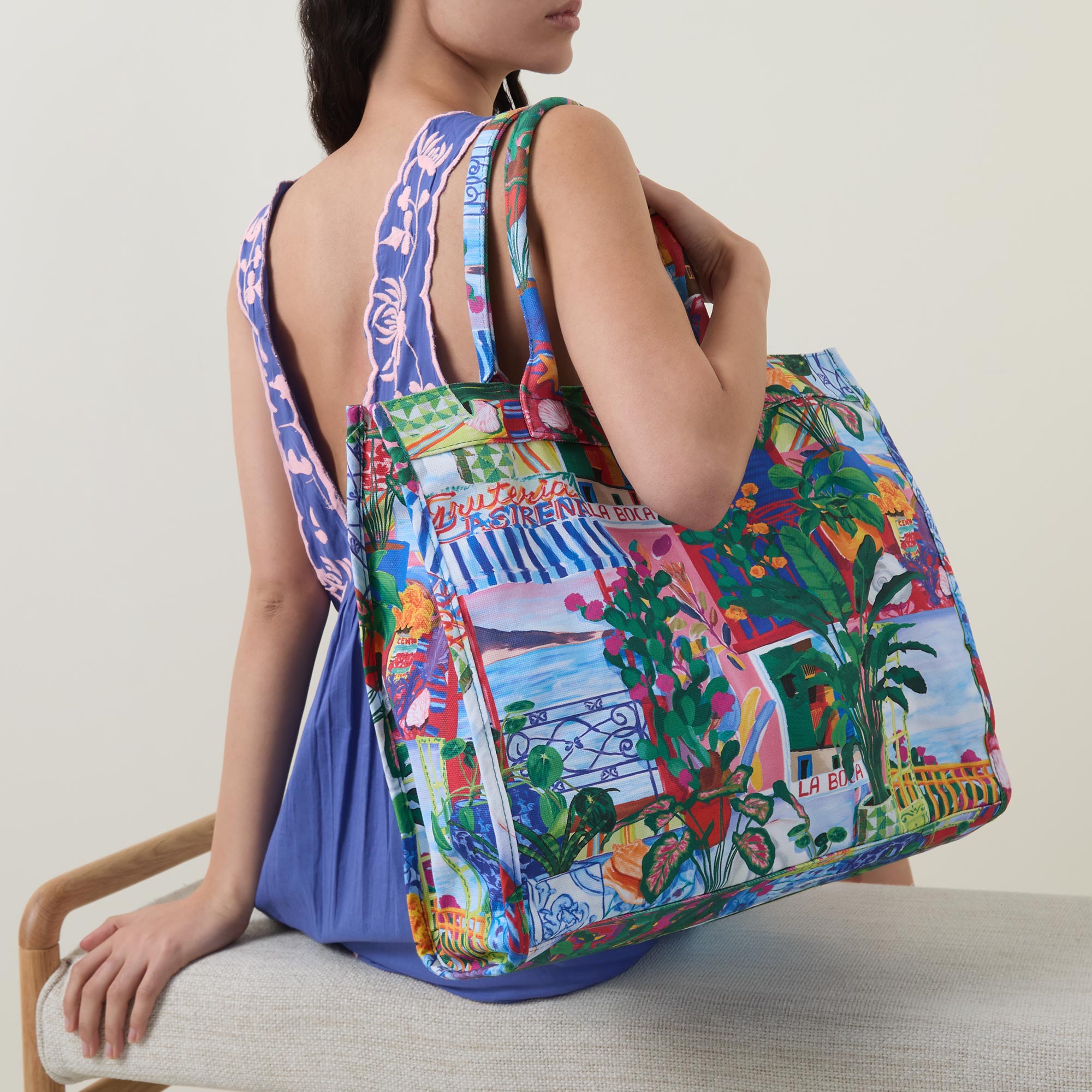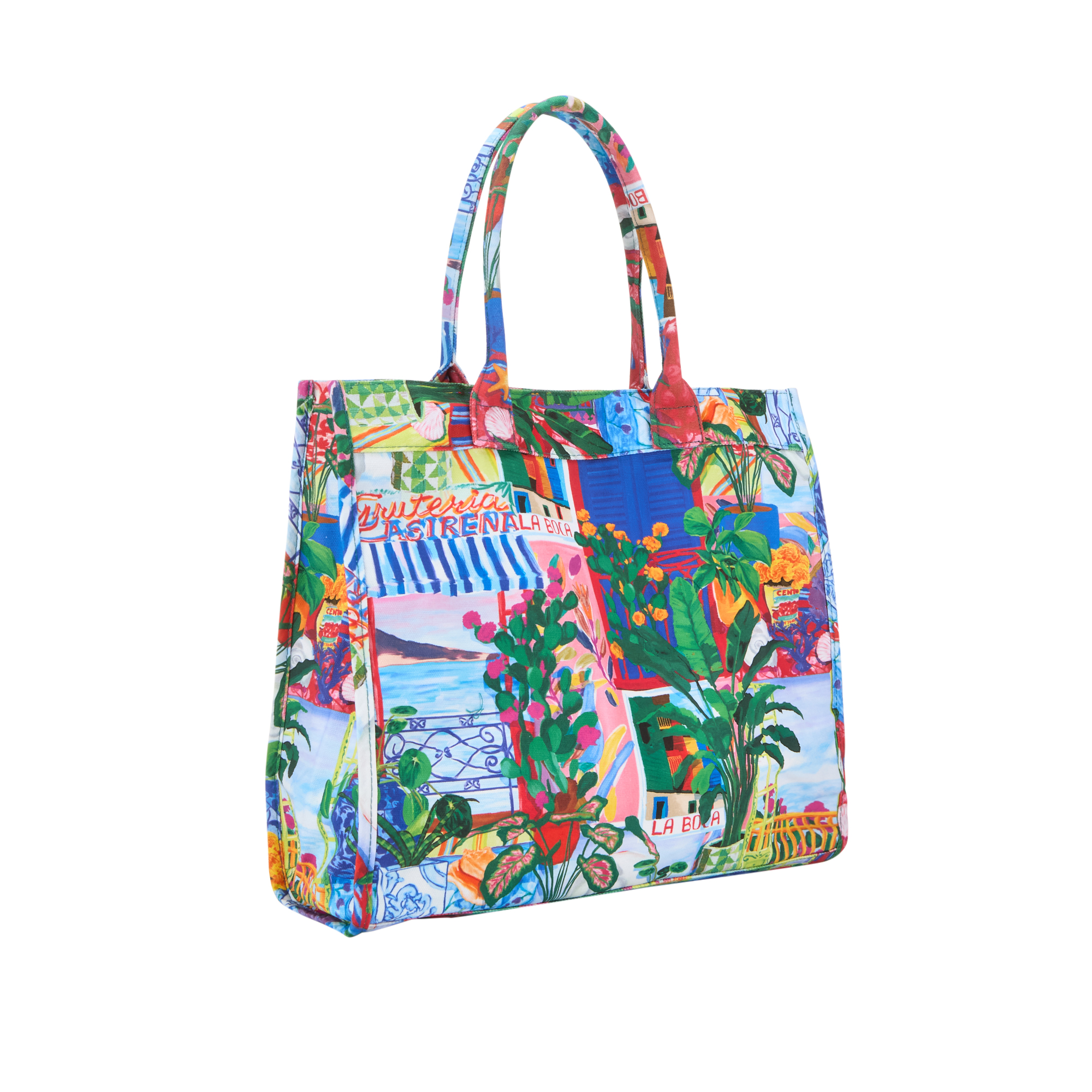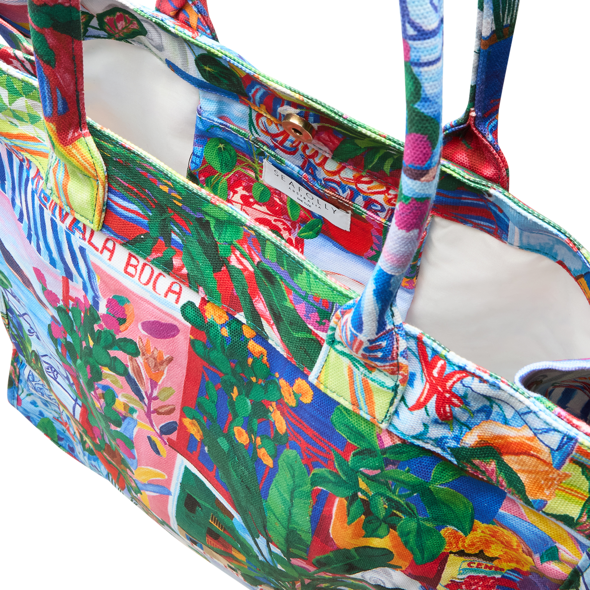 • Top handles, magnet clip closure, vibrant print, internal slip pocket, fully lined