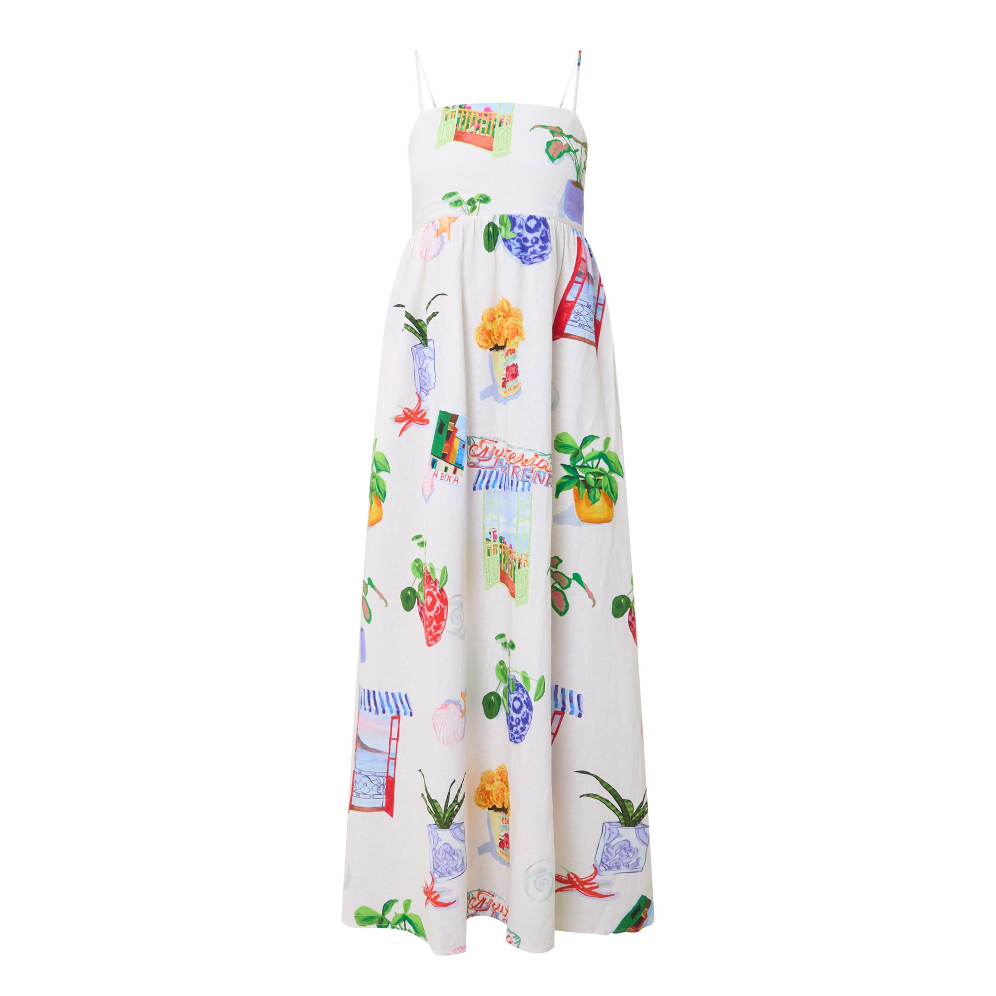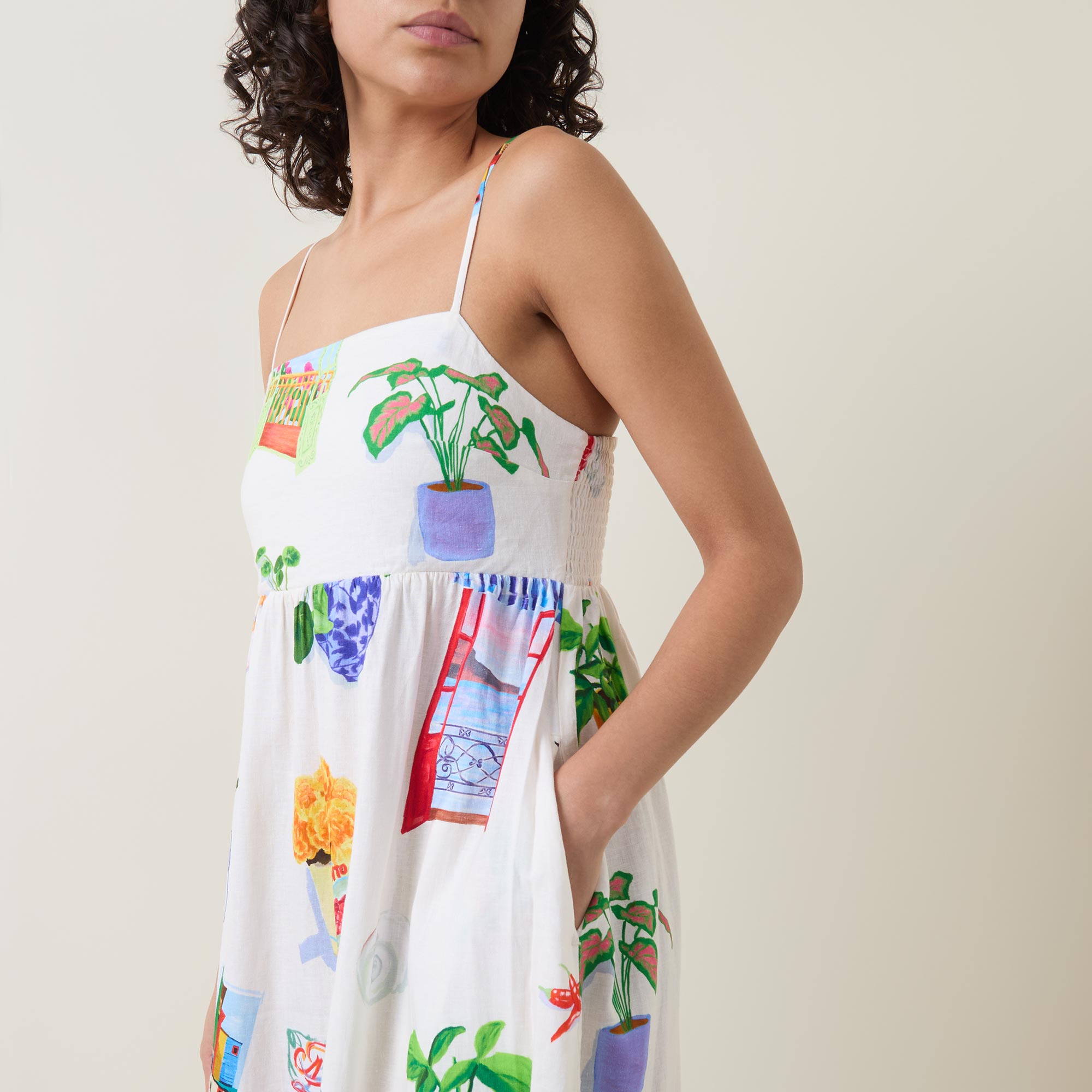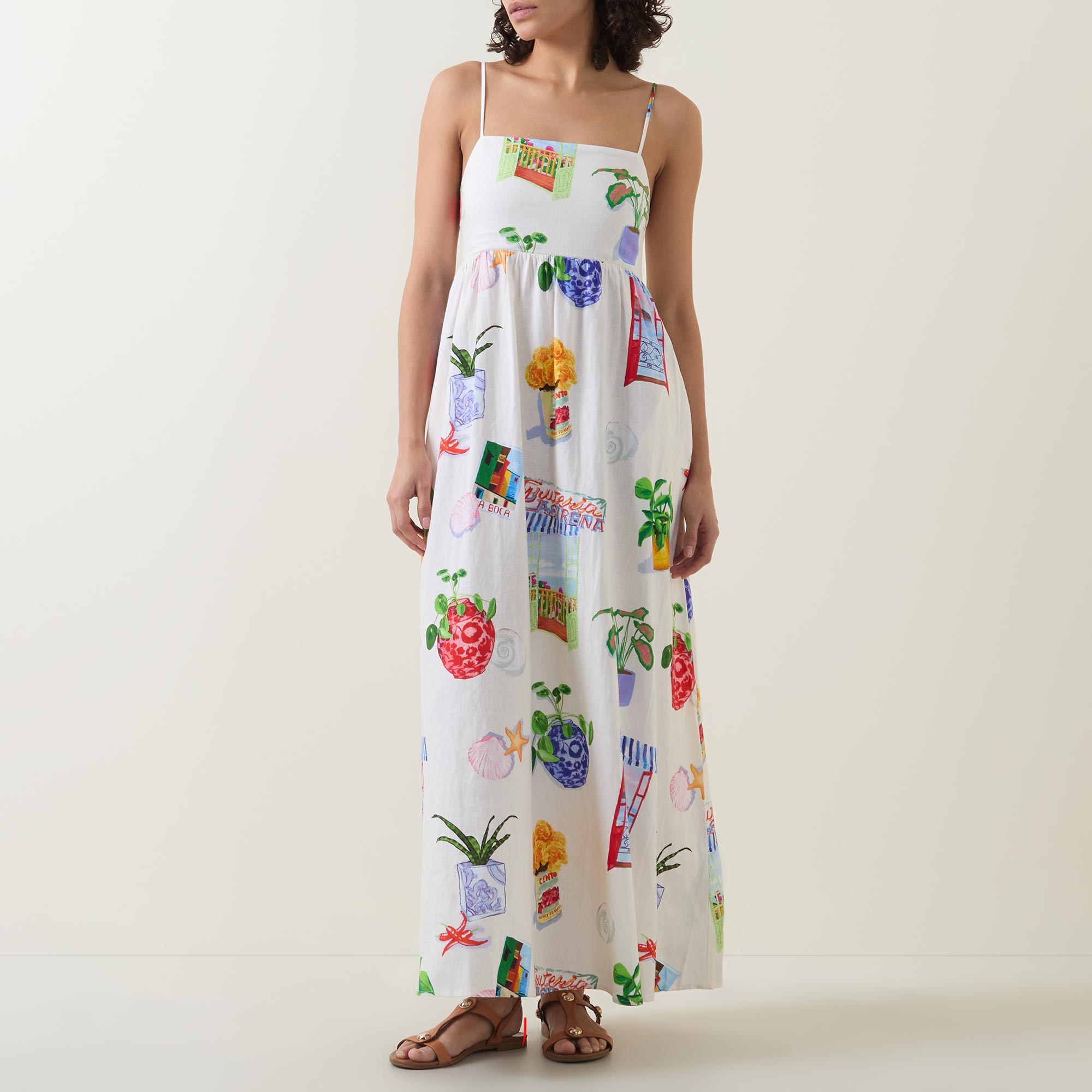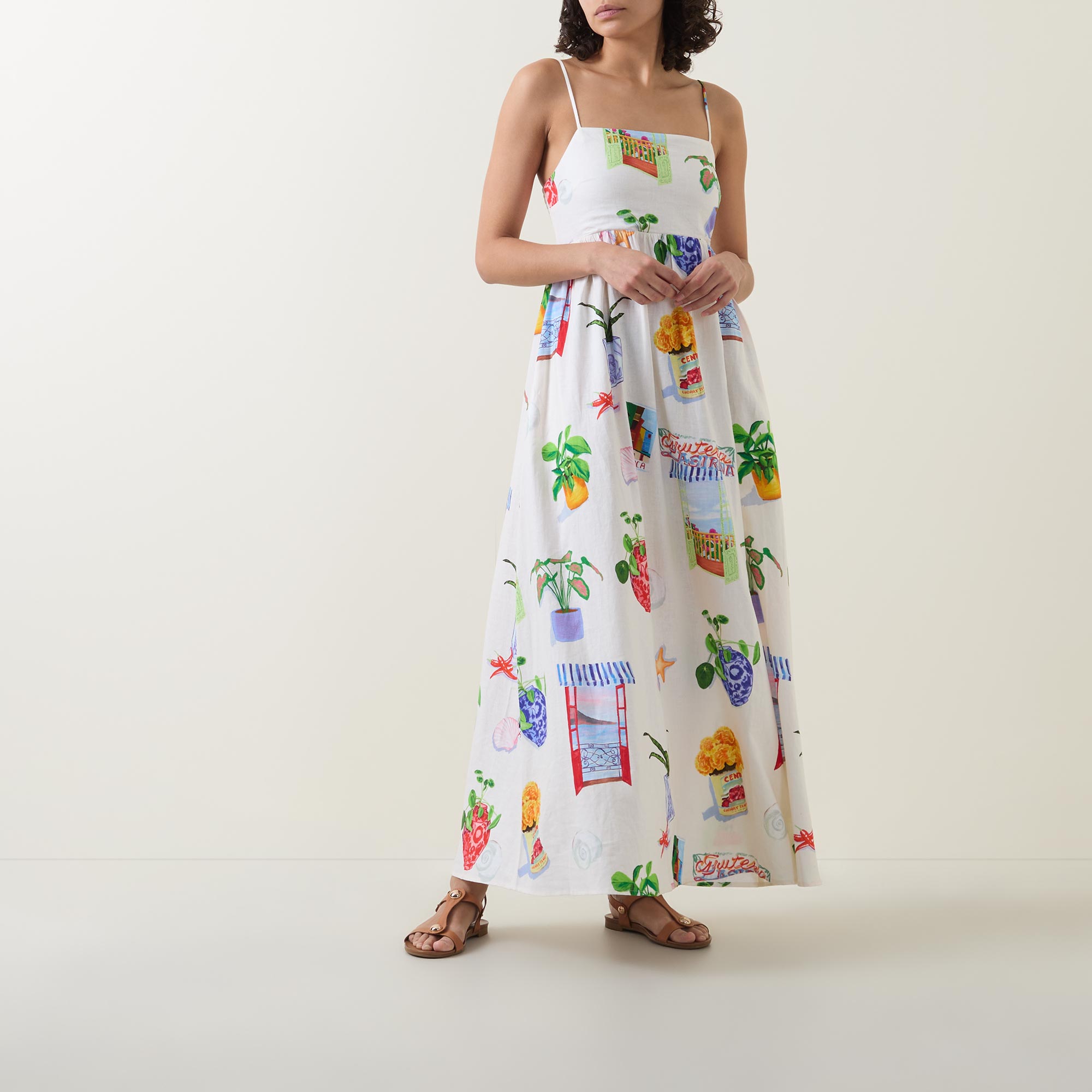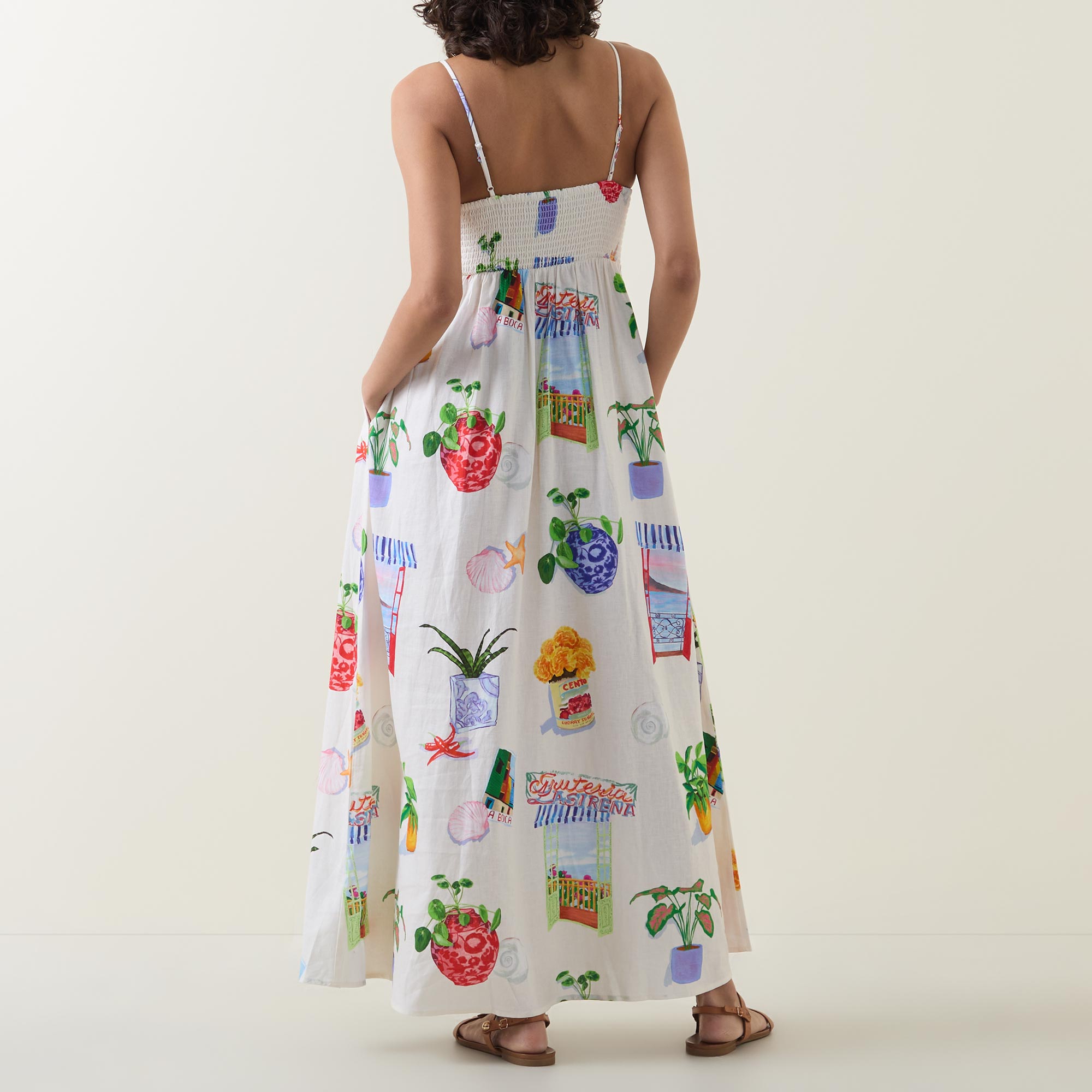 - Straight neckline, narrow adjustable straps, rear shirred design, two side entry pockets, full flared skirt, straight hem, La Boca print, maxi length