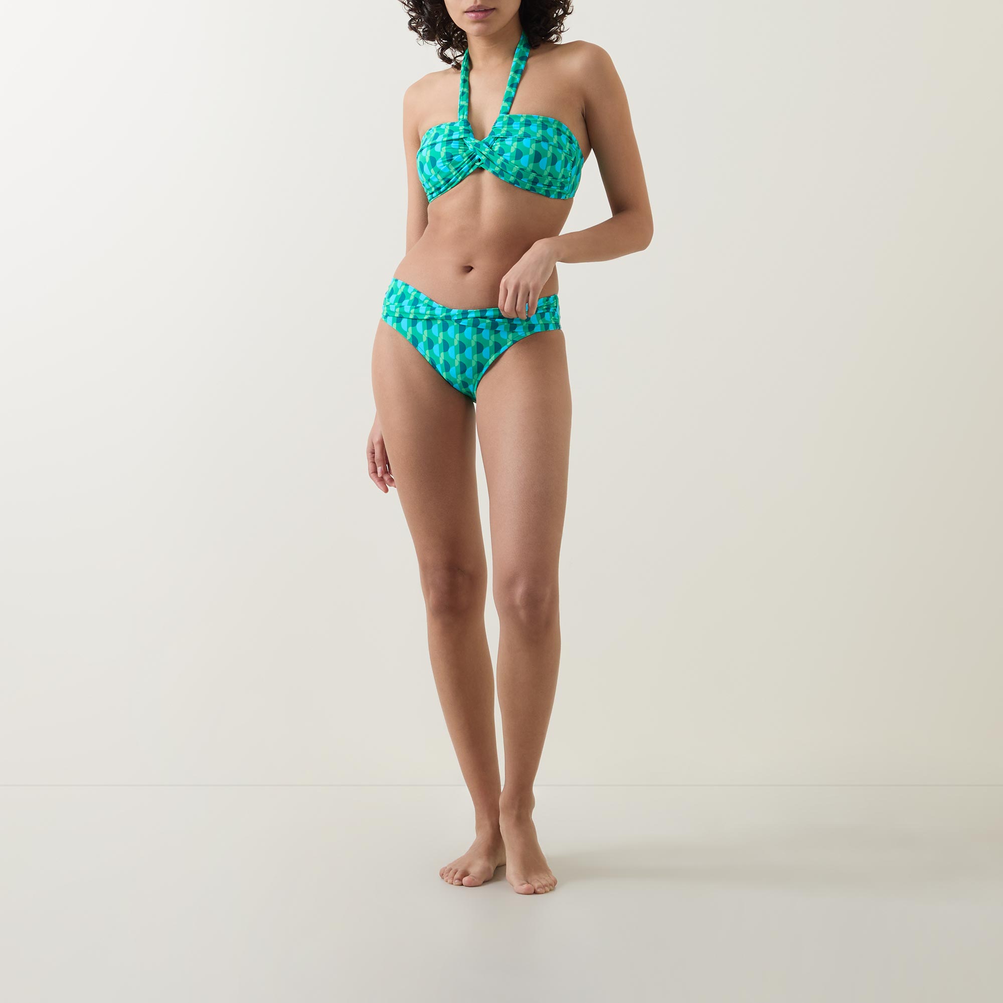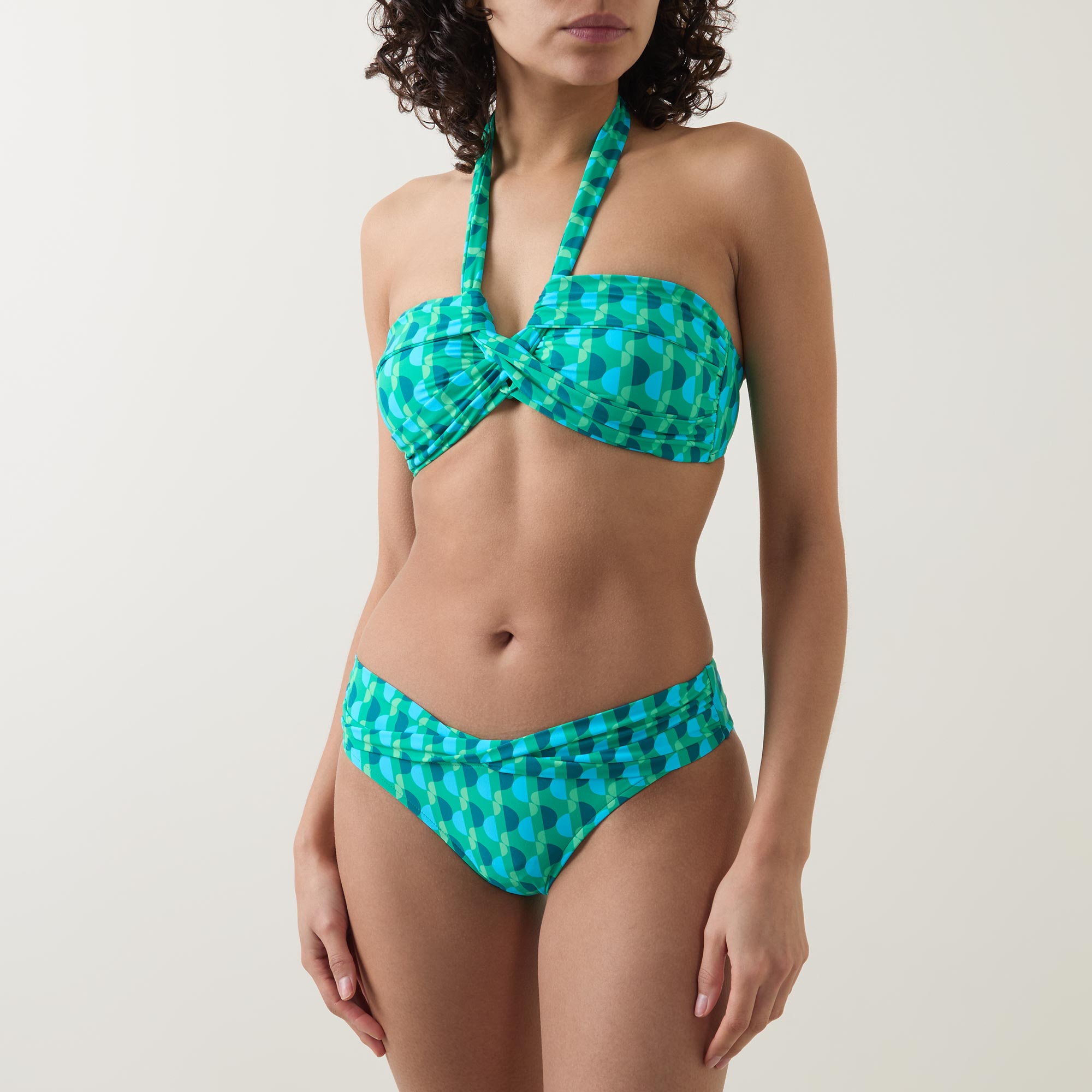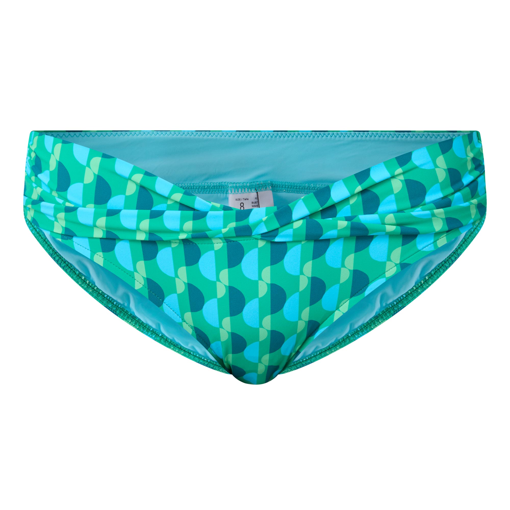 - Front twist detail, elasticated, mid-rise, graphic pattern, full rear coverage, smooth seamless finish