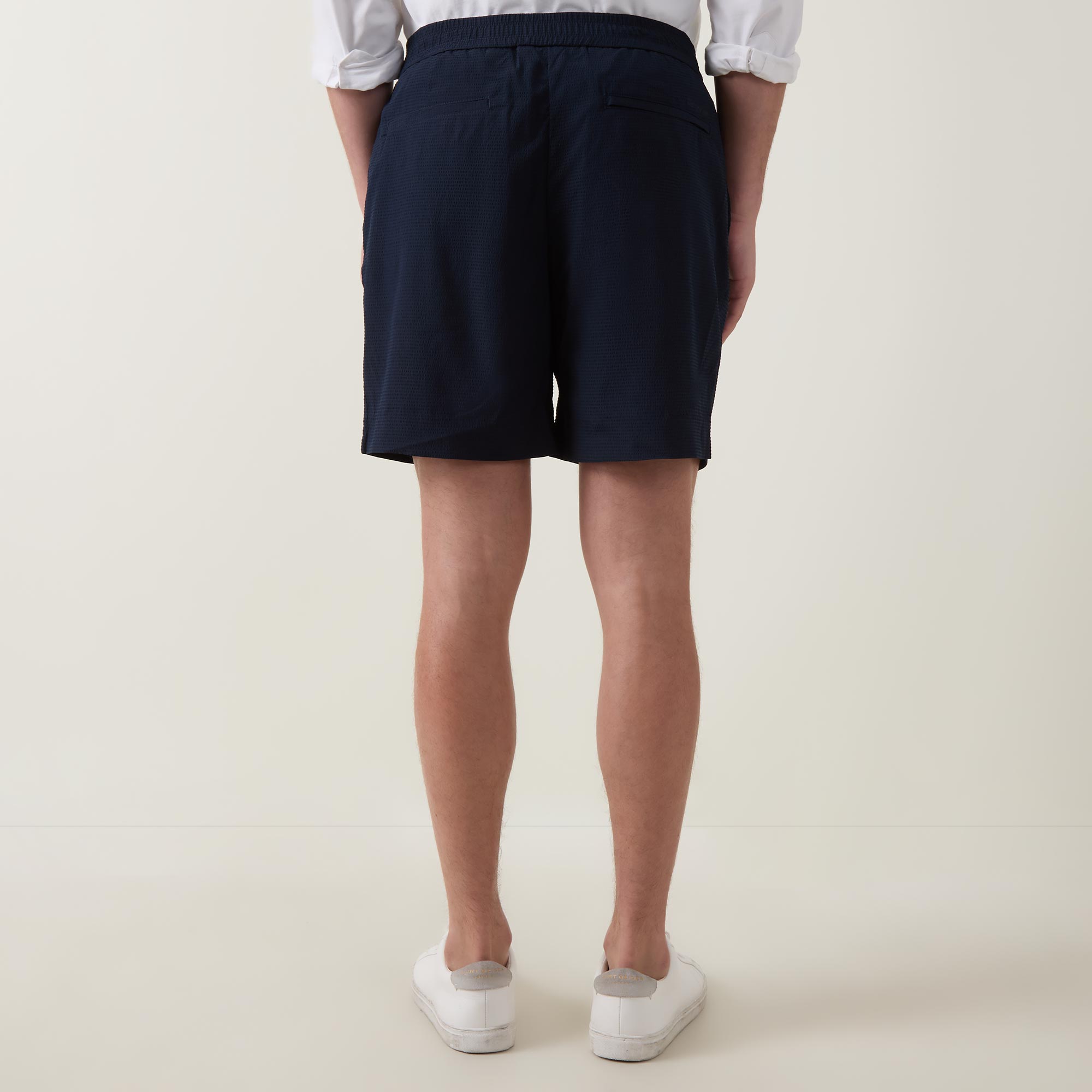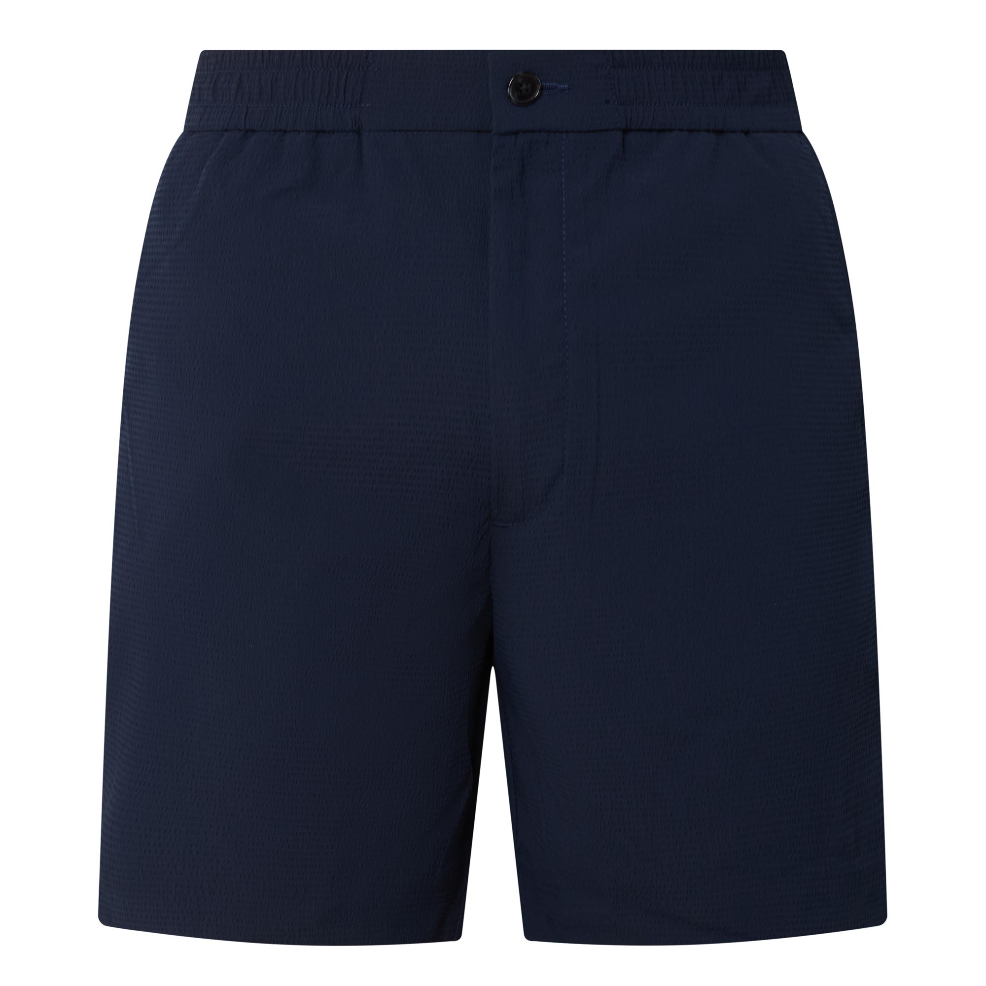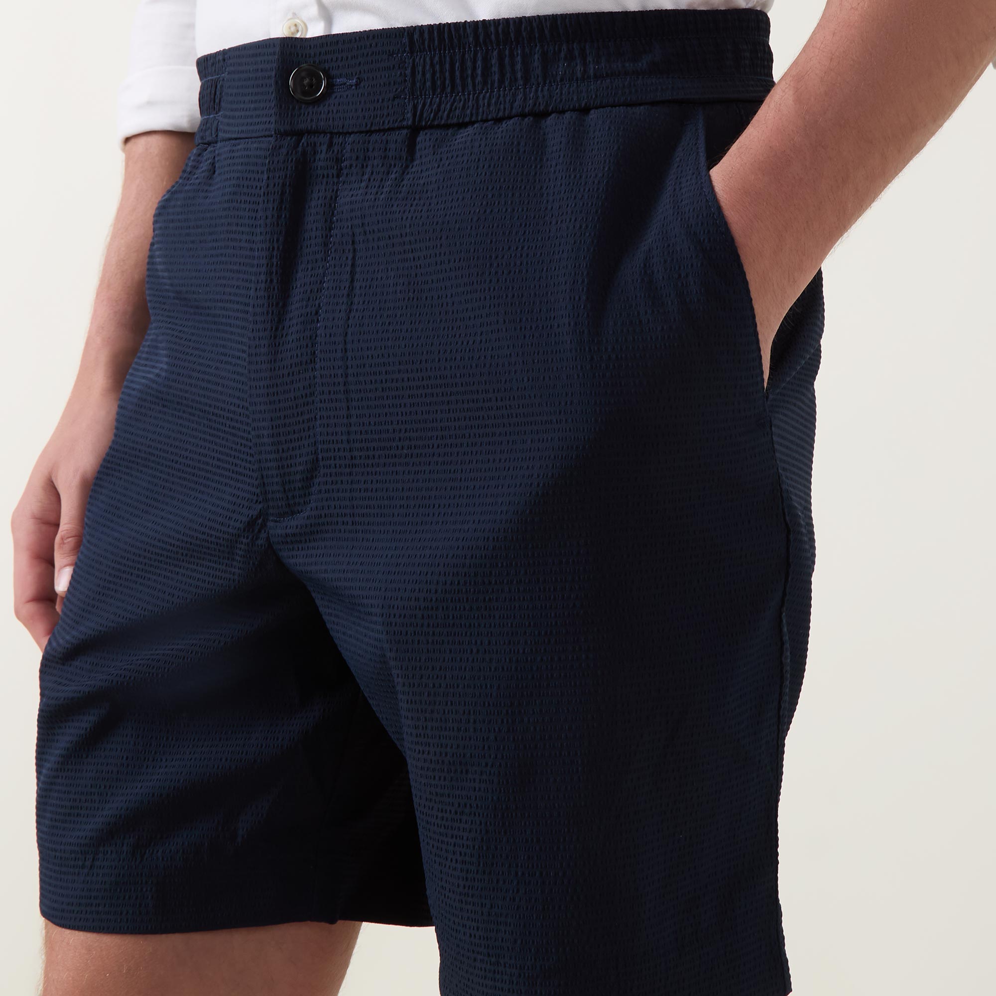 - Button and fly zip fastening, elasticated waistband, side entry pockets, rear welt pockets, logo detail, seersucker textured fabric