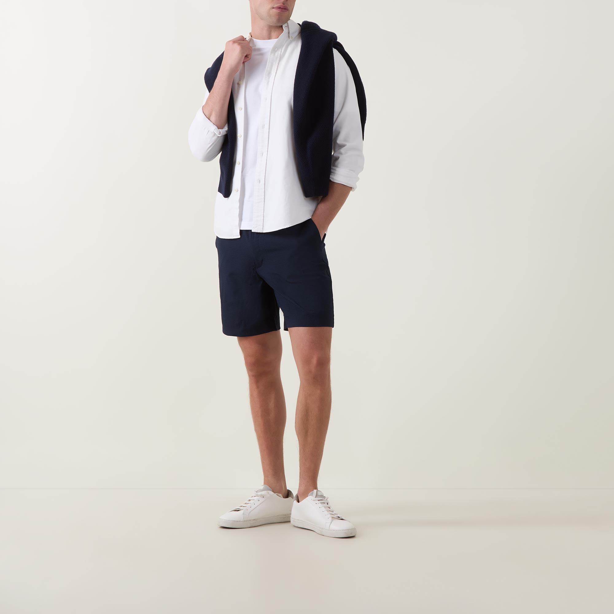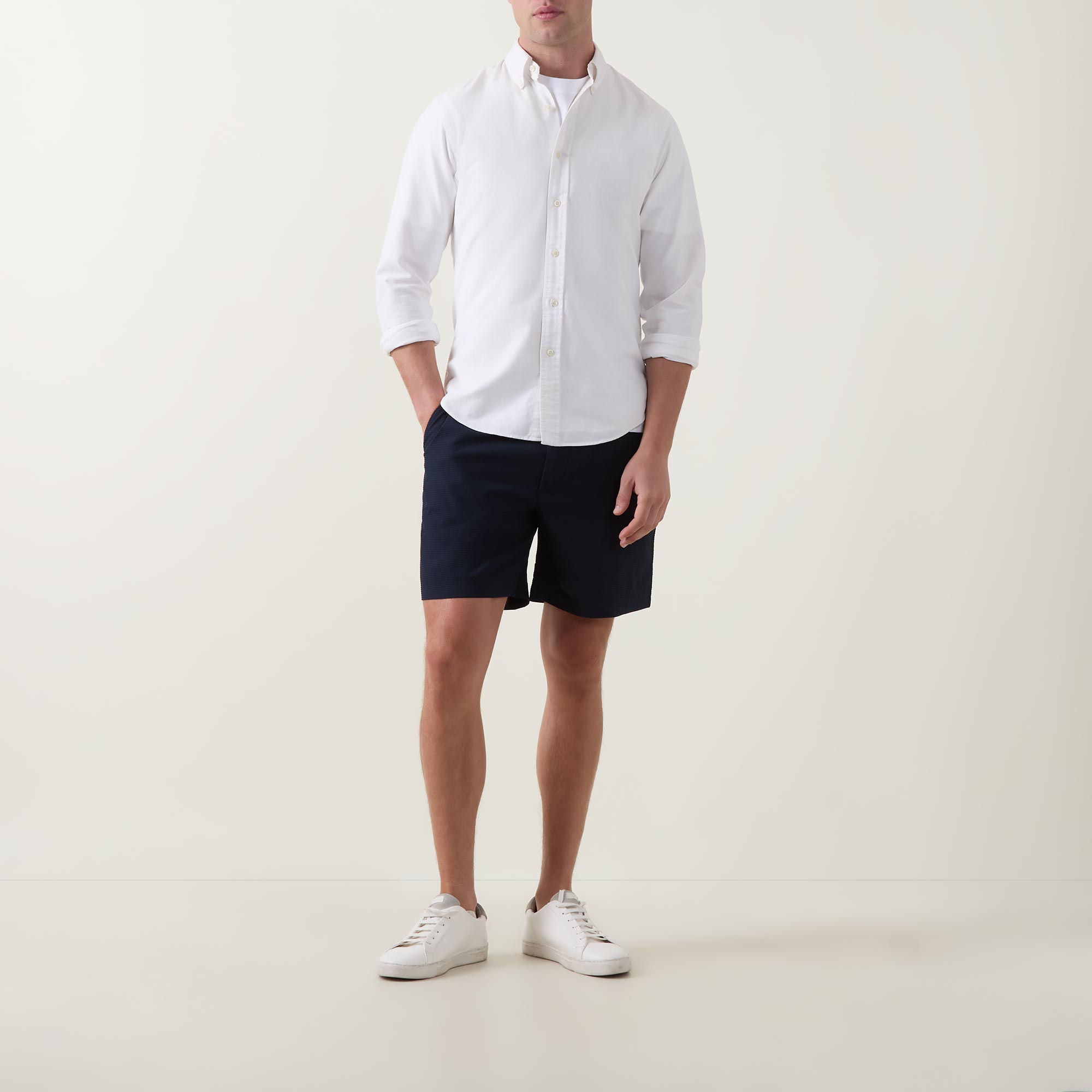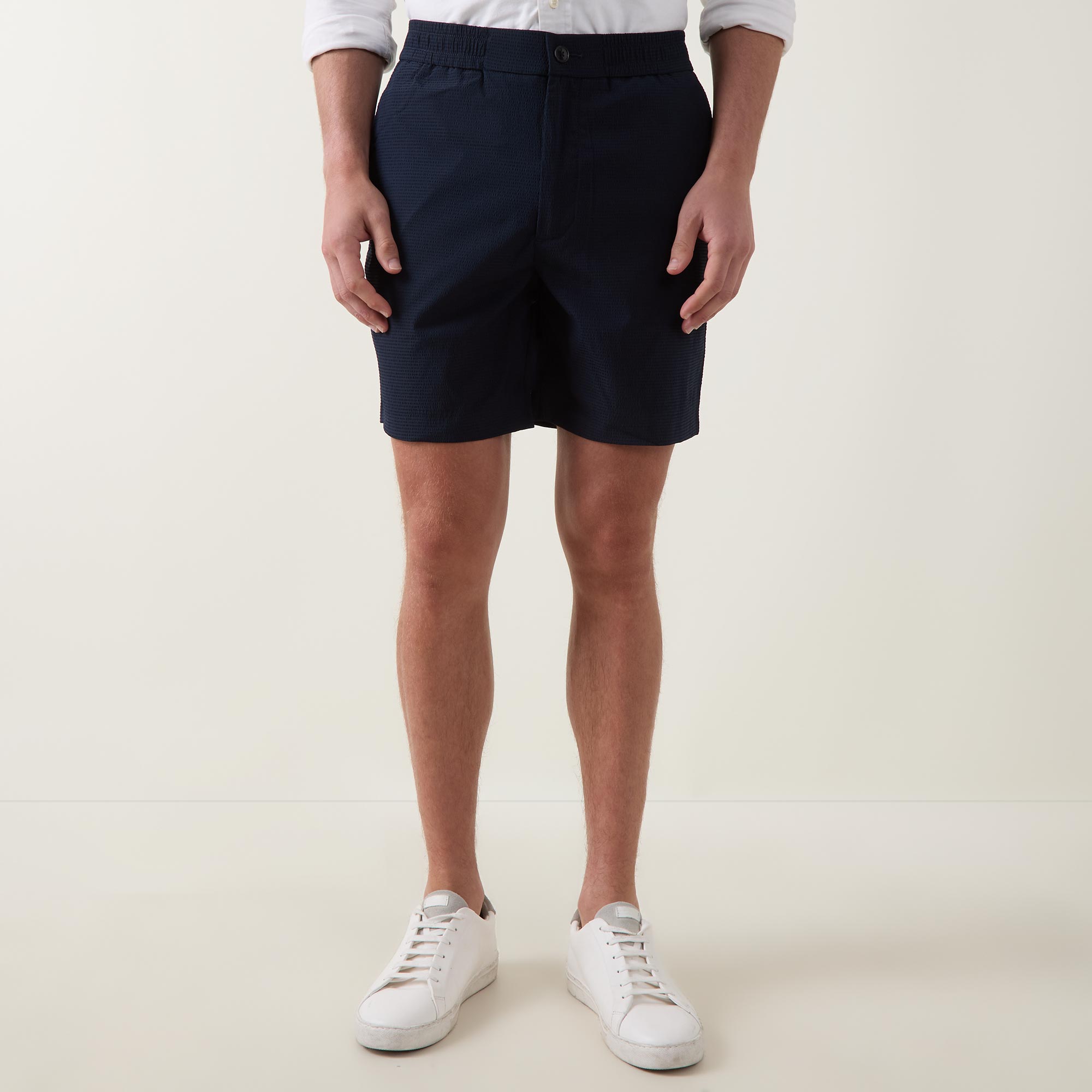 - Button and fly zip fastening, elasticated waistband, side entry pockets, rear welt pockets, logo detail, seersucker textured fabric