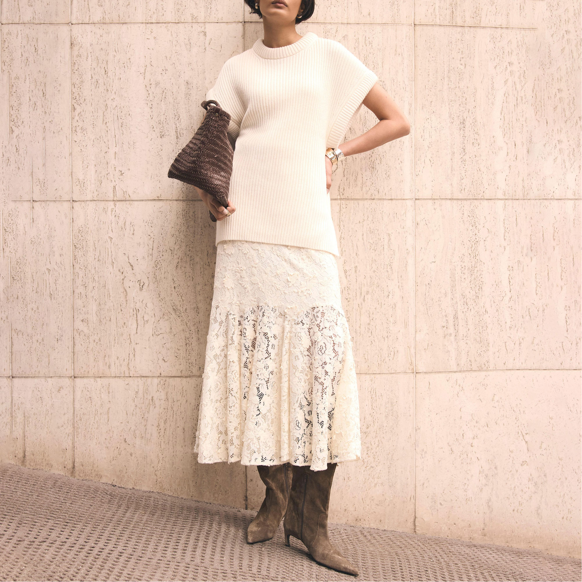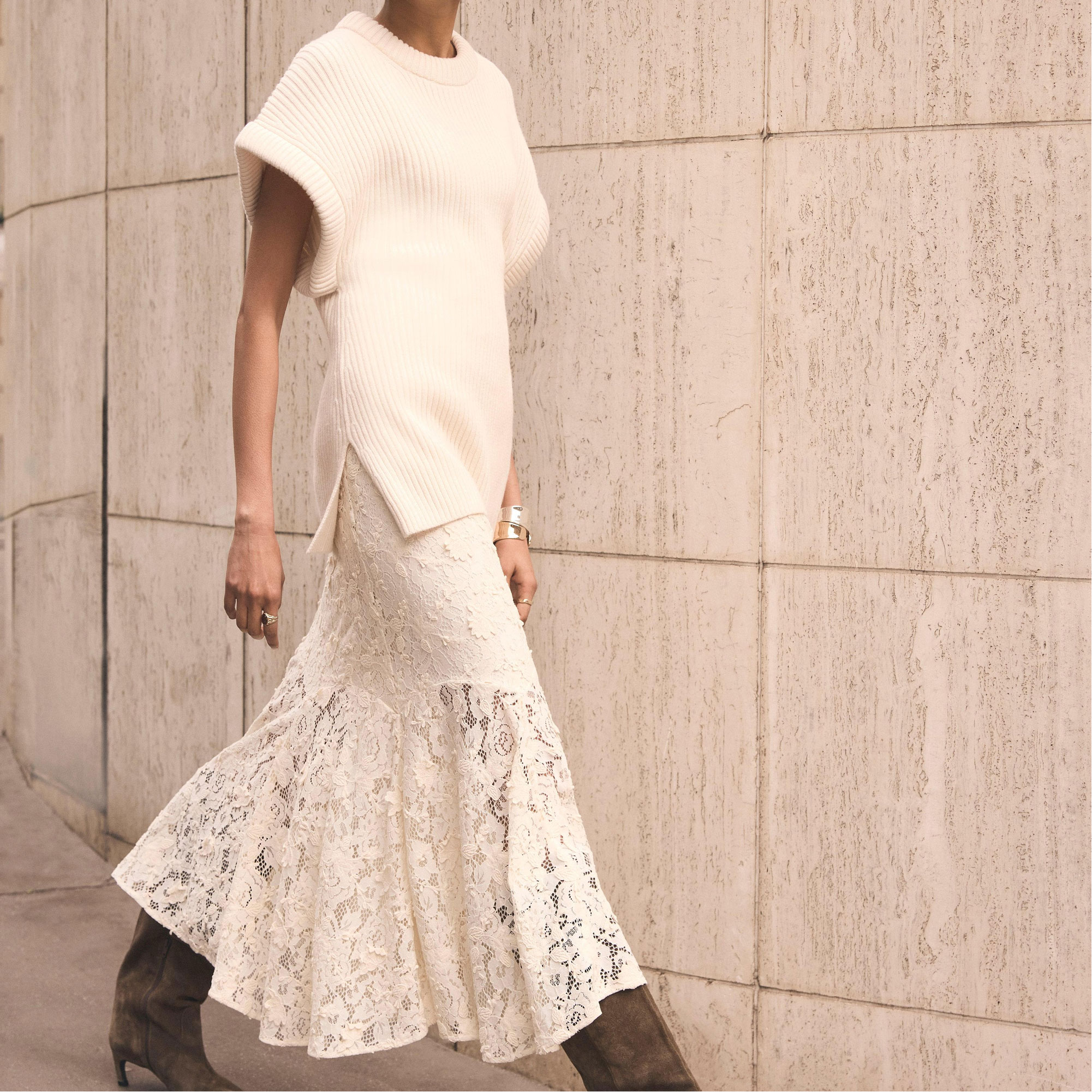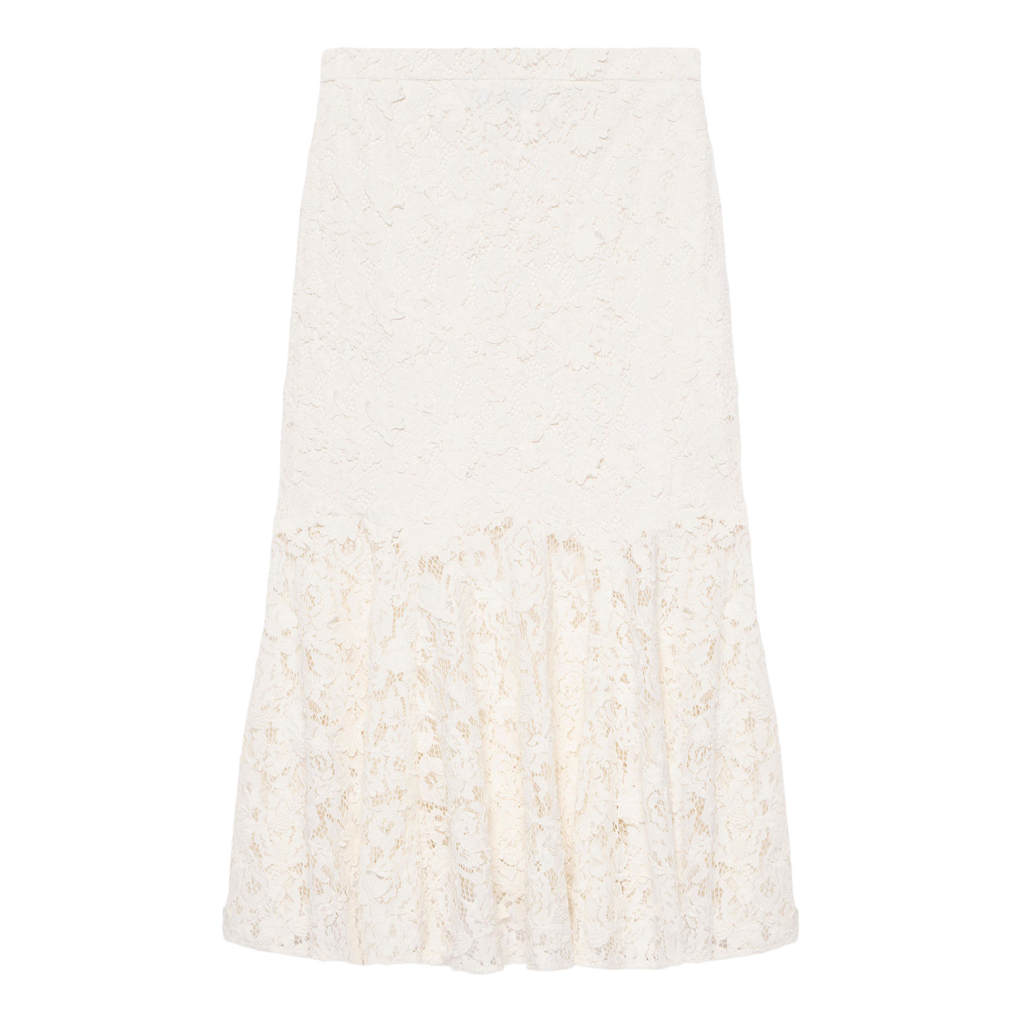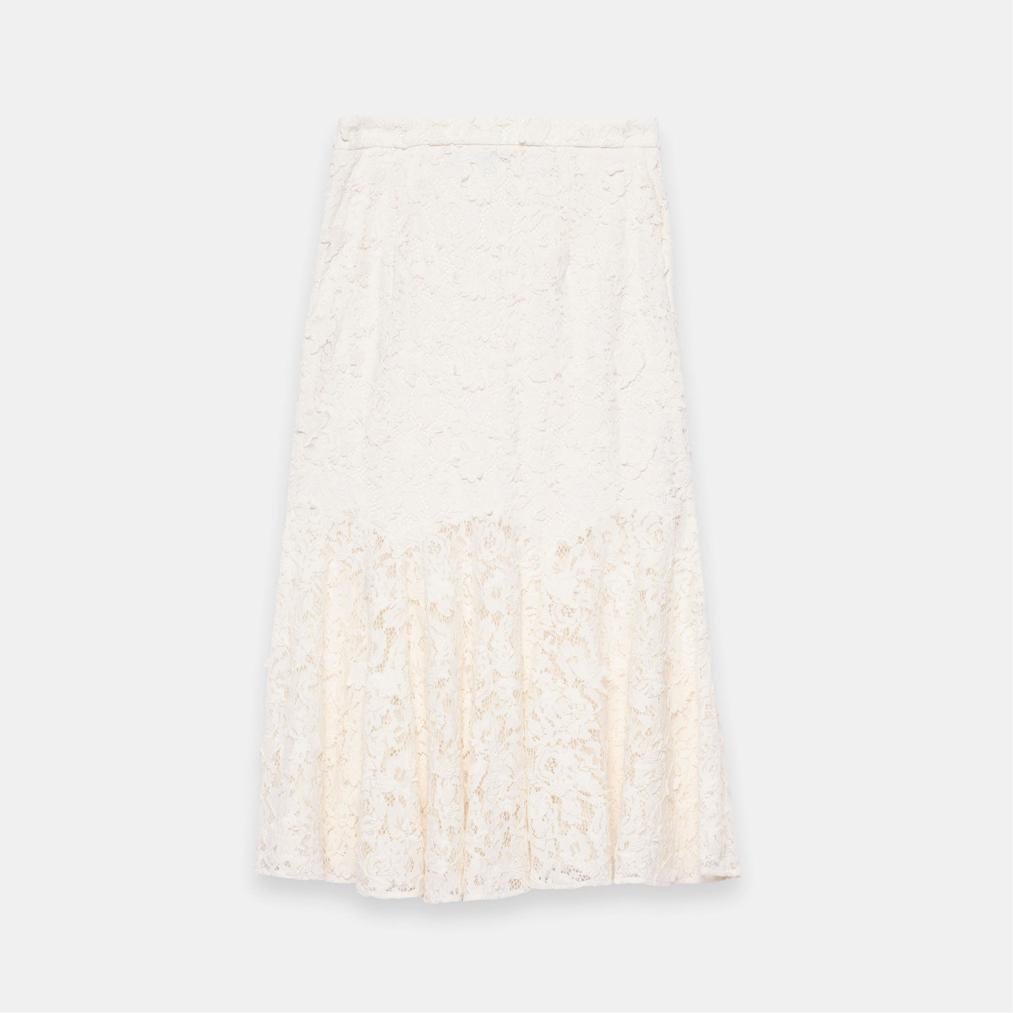 - Lace fabric, midi silhouette, godet hemline, zip fastening