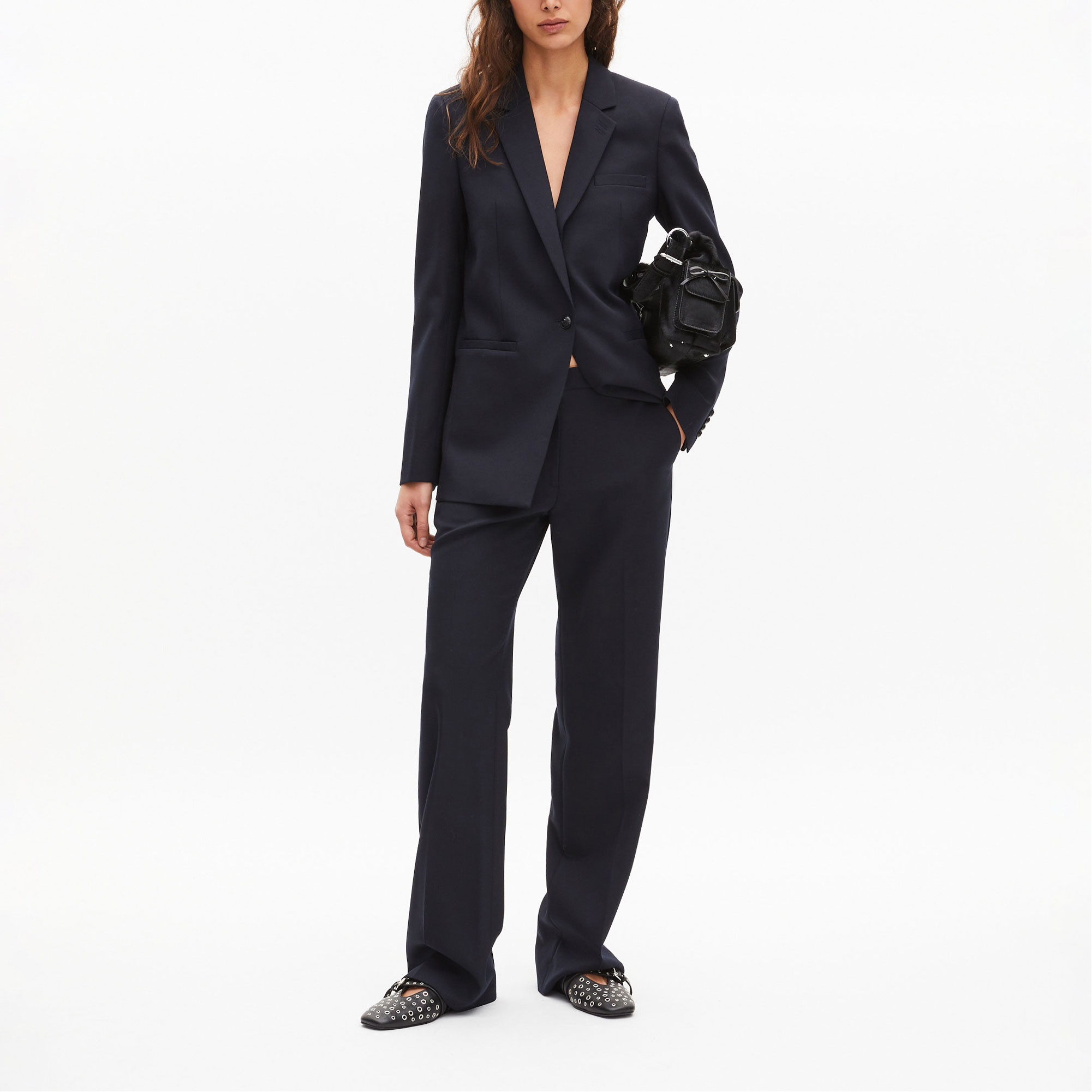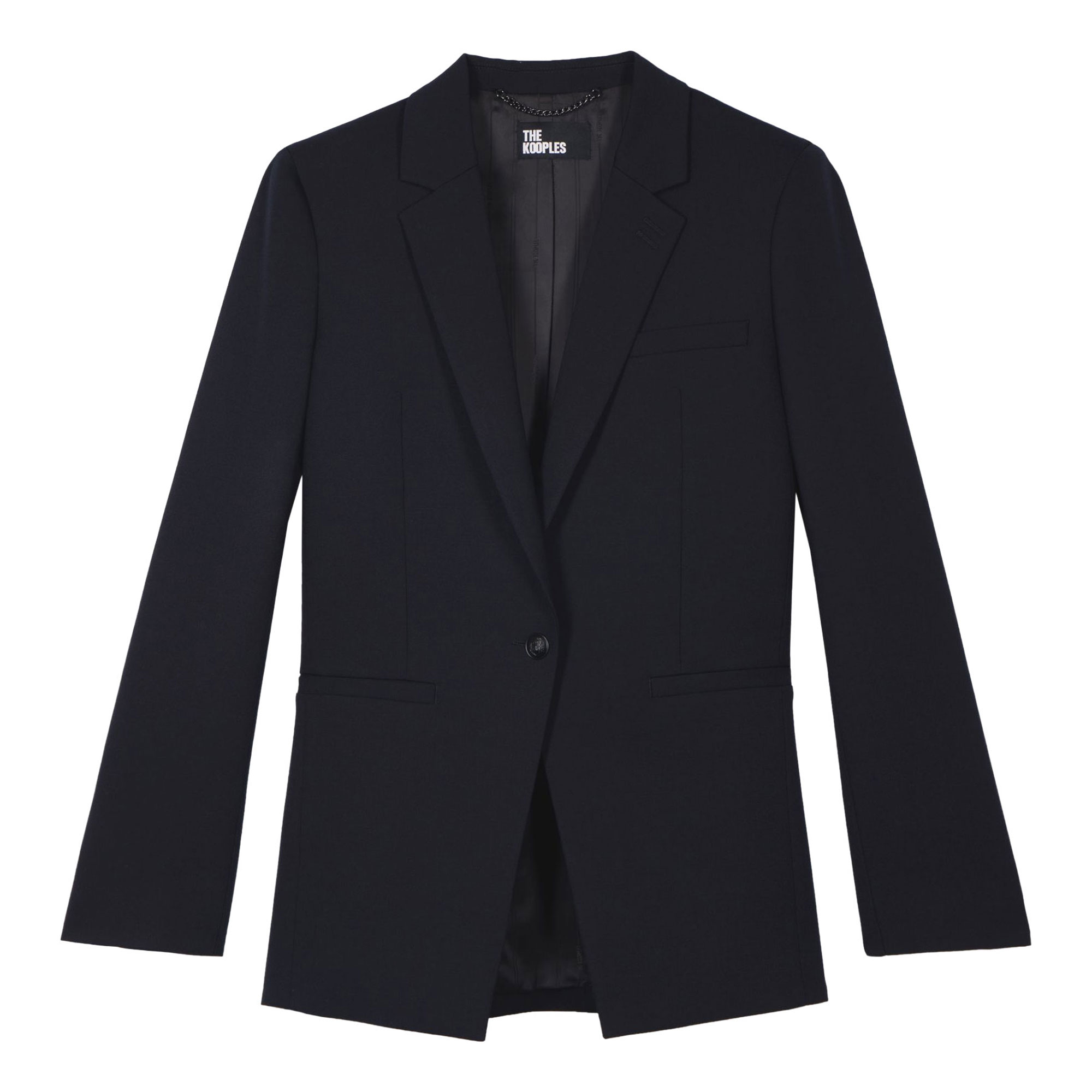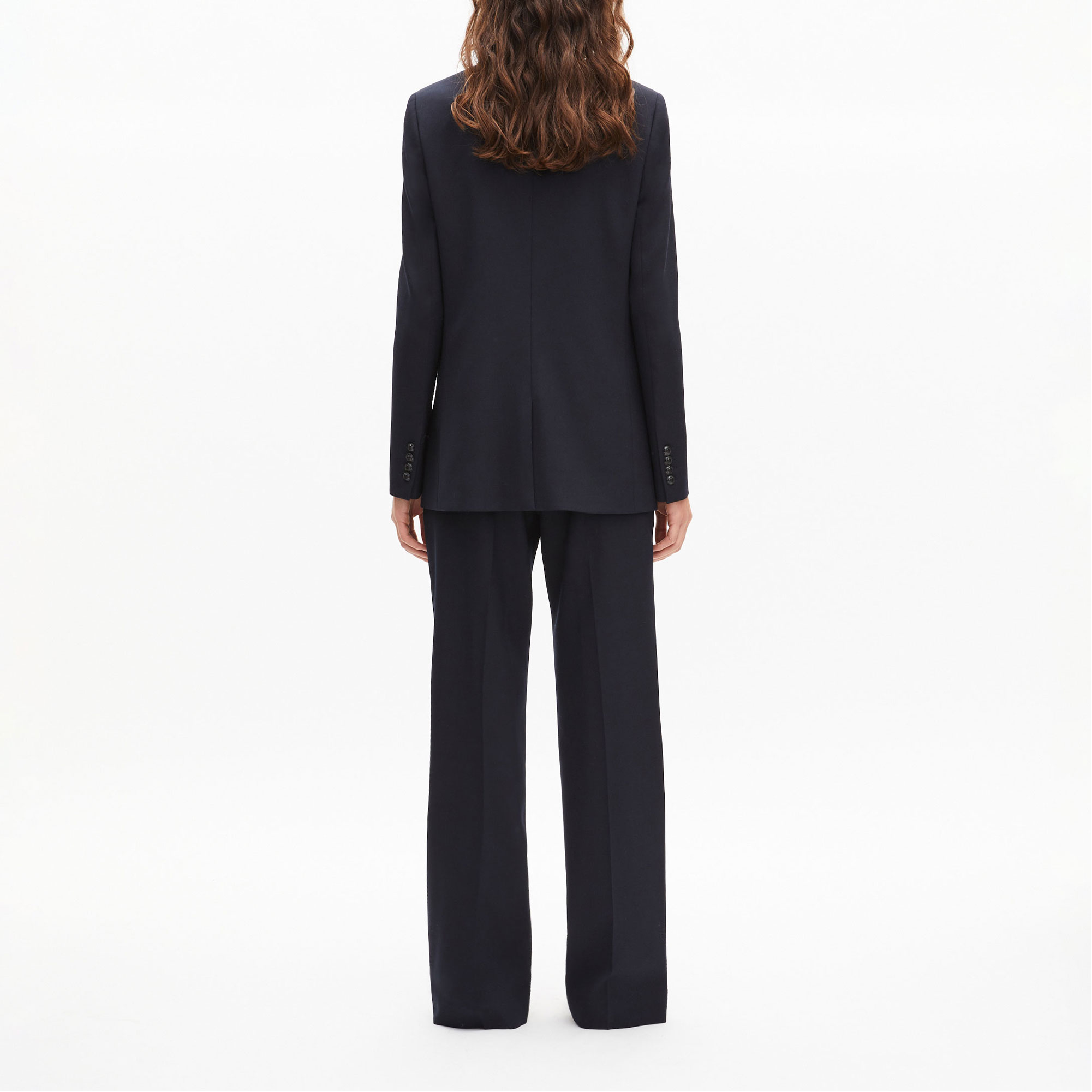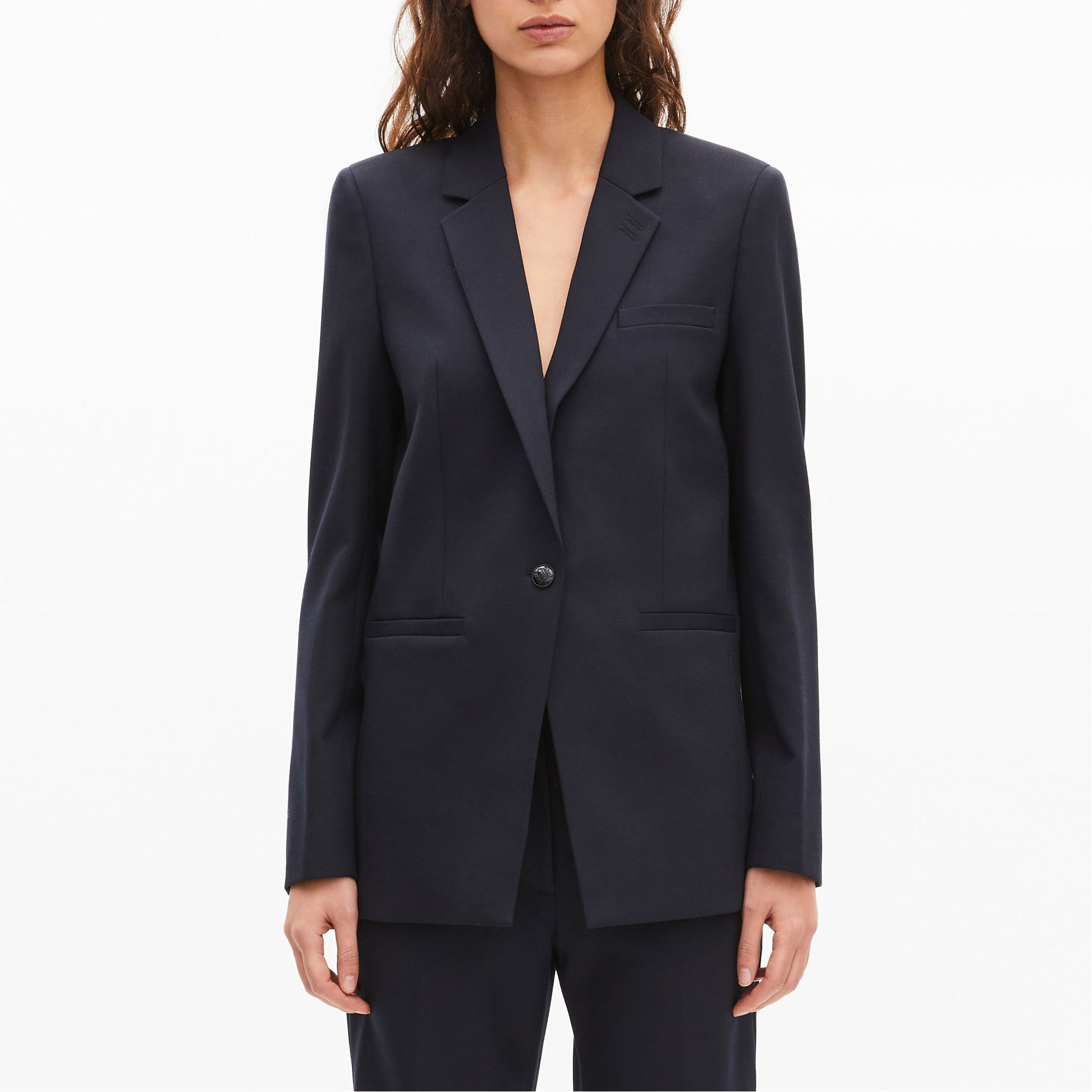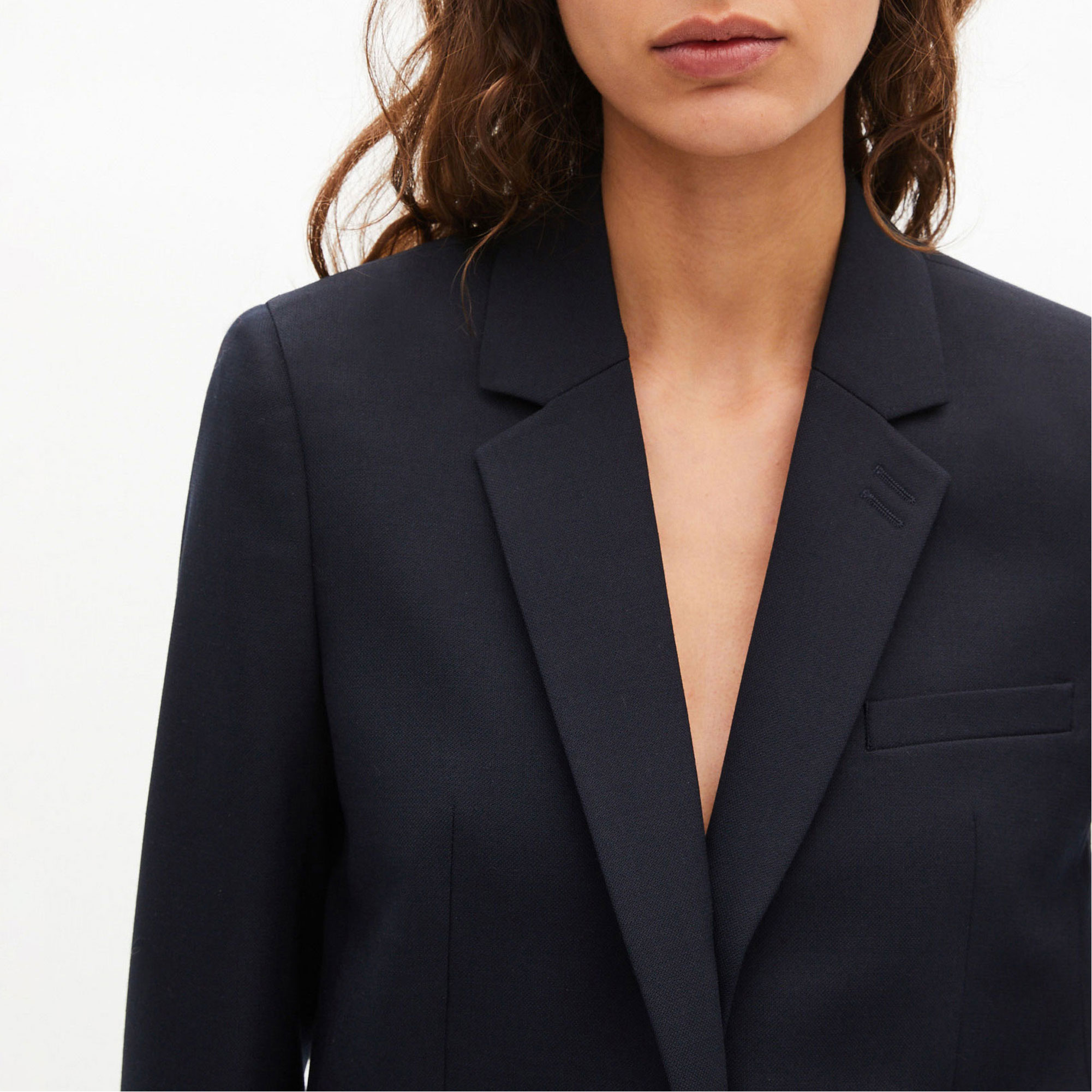 • Straight cut, notched collar, single-breasted closure, piped pockets