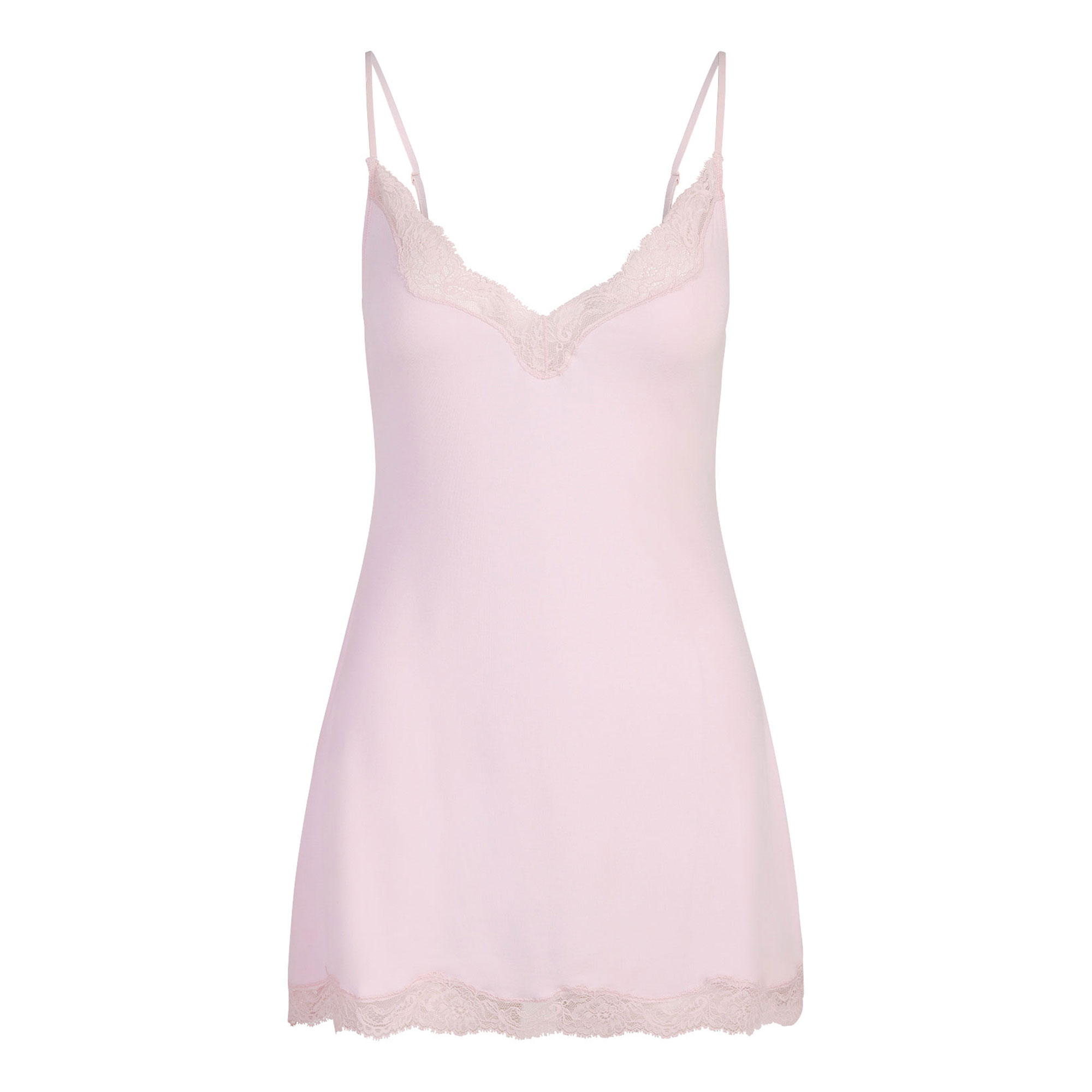 A mini made for dreamy nights. This ultra-soft dress from SKIMS features a scoop neckline, adjustable straps, and lace trim at the neckline and hem for a flirty touch.