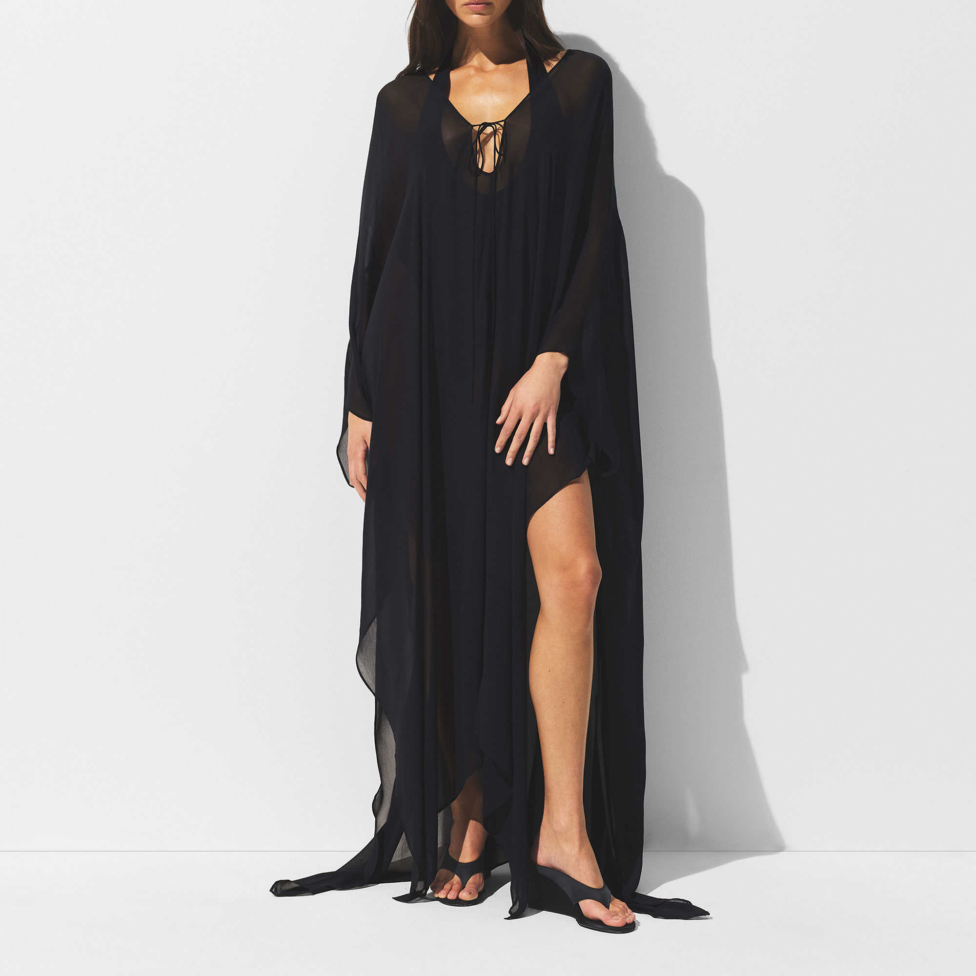 Effortless and elevated. This long kaftan cover-up from SKIMS is made with sheer, lightweight viscose for a luxe layered statement. Features a deep plunge neckline, centre tie, and side openings.