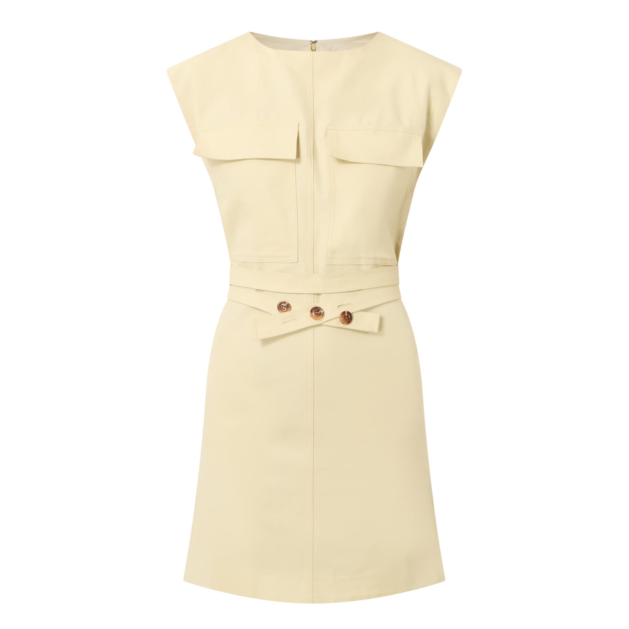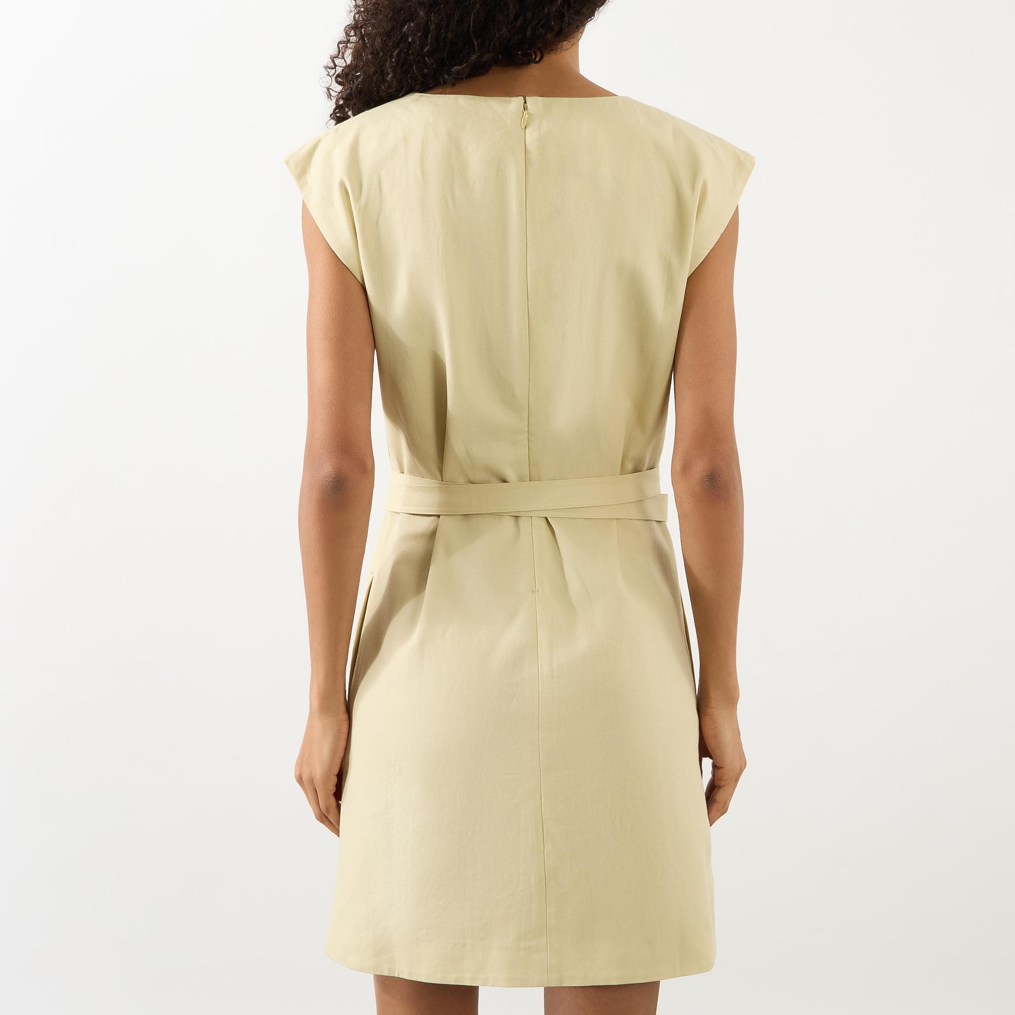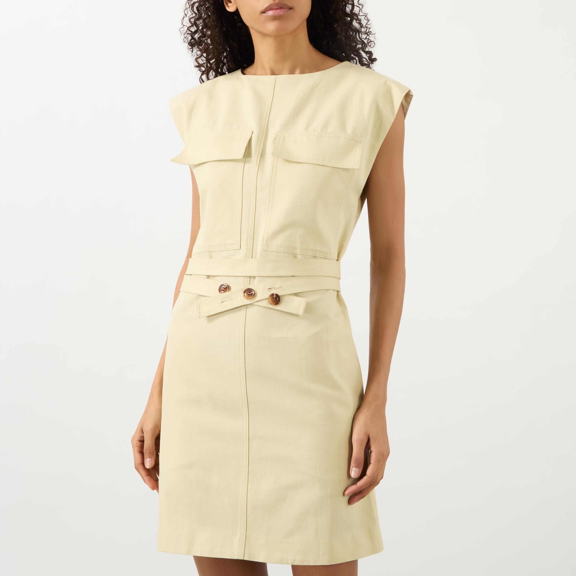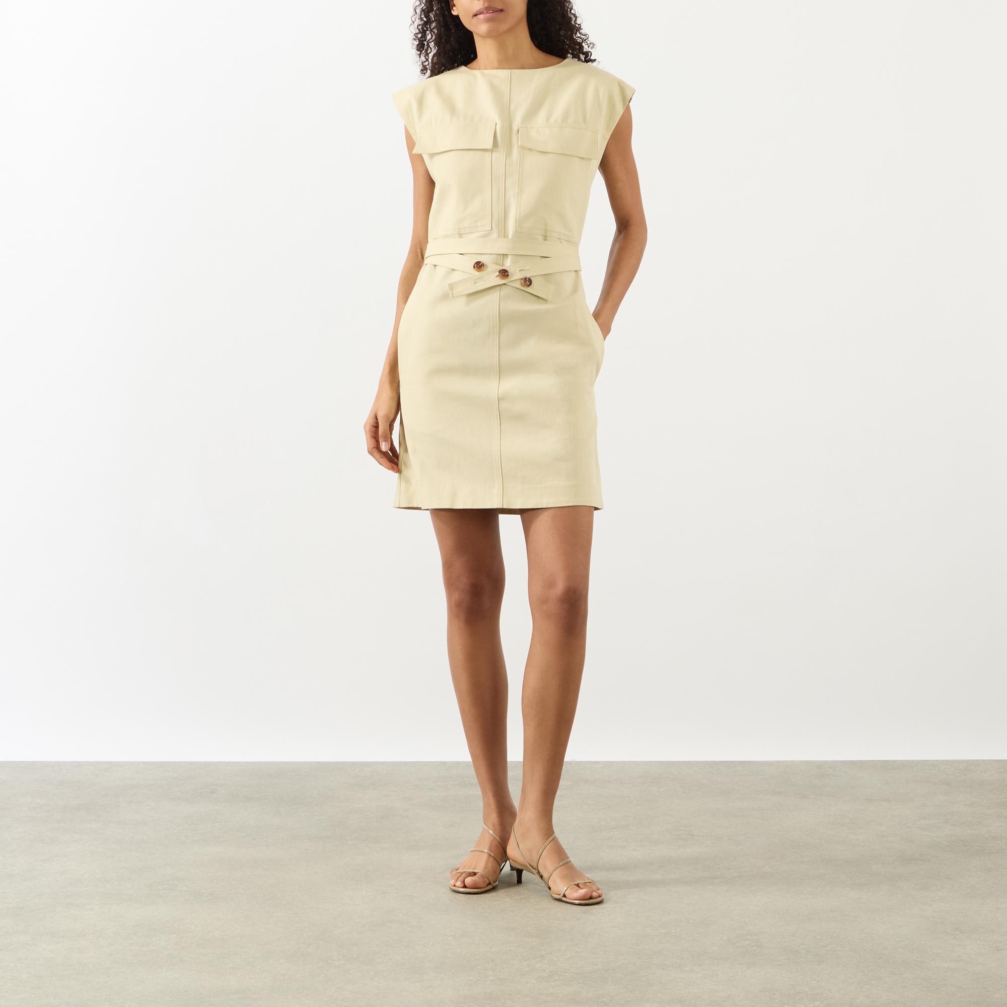 - Round neckline, cap sleeves, rear zip fastening, two chest flap pockets, two side entry pockets, detachable belt fastening, wrap-around design, fitted through the waist, straight hem, tonal stitching, mini length, denim finish
