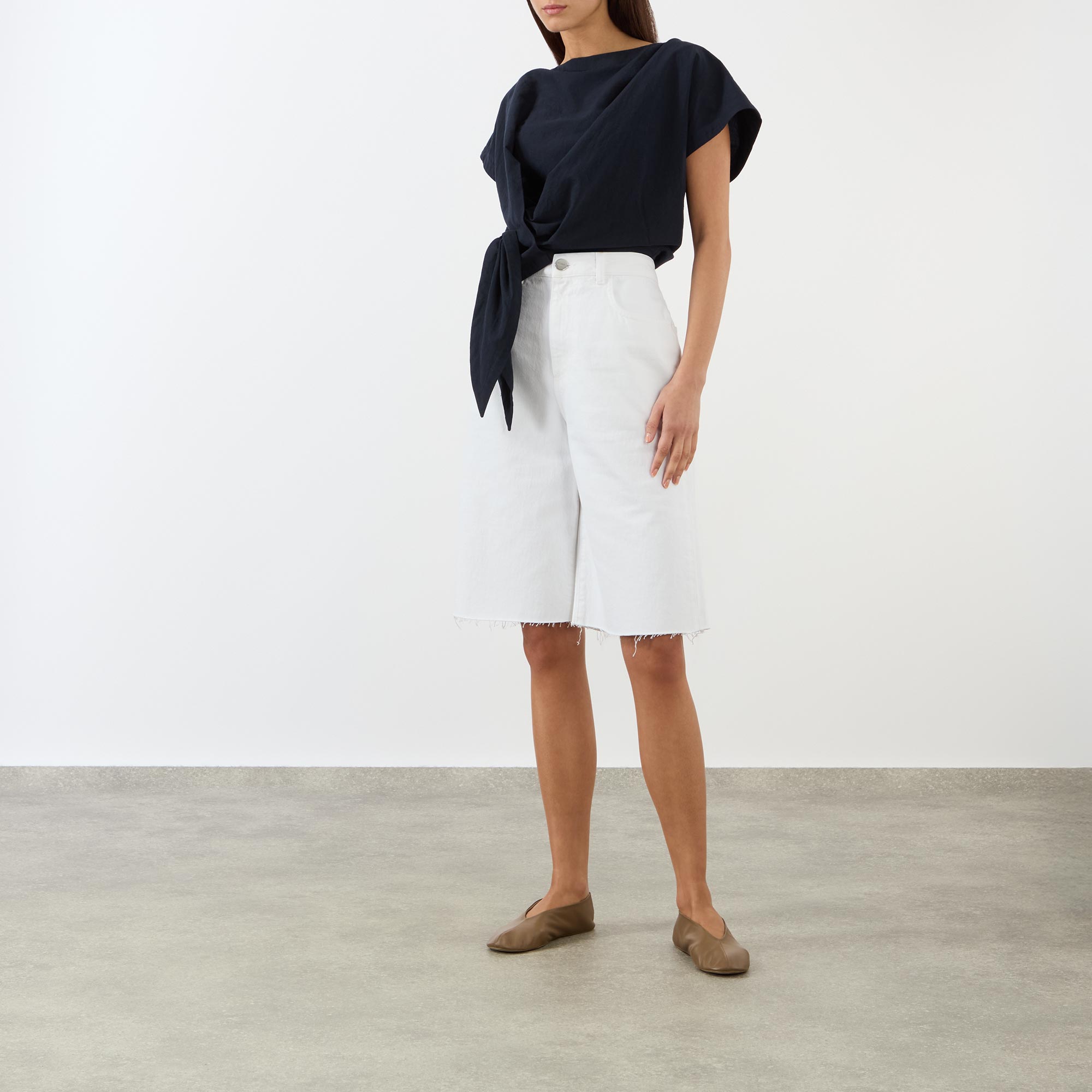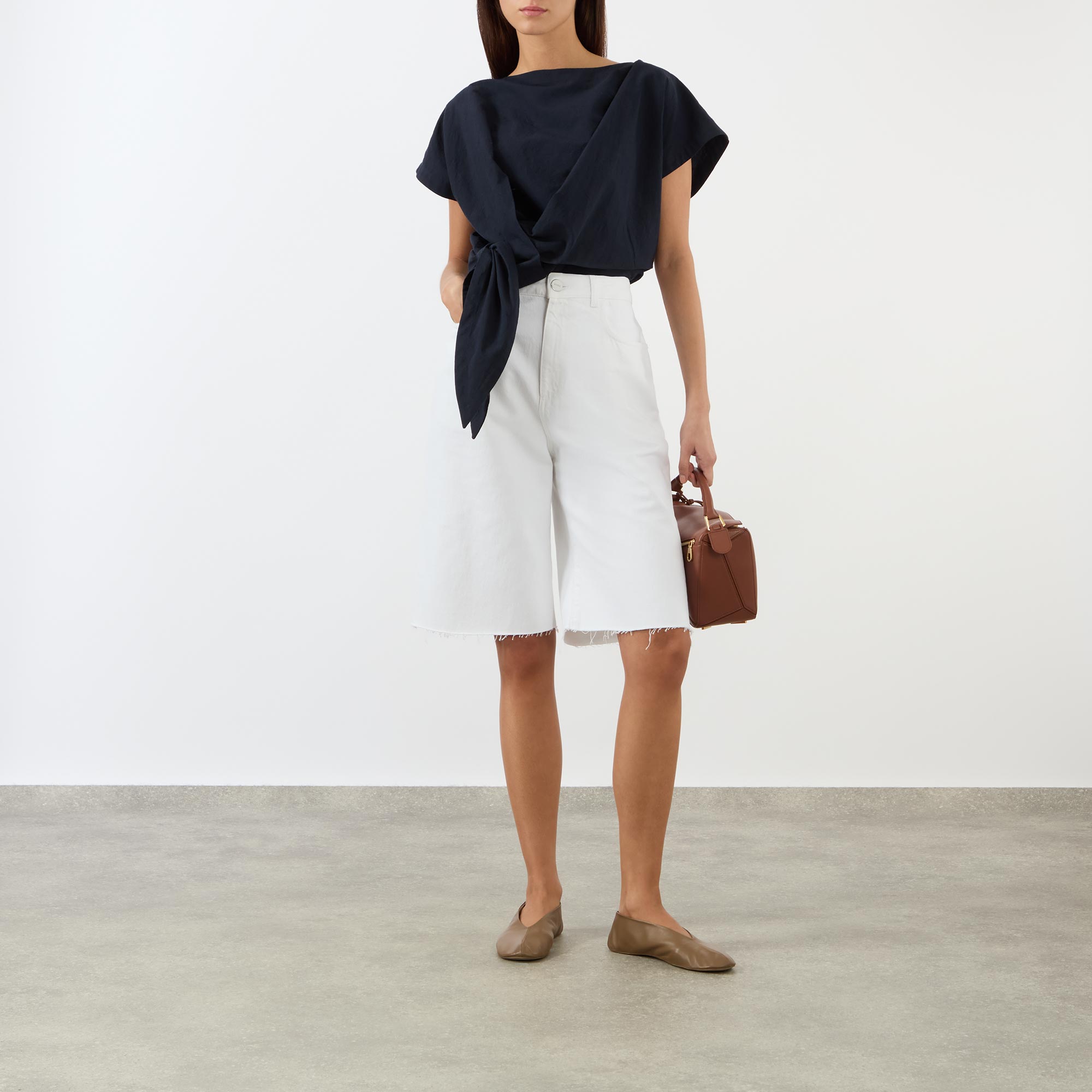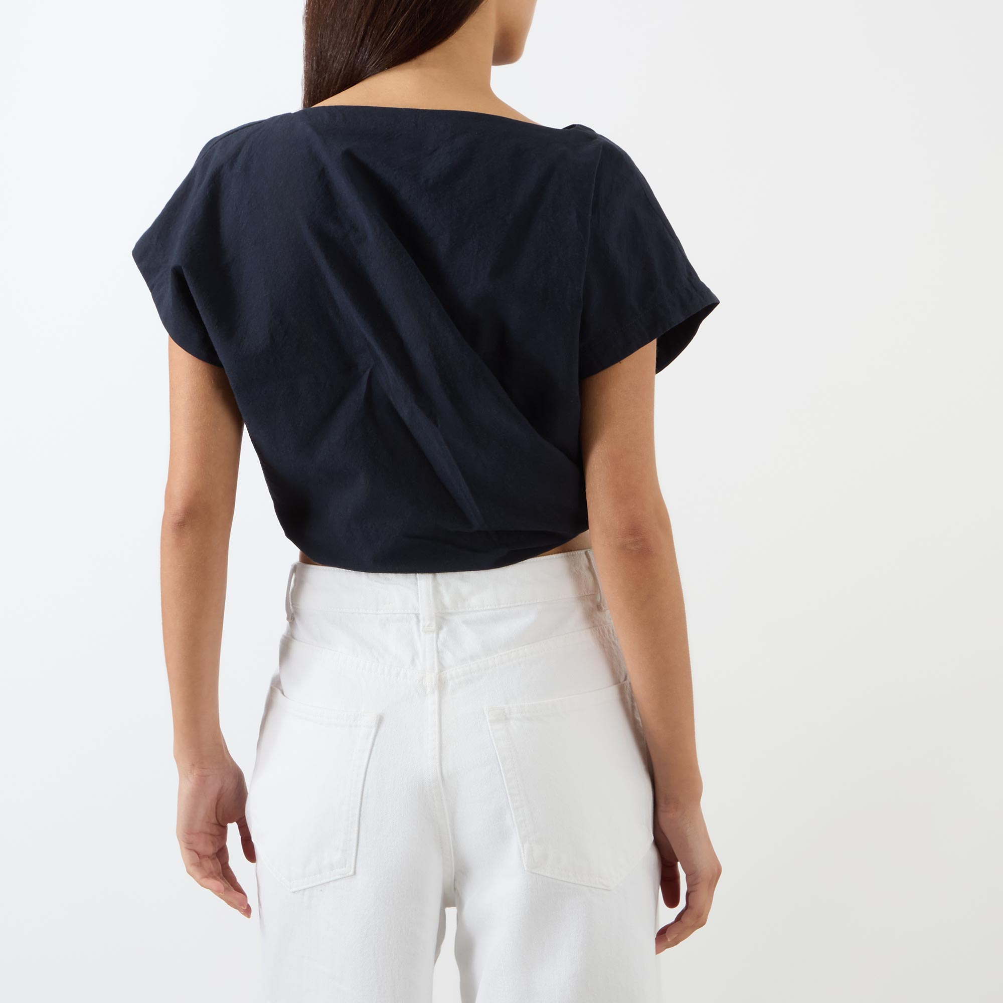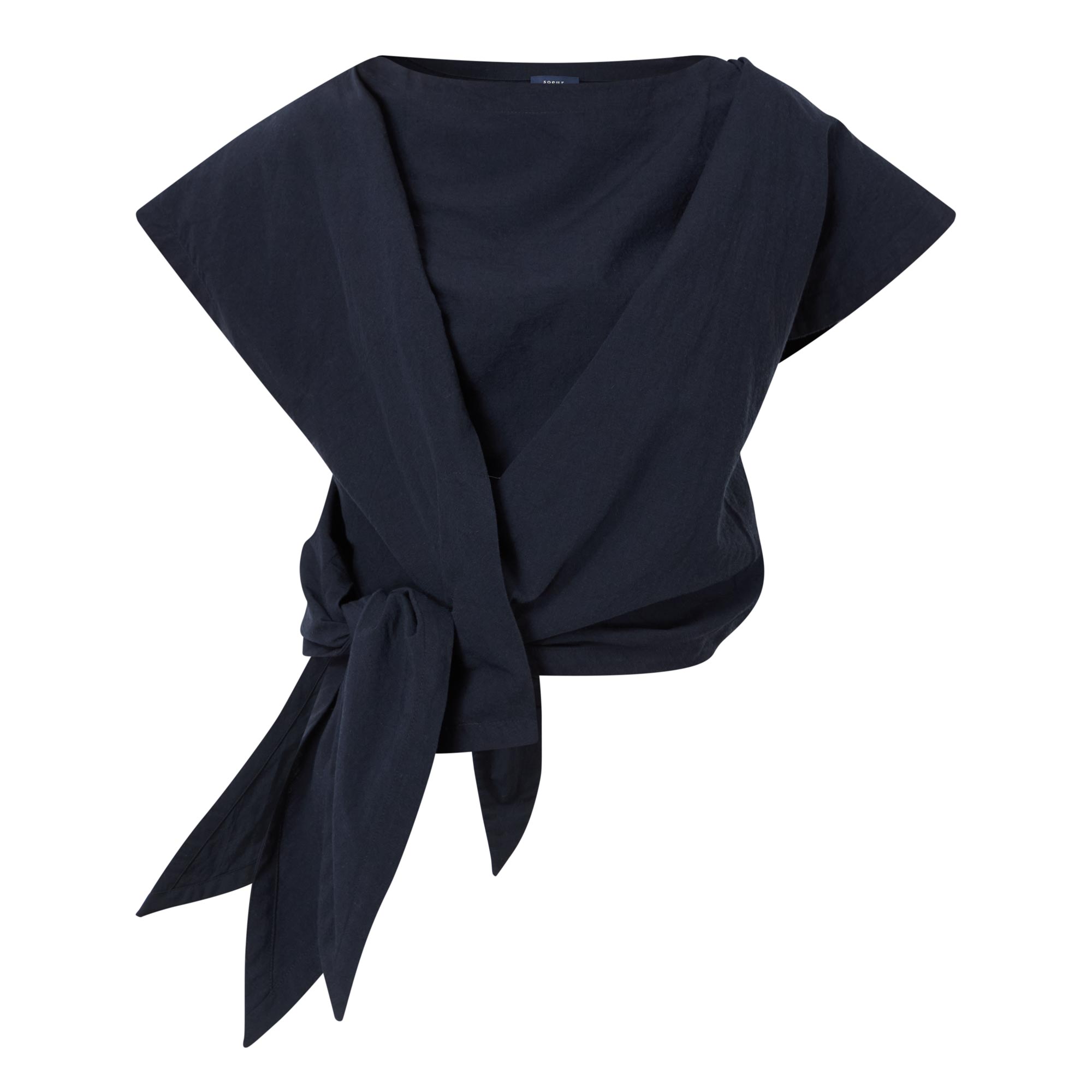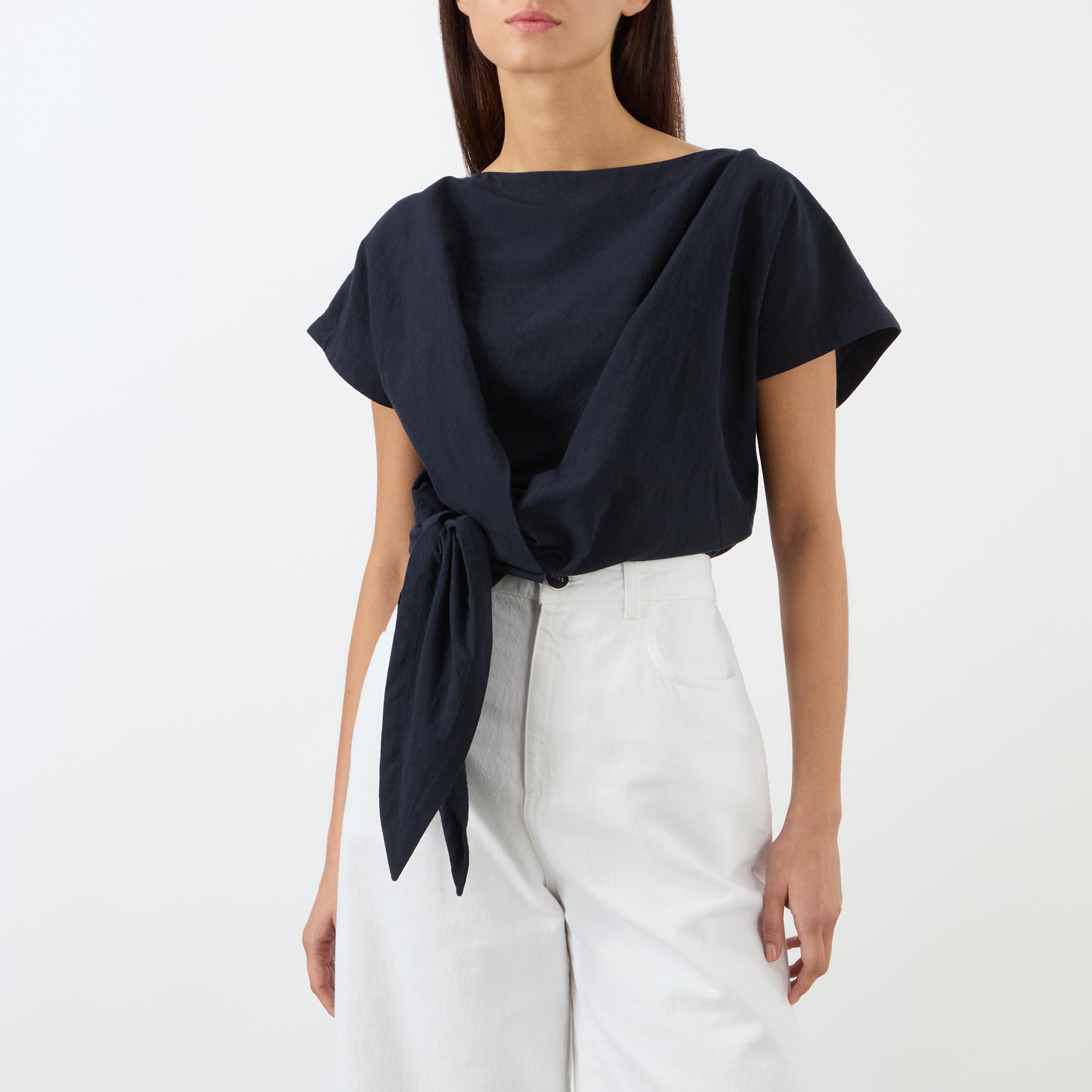 - Loose fit, round neck, short sleeves, cropped length, tie hem fastening