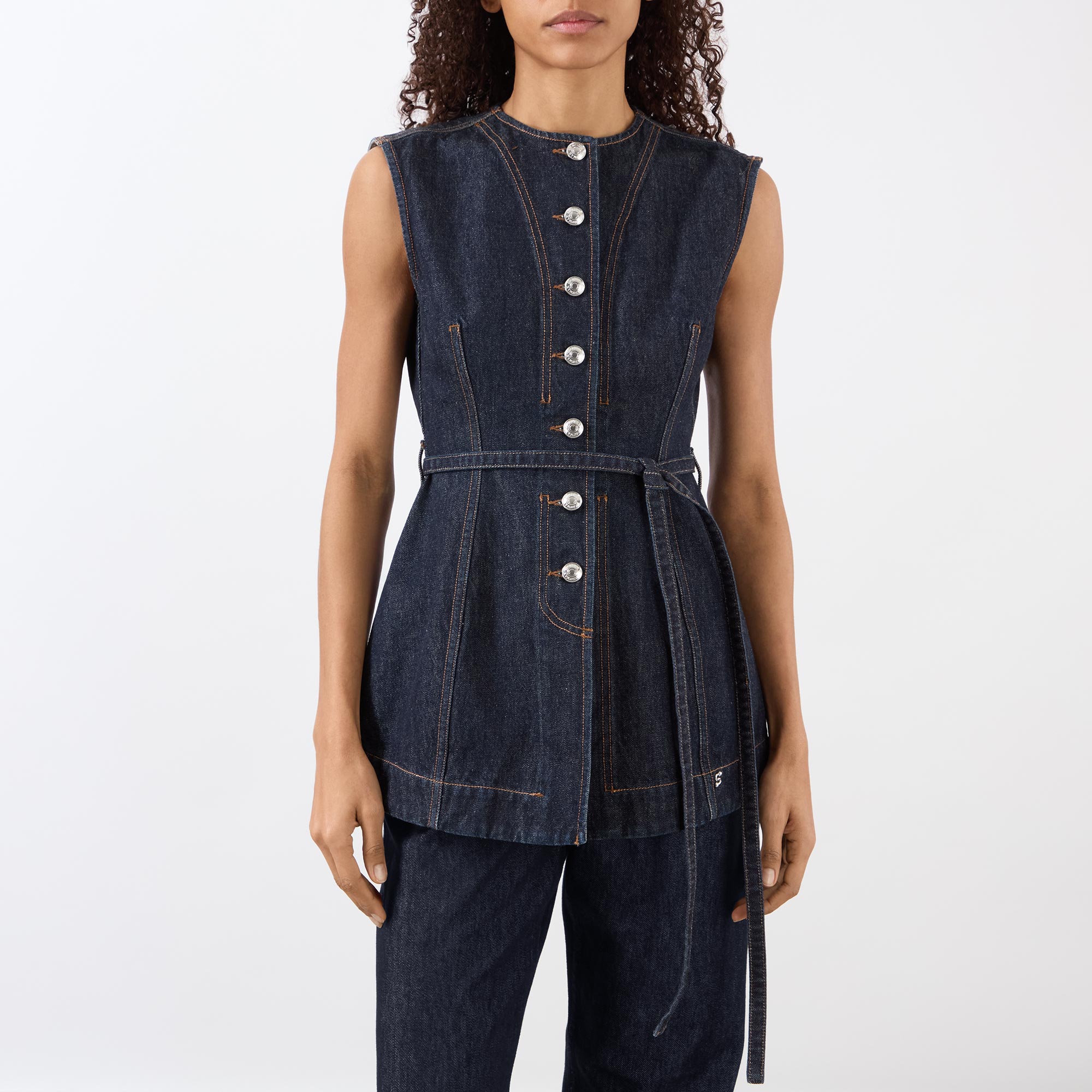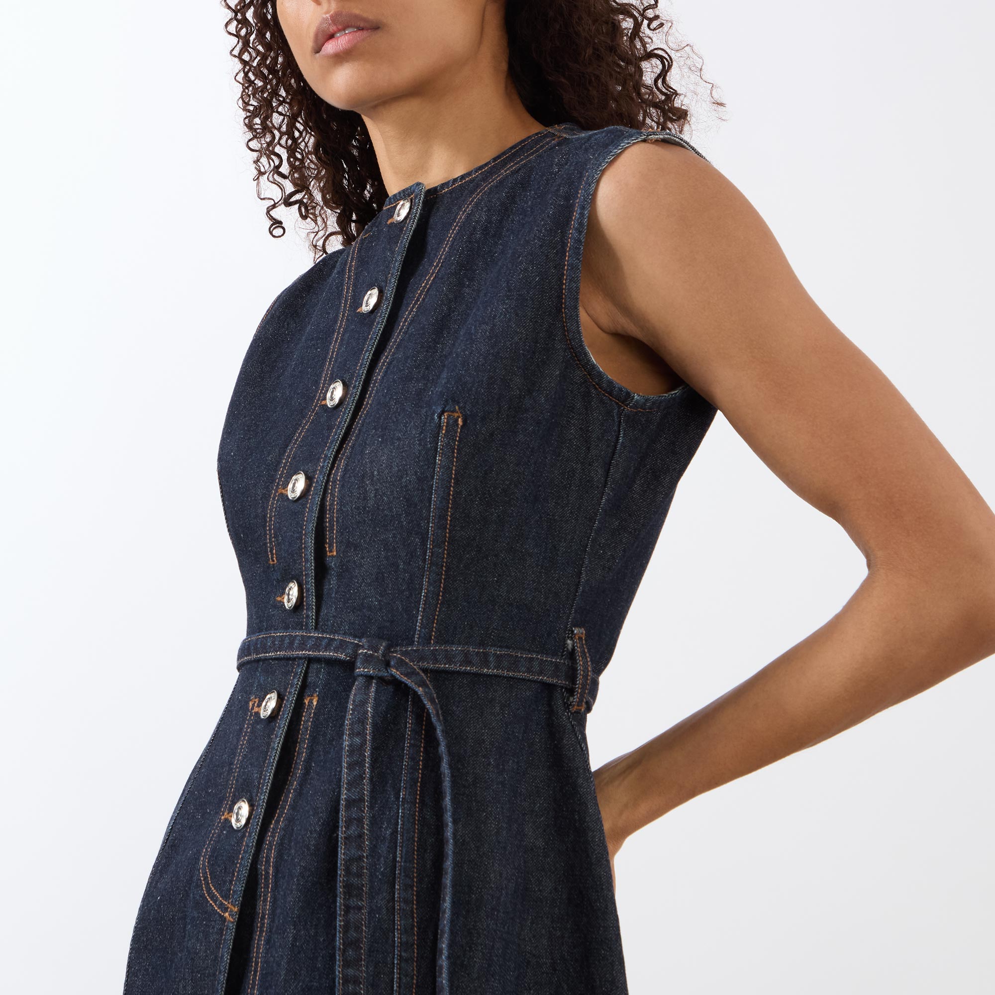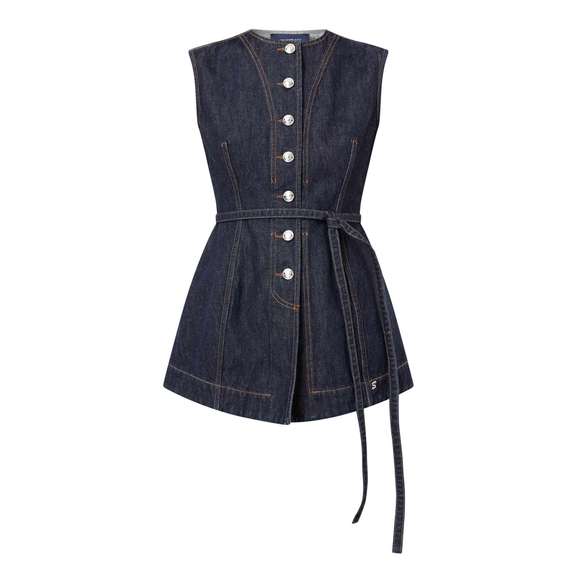 - Crew neck, sleeveless cut, fitted through the waist, front button fastening, matching belt fastening, flared hem, tobacco stitching, longline design, dark wash finish