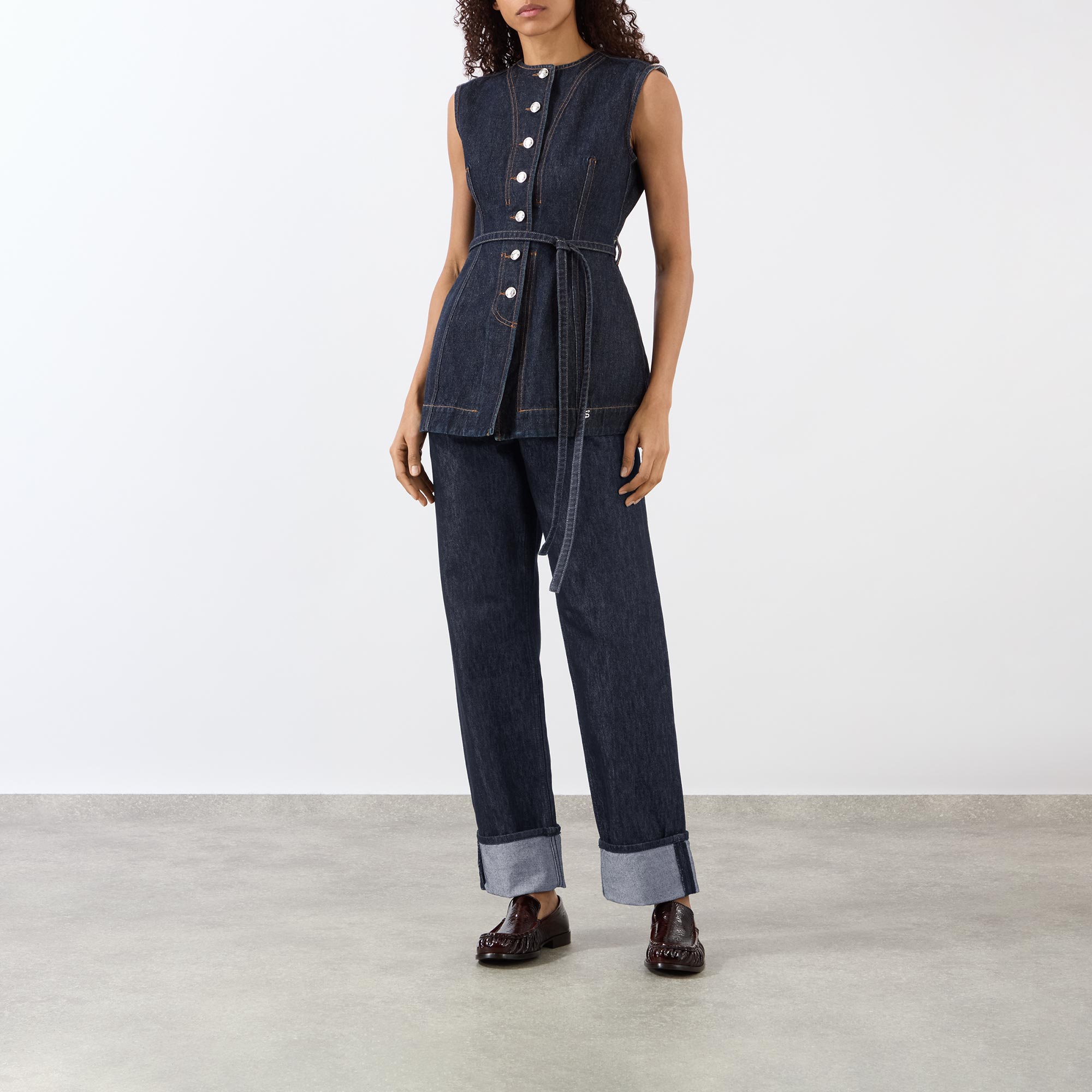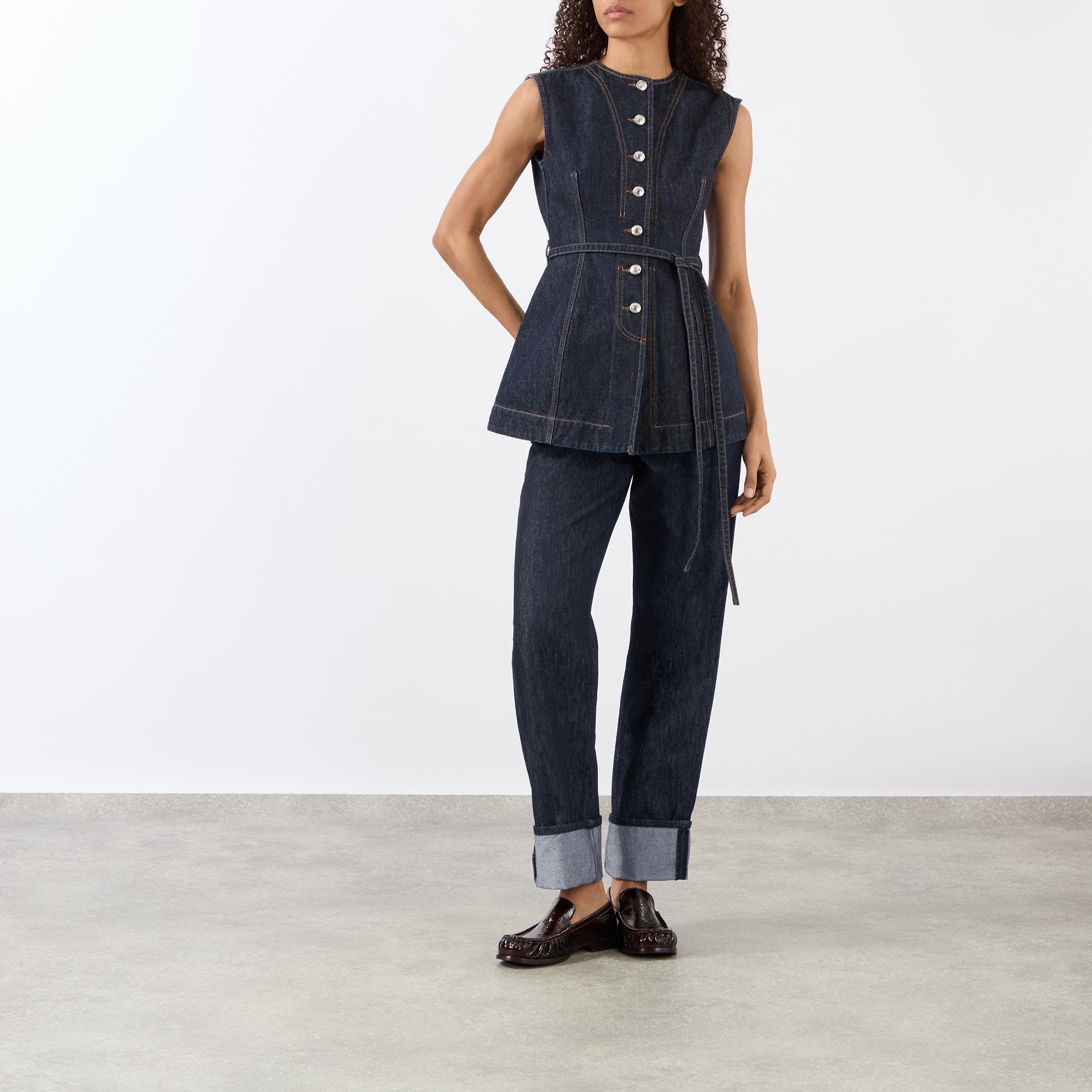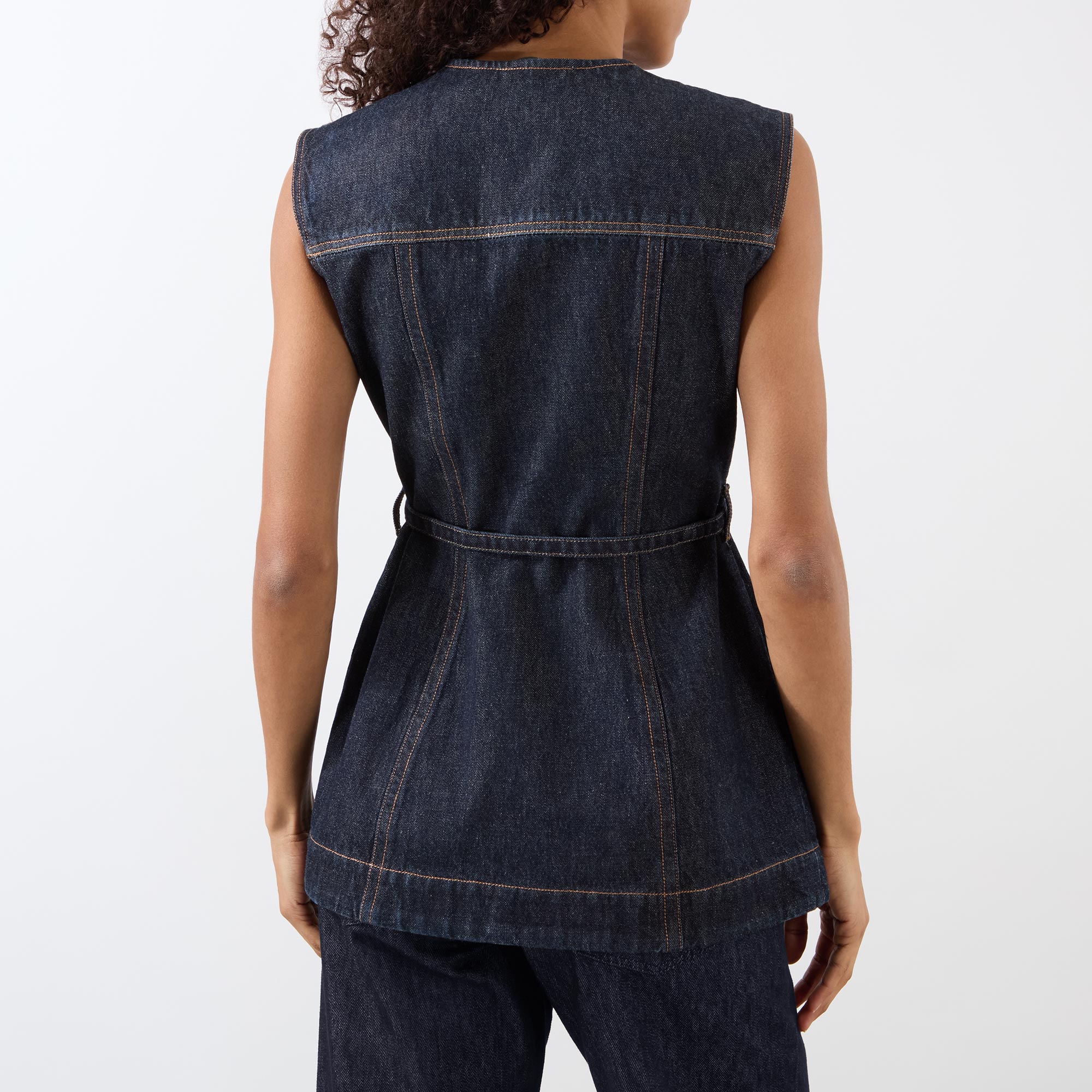 - Crew neck, sleeveless cut, fitted through the waist, front button fastening, matching belt fastening, flared hem, tobacco stitching, longline design, dark wash finish
