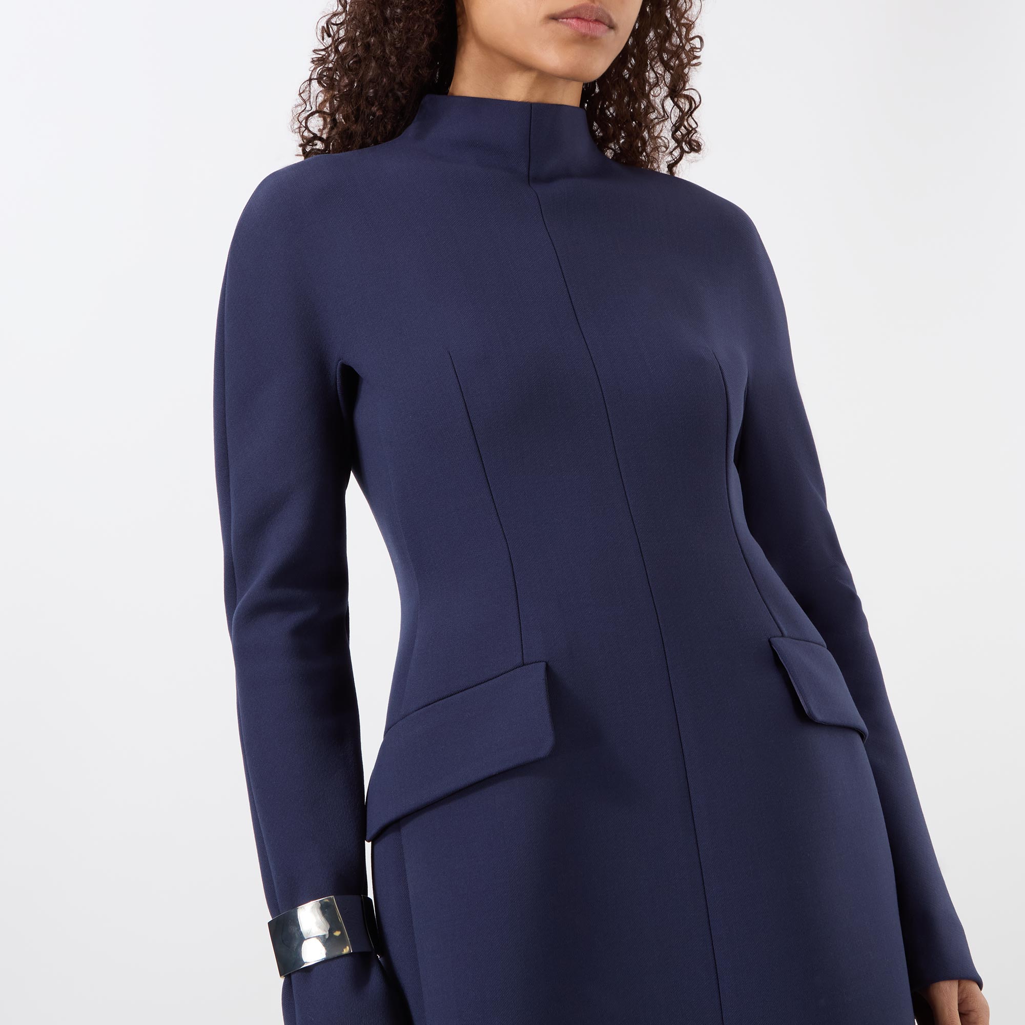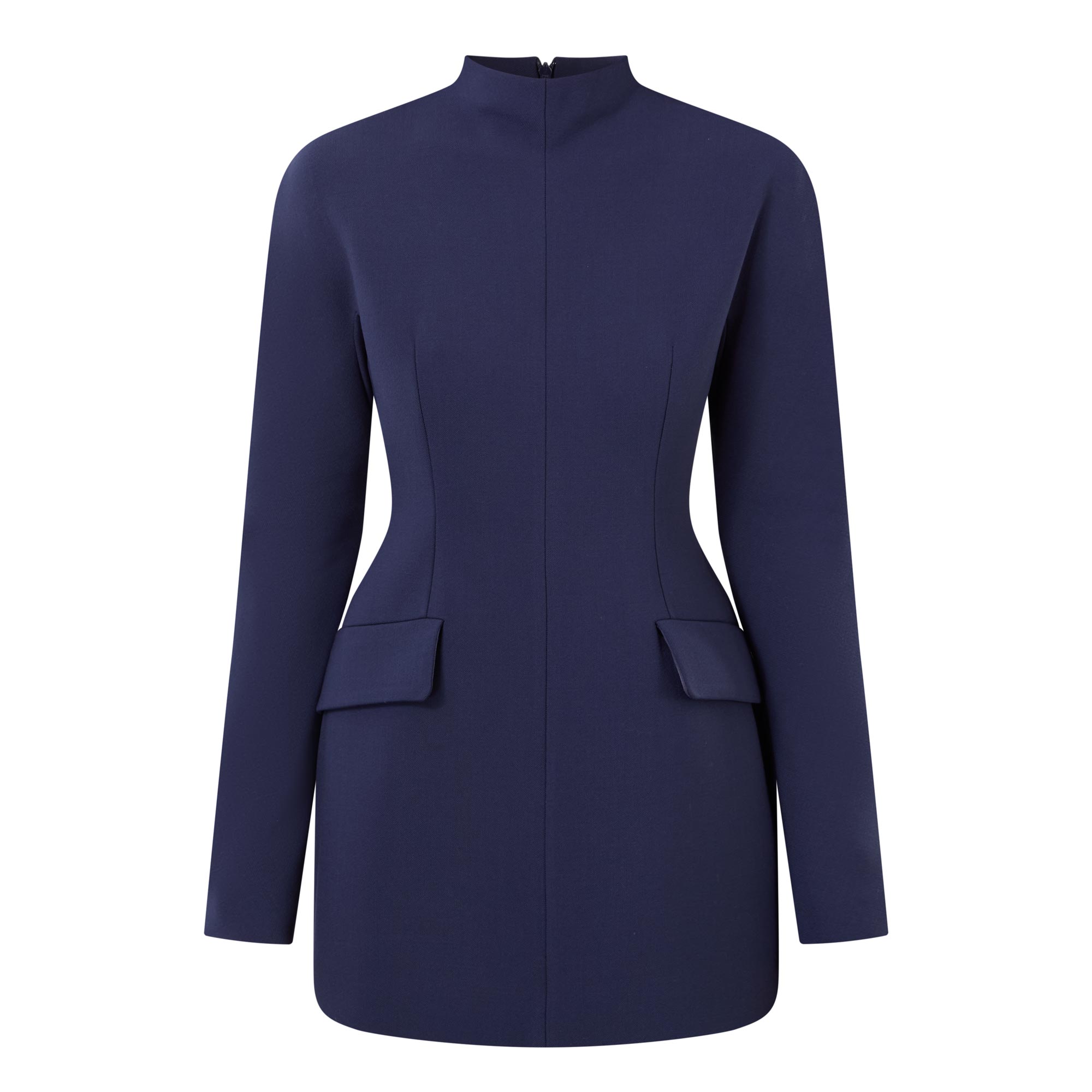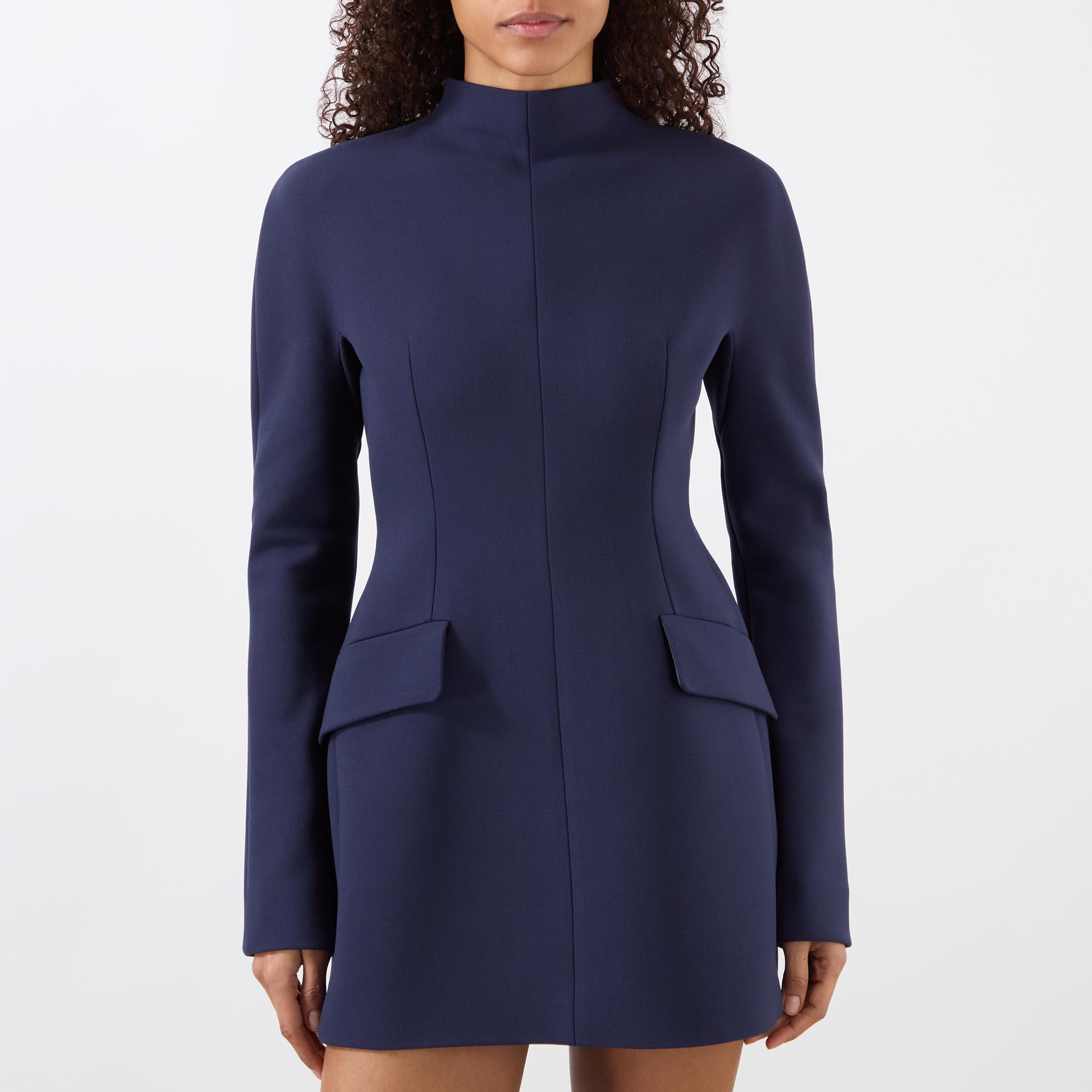 - Mock neck, long sleeves, darting through the waist, rear zip fastening, two hip flap pockets, straight hem, mini length, smooth finish