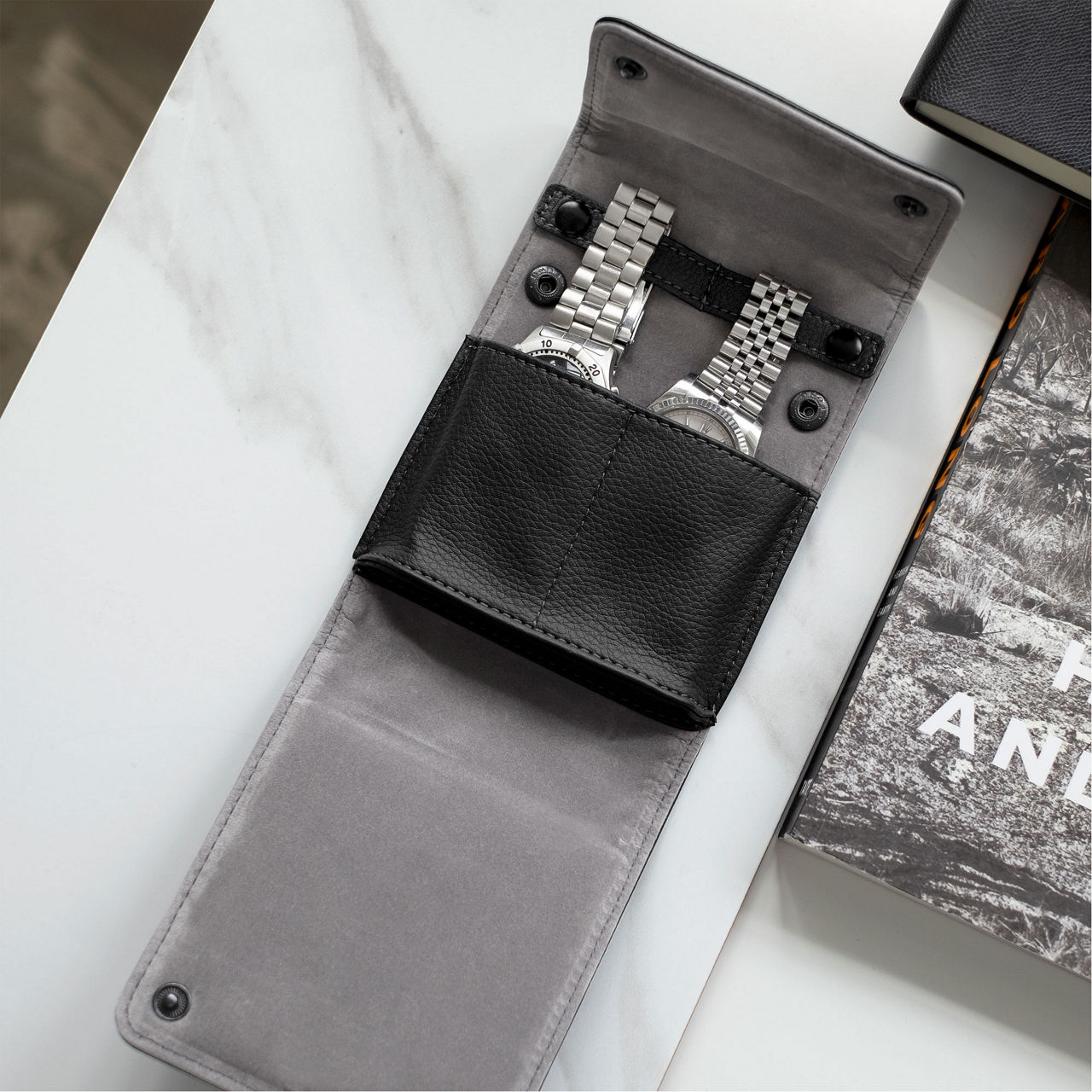 Travel made simple with the Double Watch Wrap. With a secure popper closure and soft velvet lining, the double watch wrap safely holds two watches, so you’ll always have choices! *dimensions shown are when product is closed
