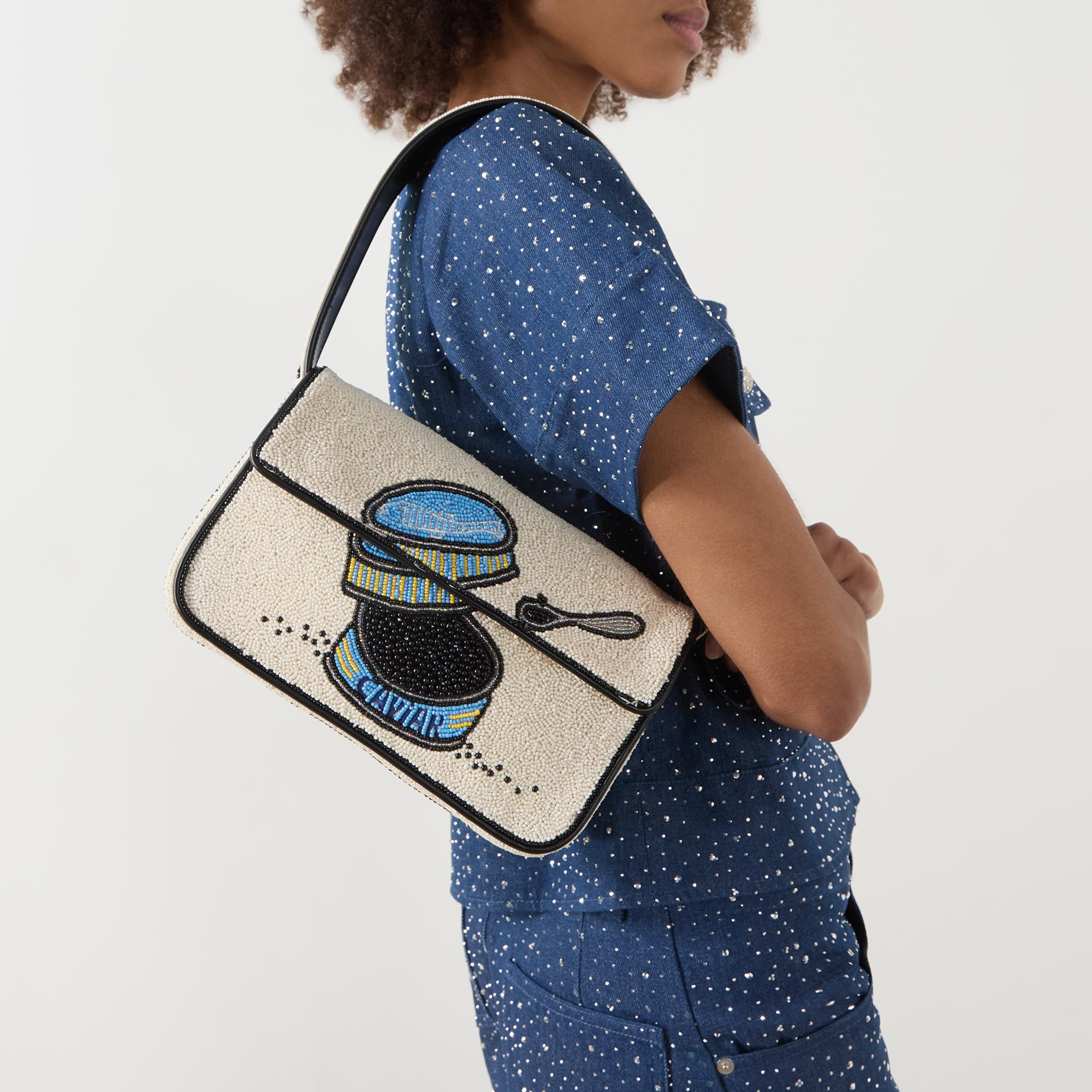 - Shoulder strap, flap fastening with magnetic button closure, hand-beaded, caviar design, logo details, one rear slip pocket
