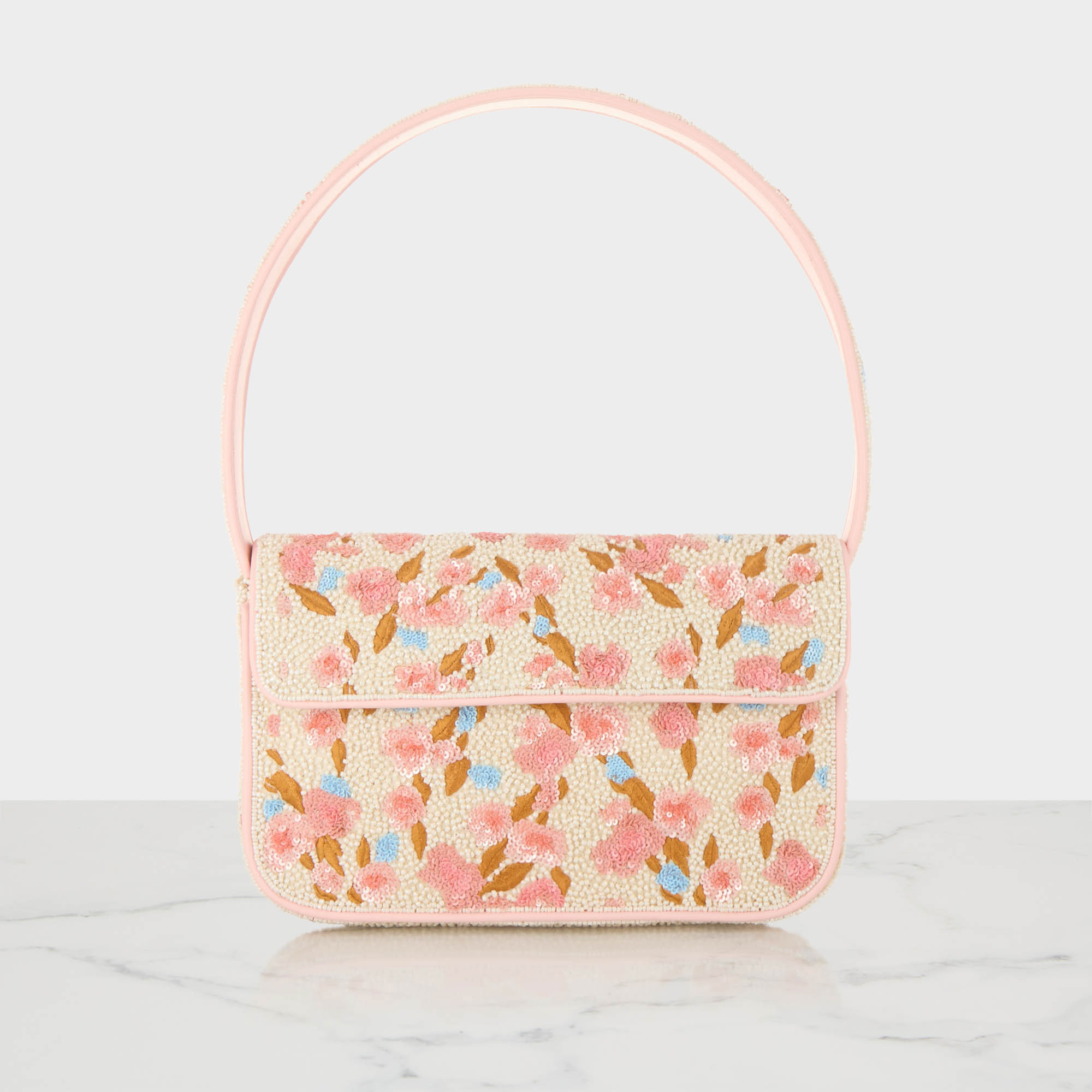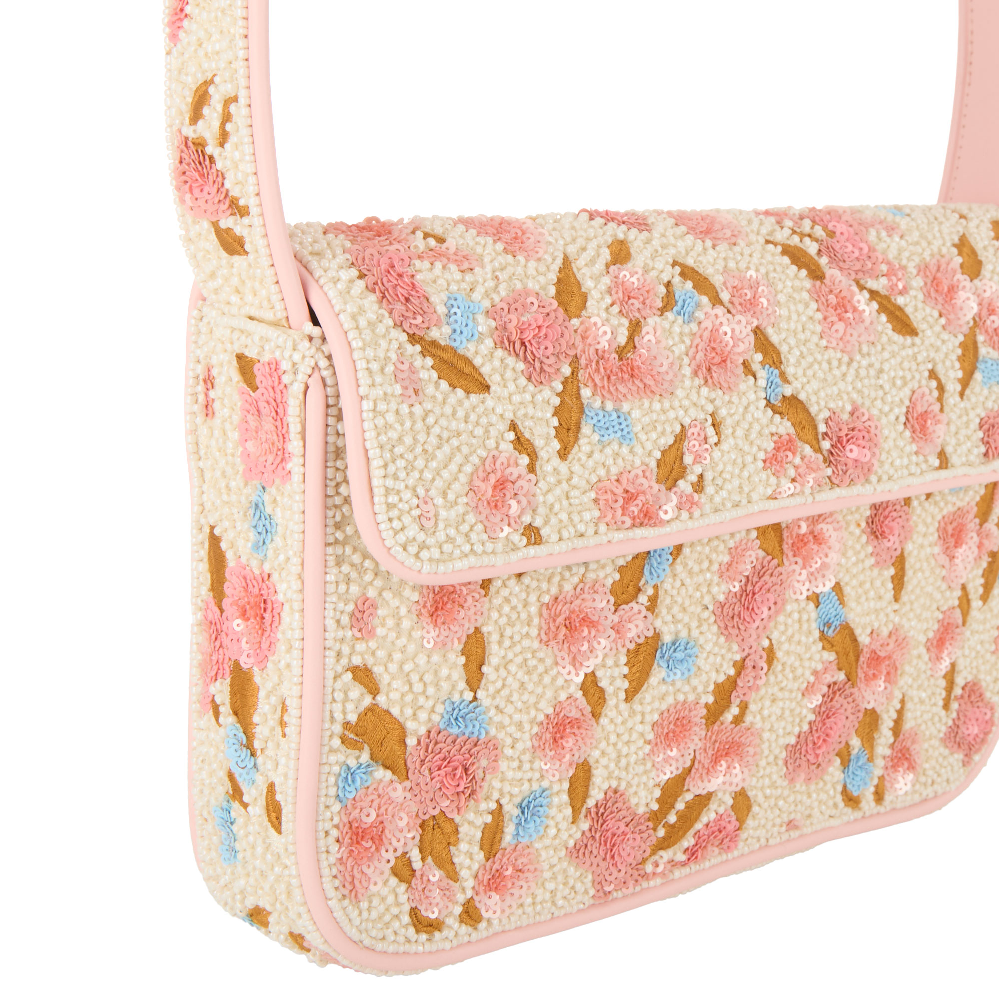 - Flap and magnetic button closure, fixed shoulder strap, spring day hand-beaded pattern, faux leather piping details, logo details, exterior slip pocket