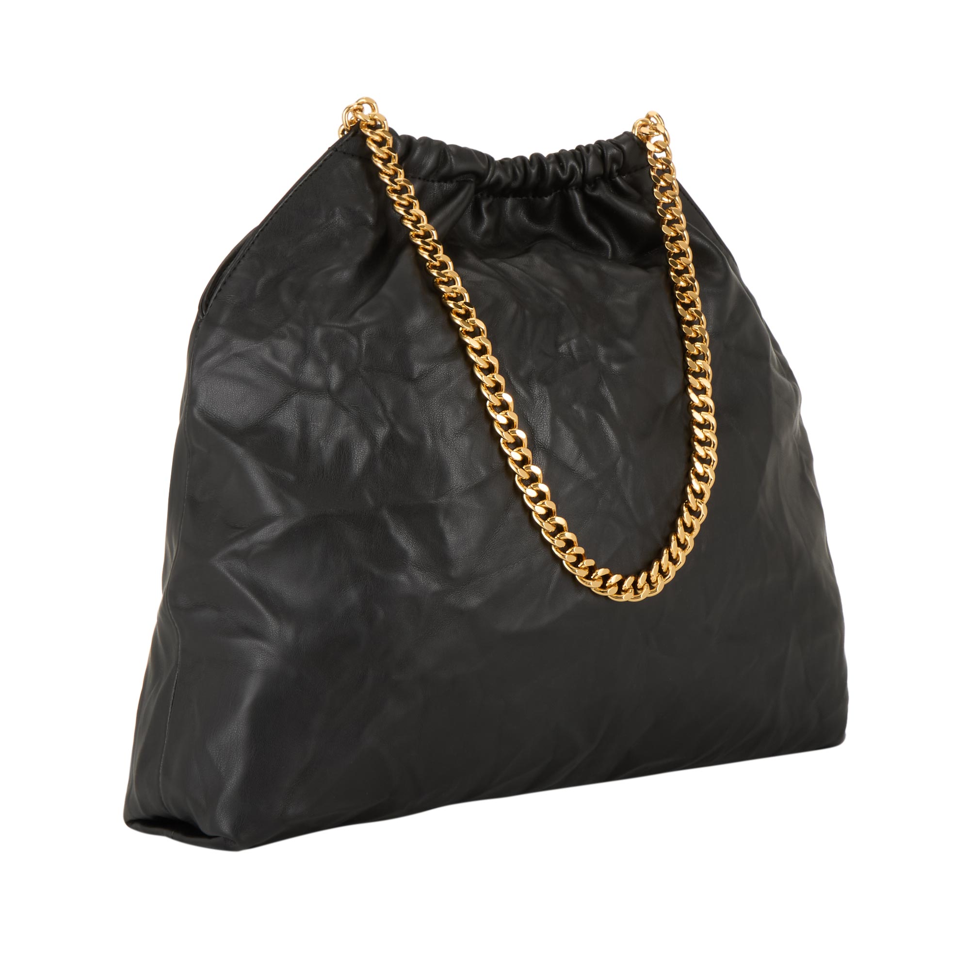 • Drawstring fastening, chain carry handles, engraved logo medallion, gold-tone hardware, crinkled leather alternative, semi-gloss finish with Airlite® NO2 sequestering, air-purifying coating