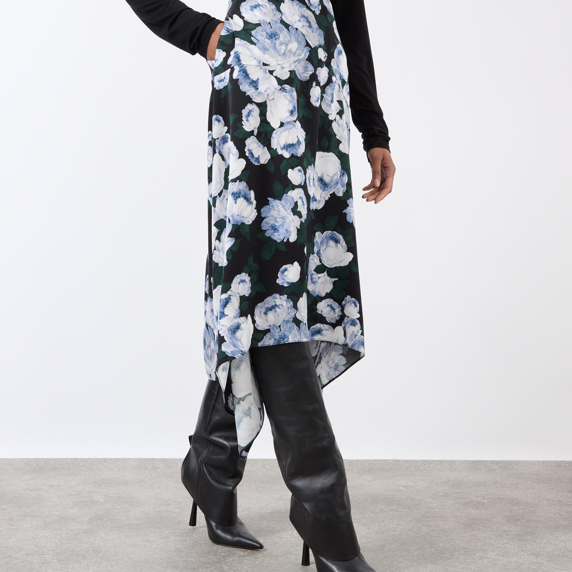 - High-rise, concealed zip-fastening closure, bold floral pattern, flared silhouette, asymmetric hemline, midi length, smooth fabric