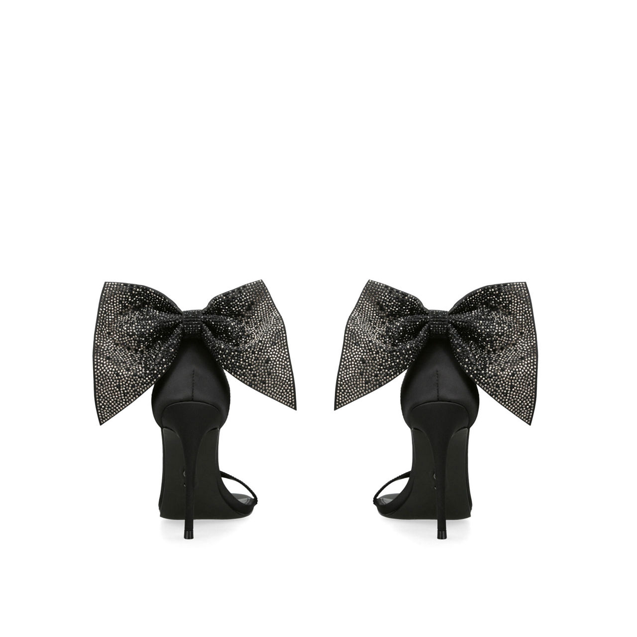 - Round open toe, thin toe strap, buckle-fastening ankle strap, embellished bow detail, stiletto heel