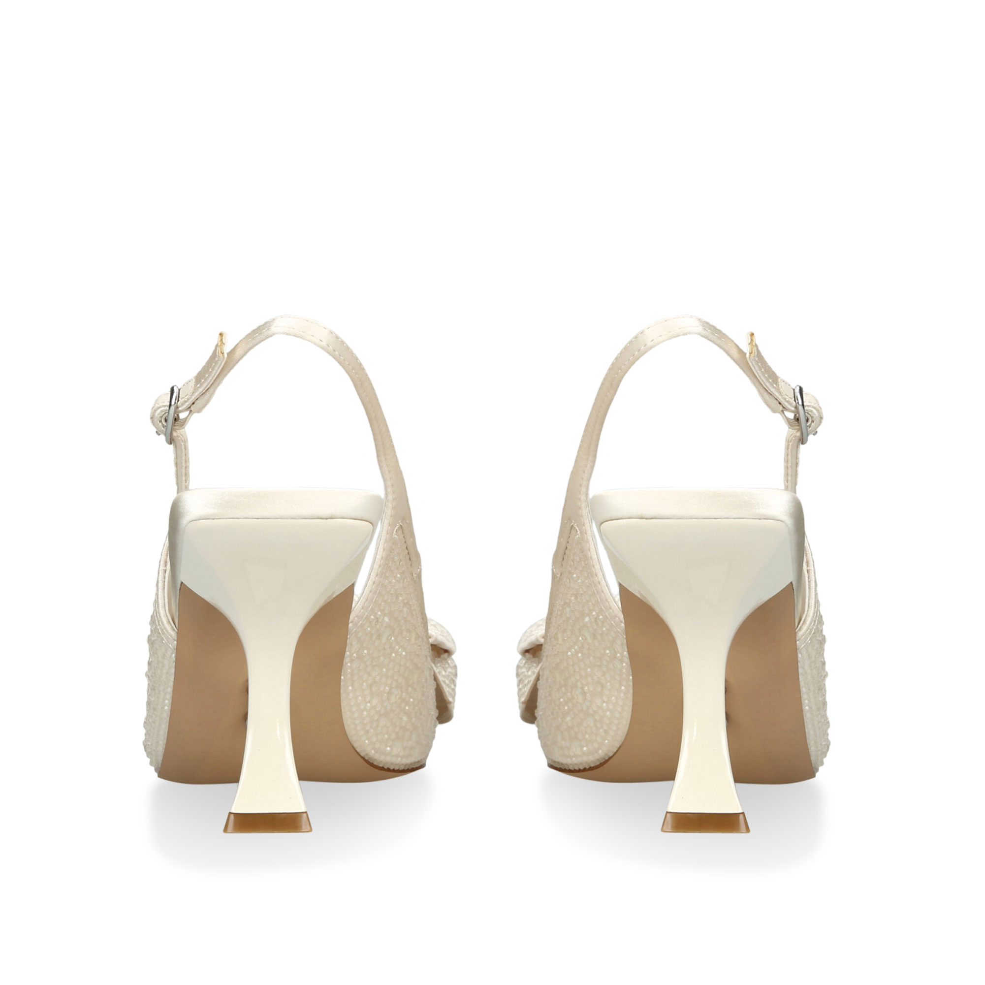 - Flared heel, textured pattern, playful bow detail on the pointed toe, slingback design, adjustable buckle