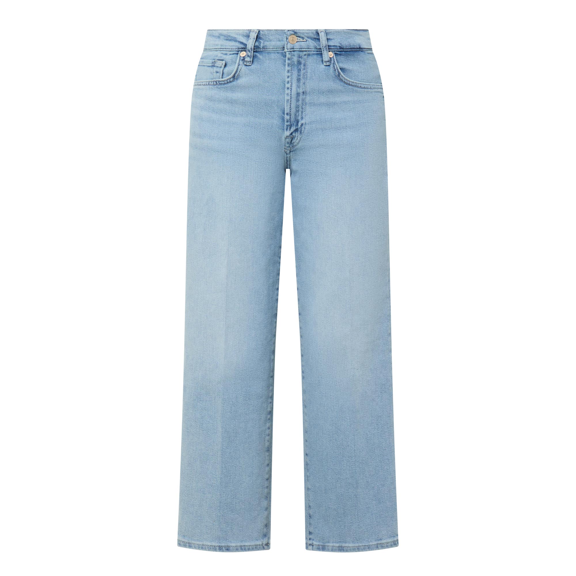- Mid rise, straight leg, cropped ankle length, belt loops, zip fly and button fastening, five-pocket styling, tobacco stitching, light wash finish