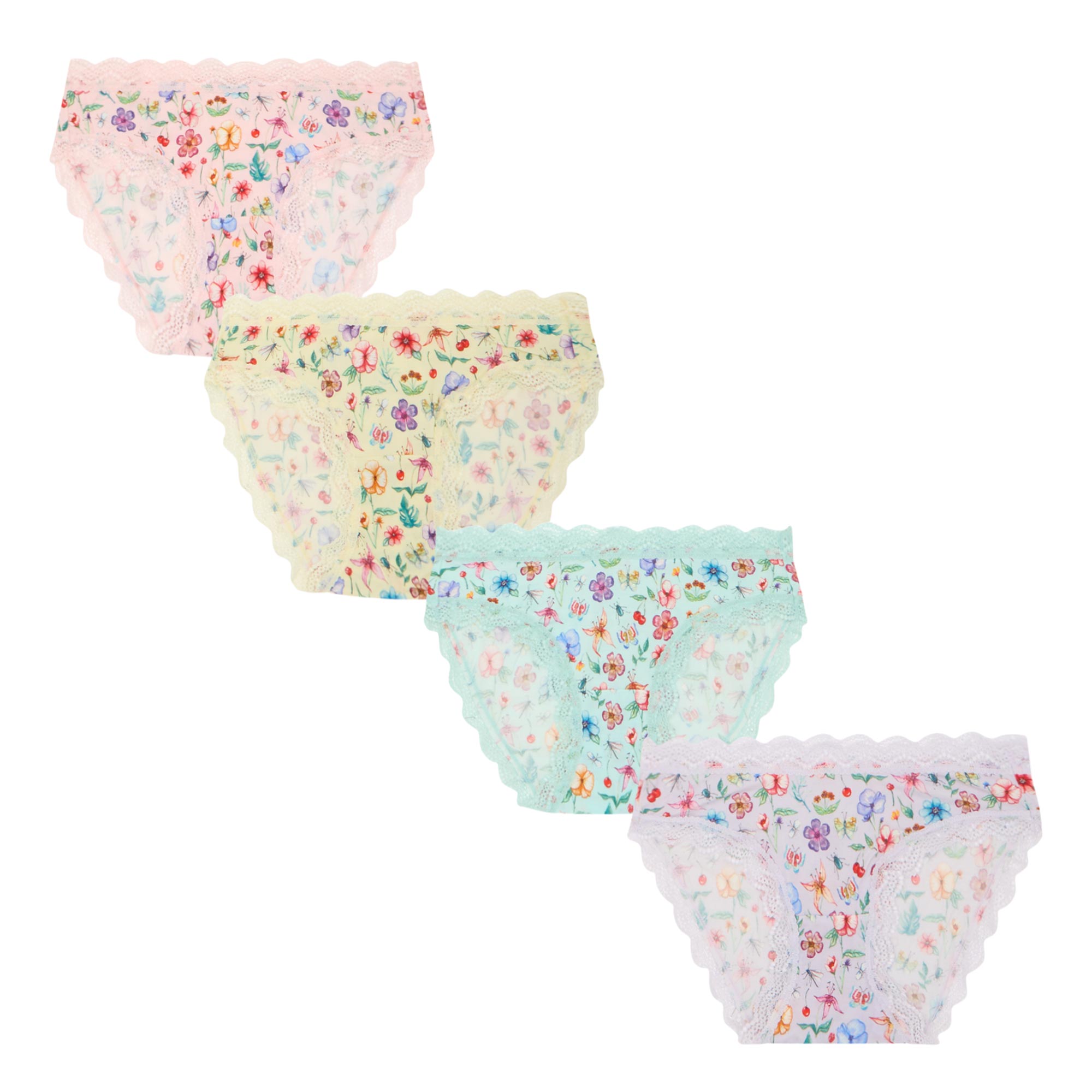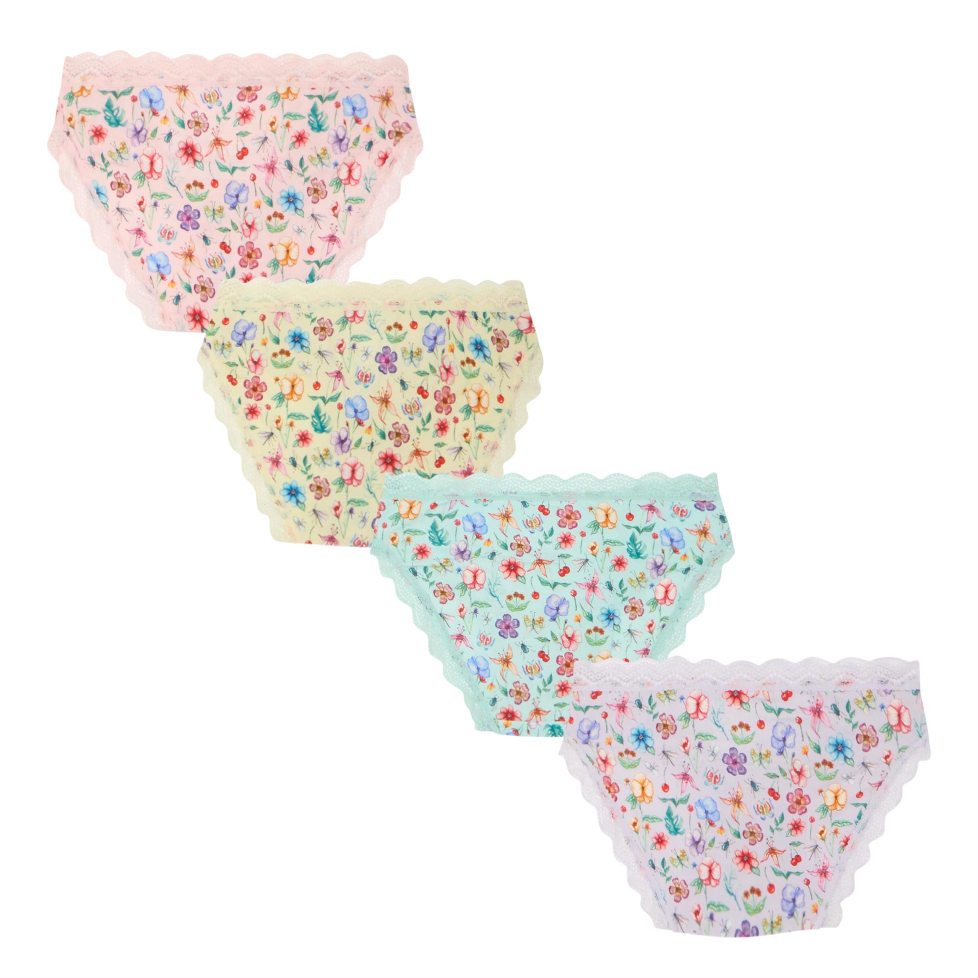 - Four-pack set, brief-style, mid-rise, elasticated waistbands, lace trim embellishment, assorted colours, floral pattern, super soft fabric