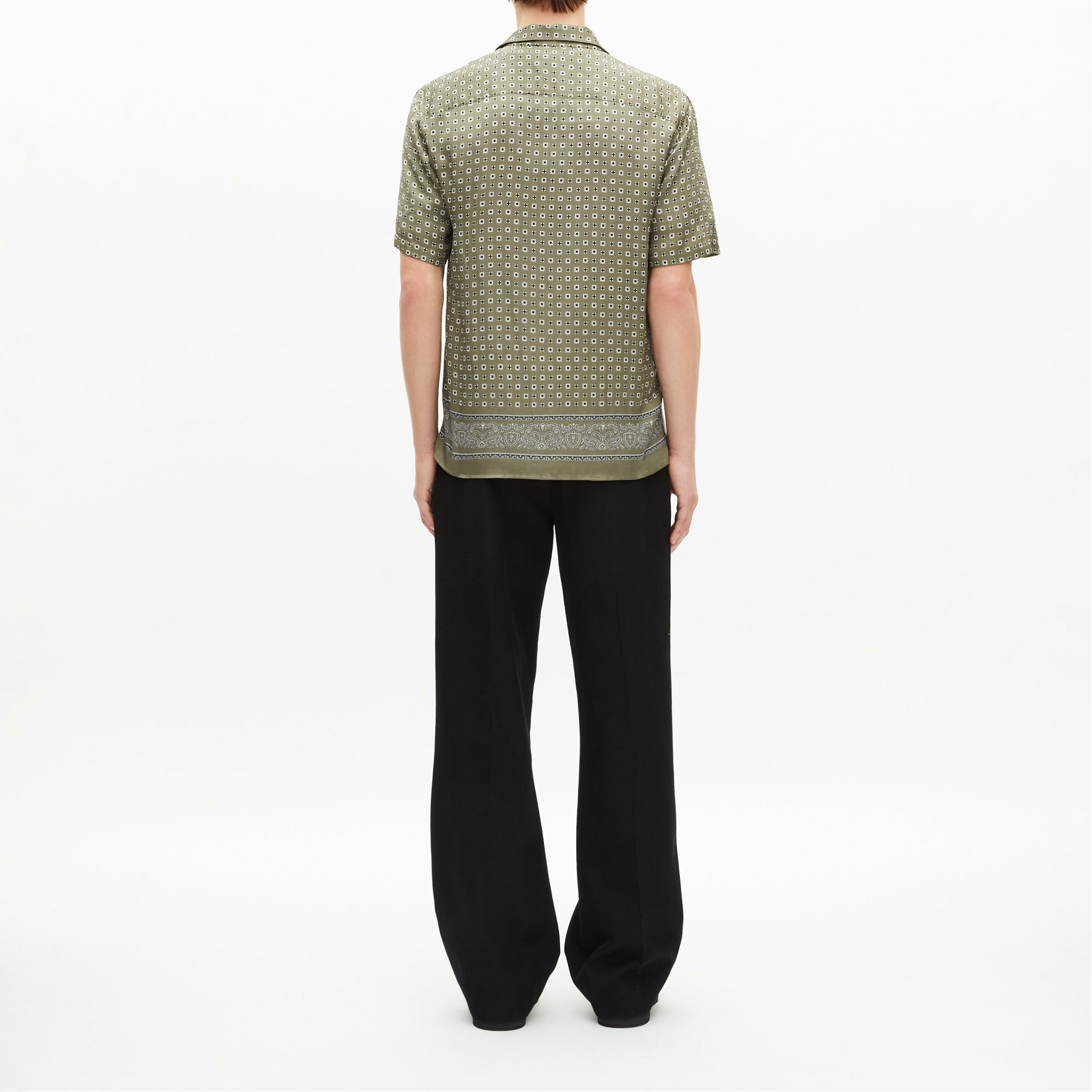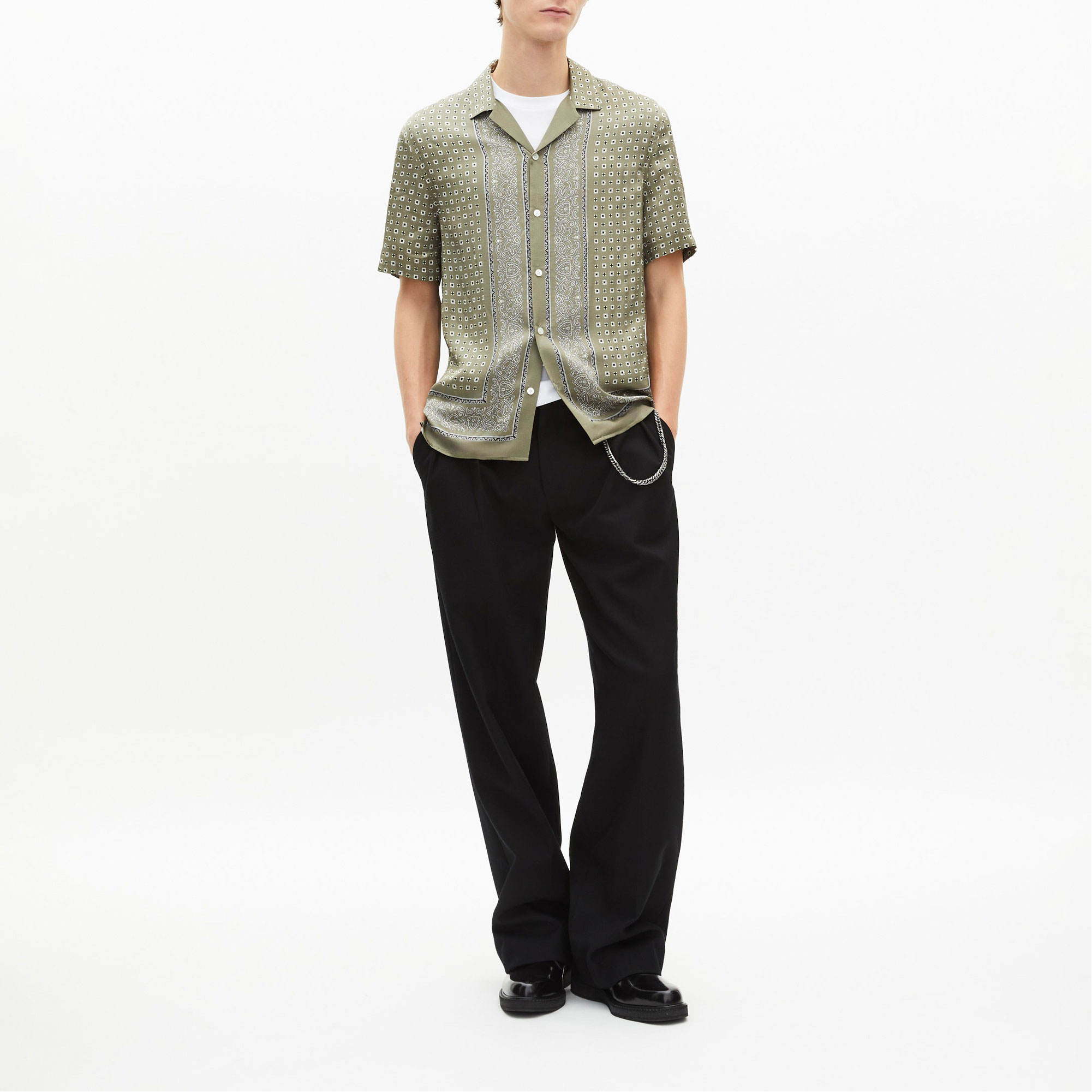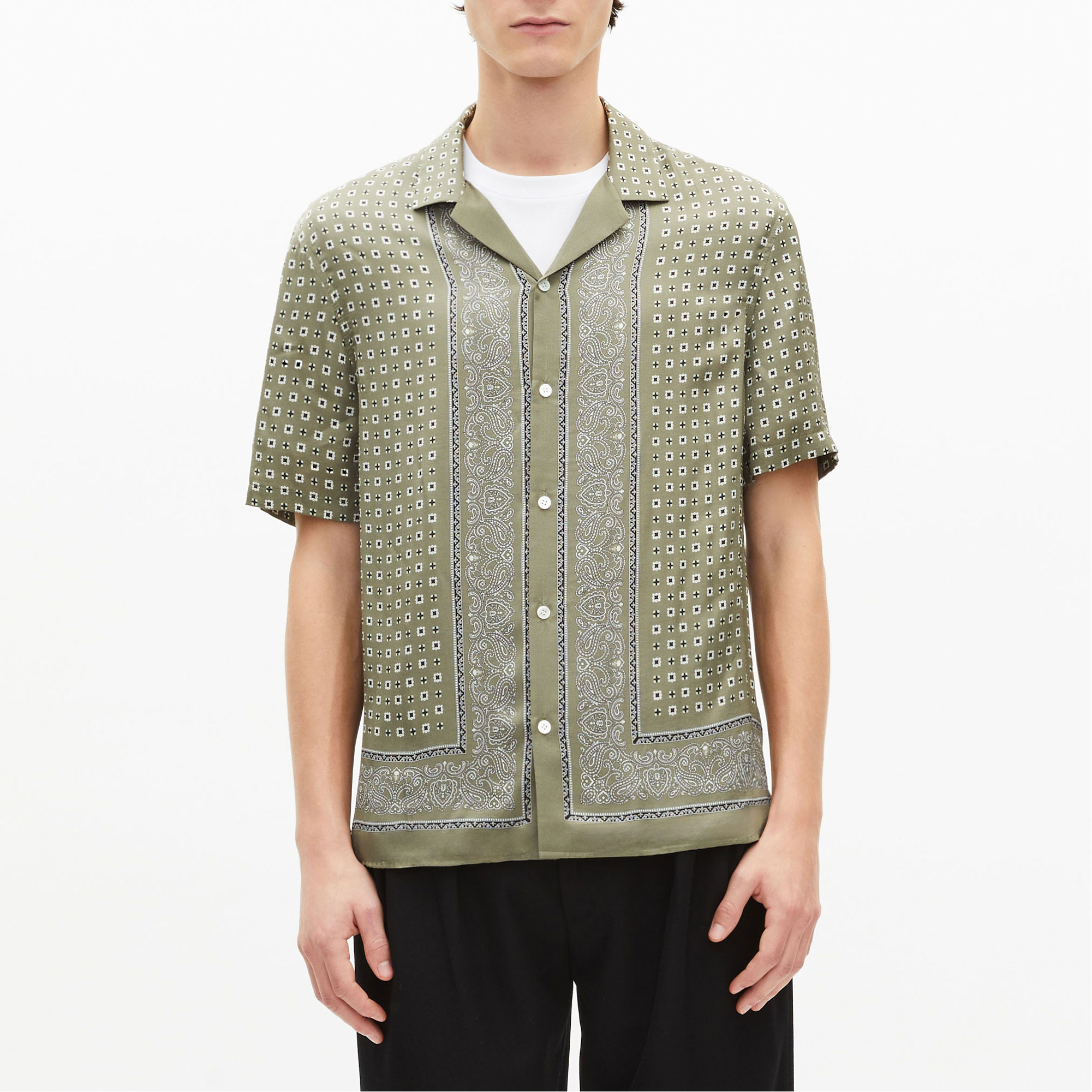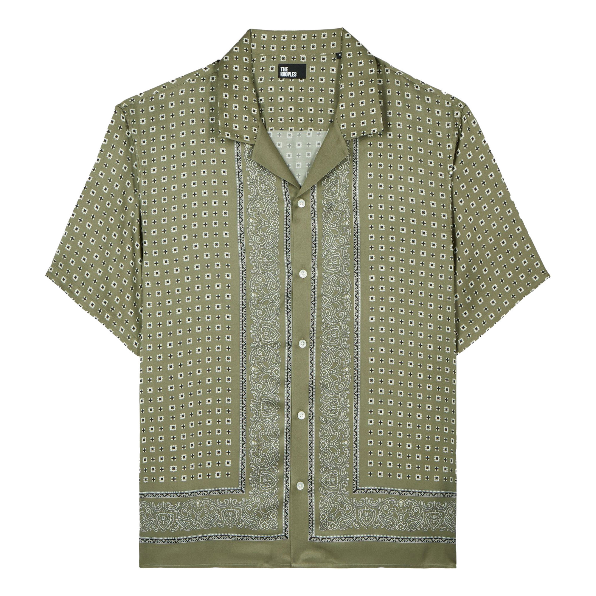 - Bandana print, wako collar, straight cut, short sleeves