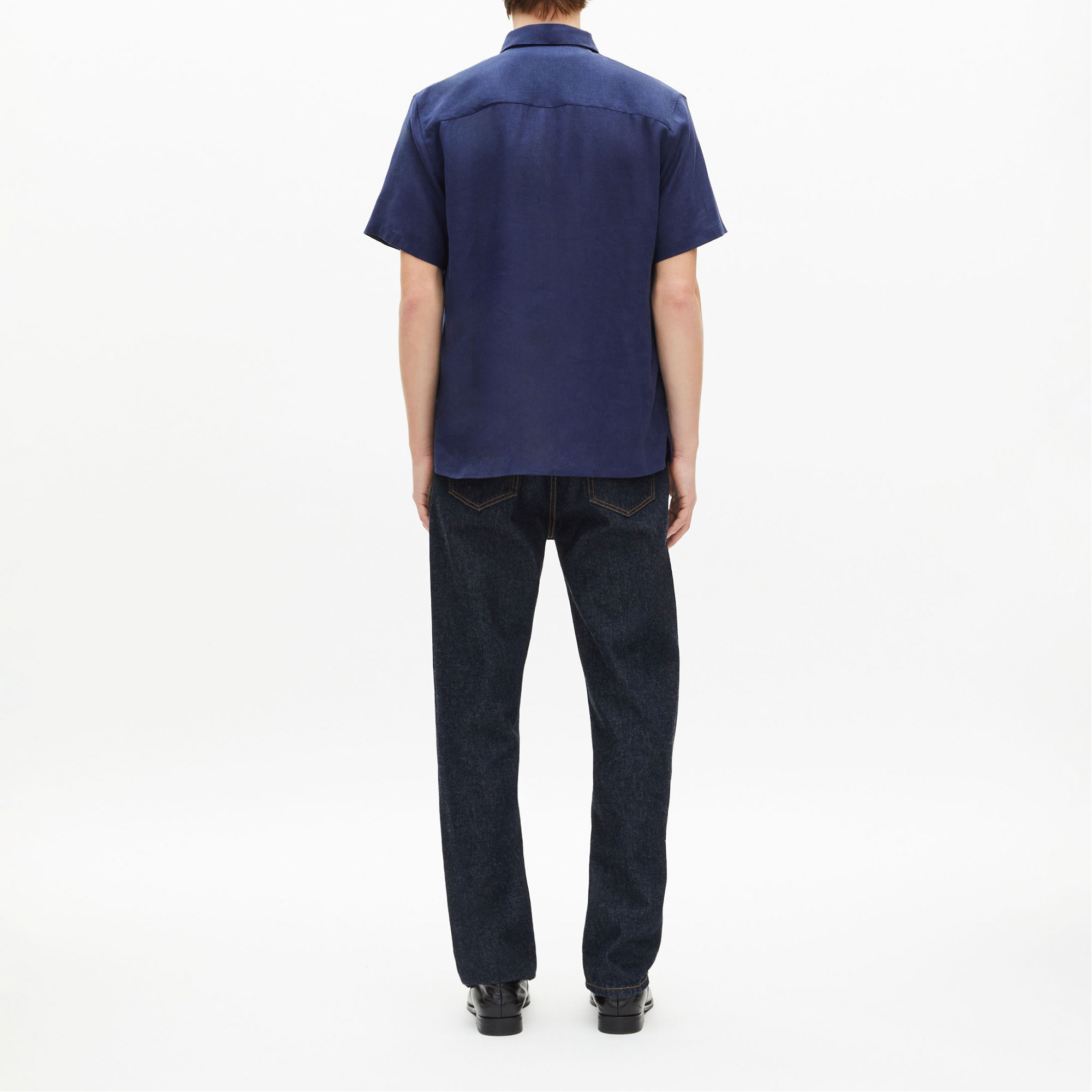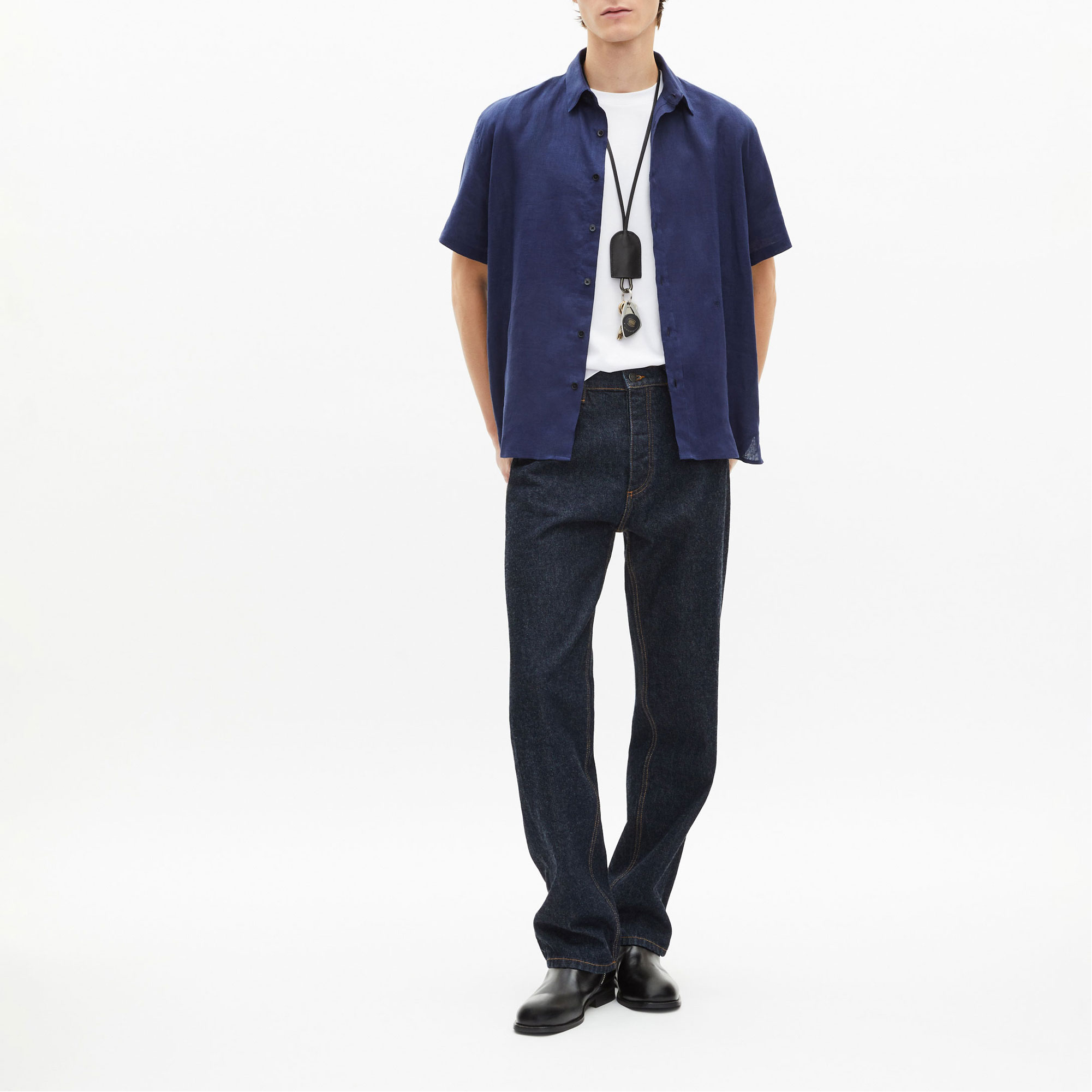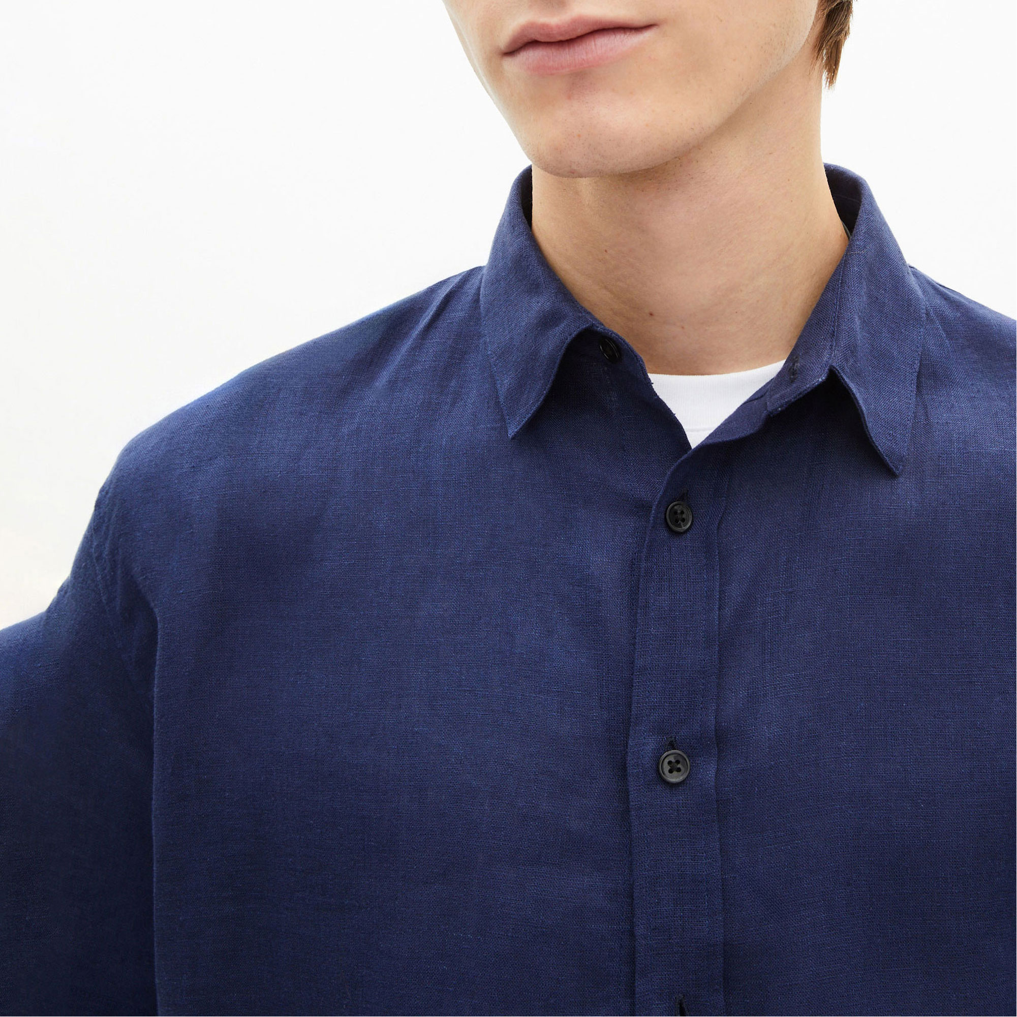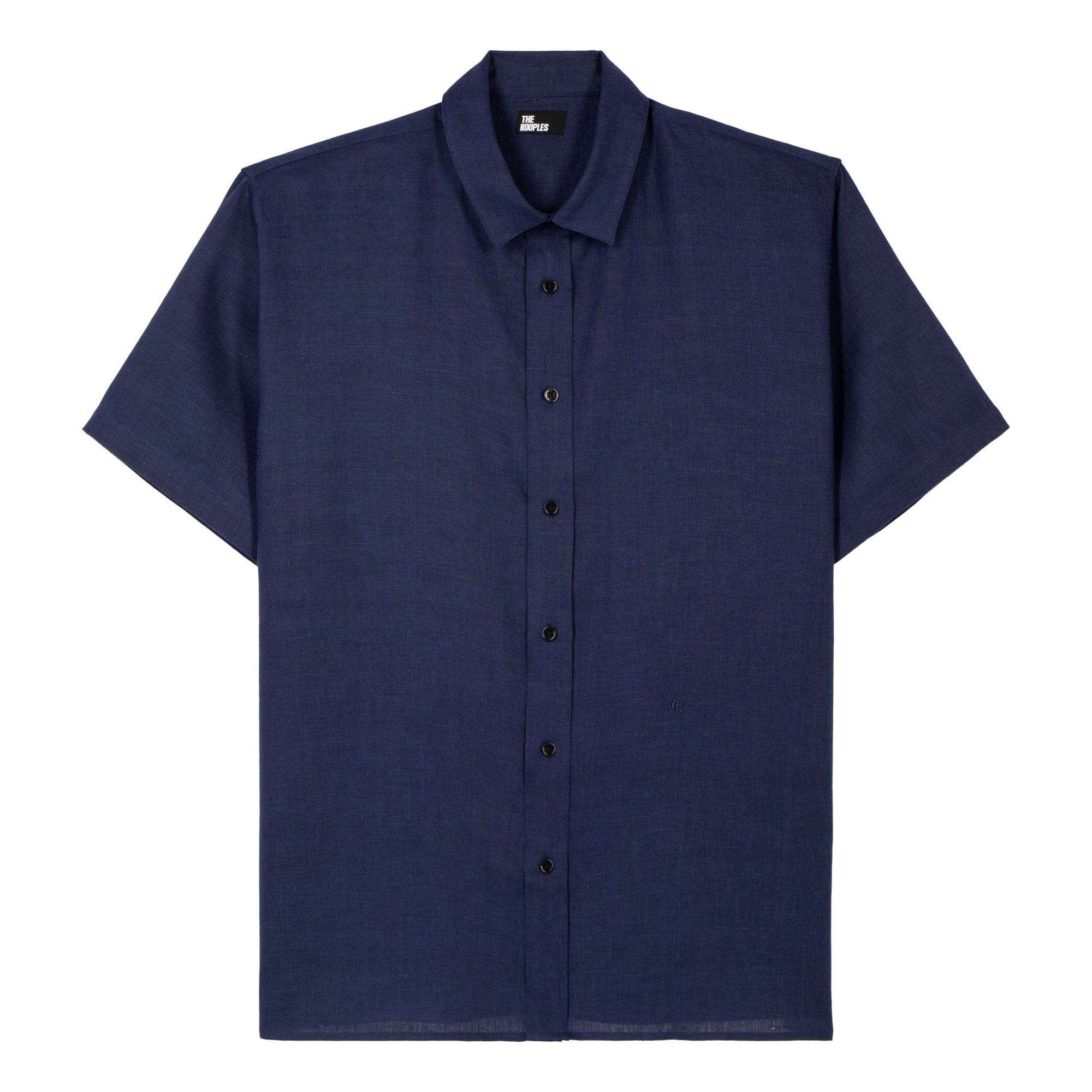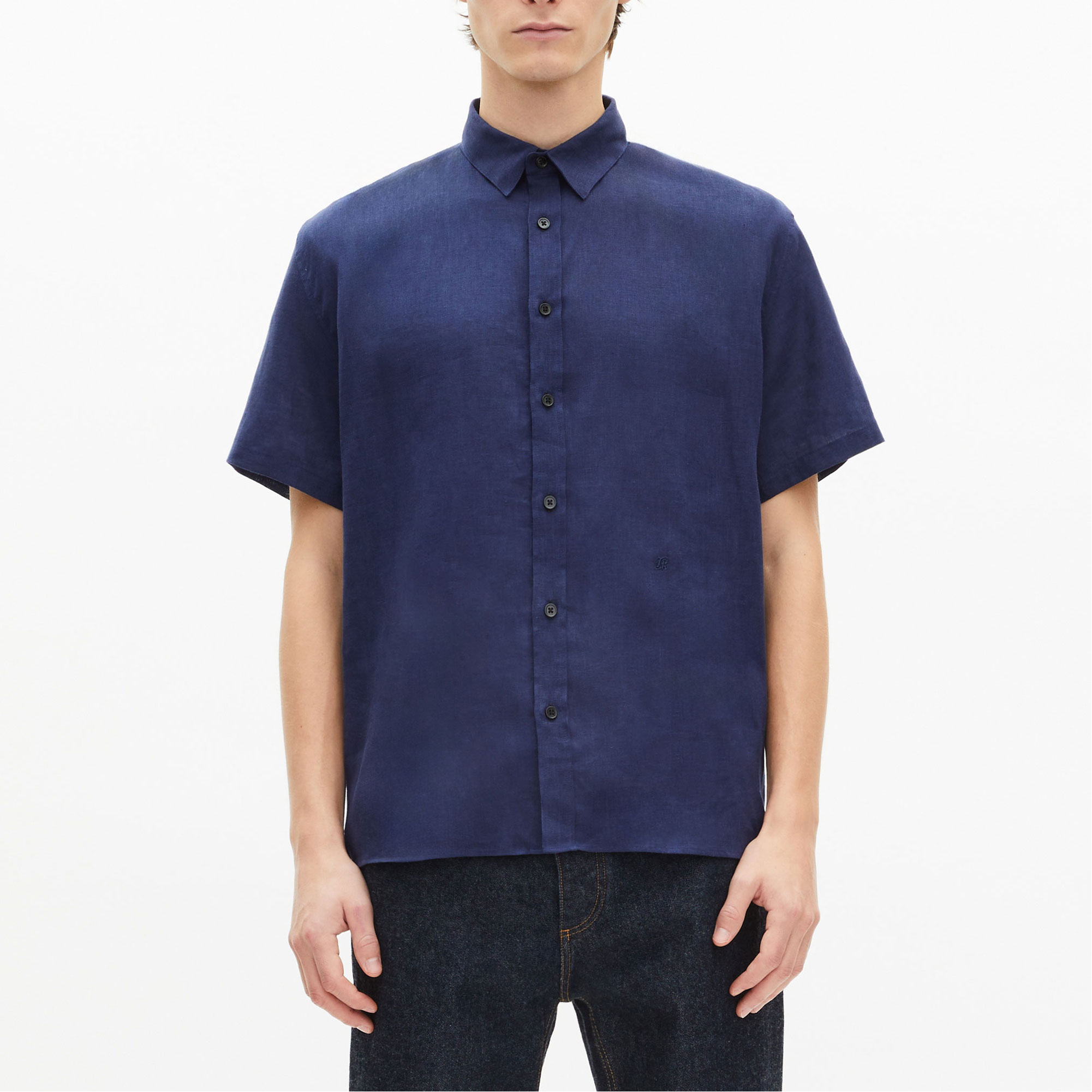 - Linen construction, classic collar, straight cut, American button placket, short sleeves, tone-on-tone logo embroidery