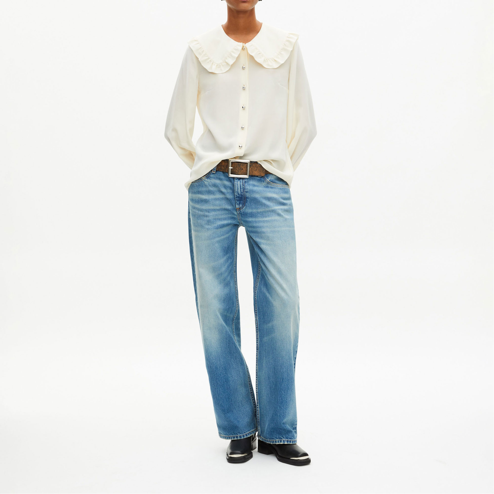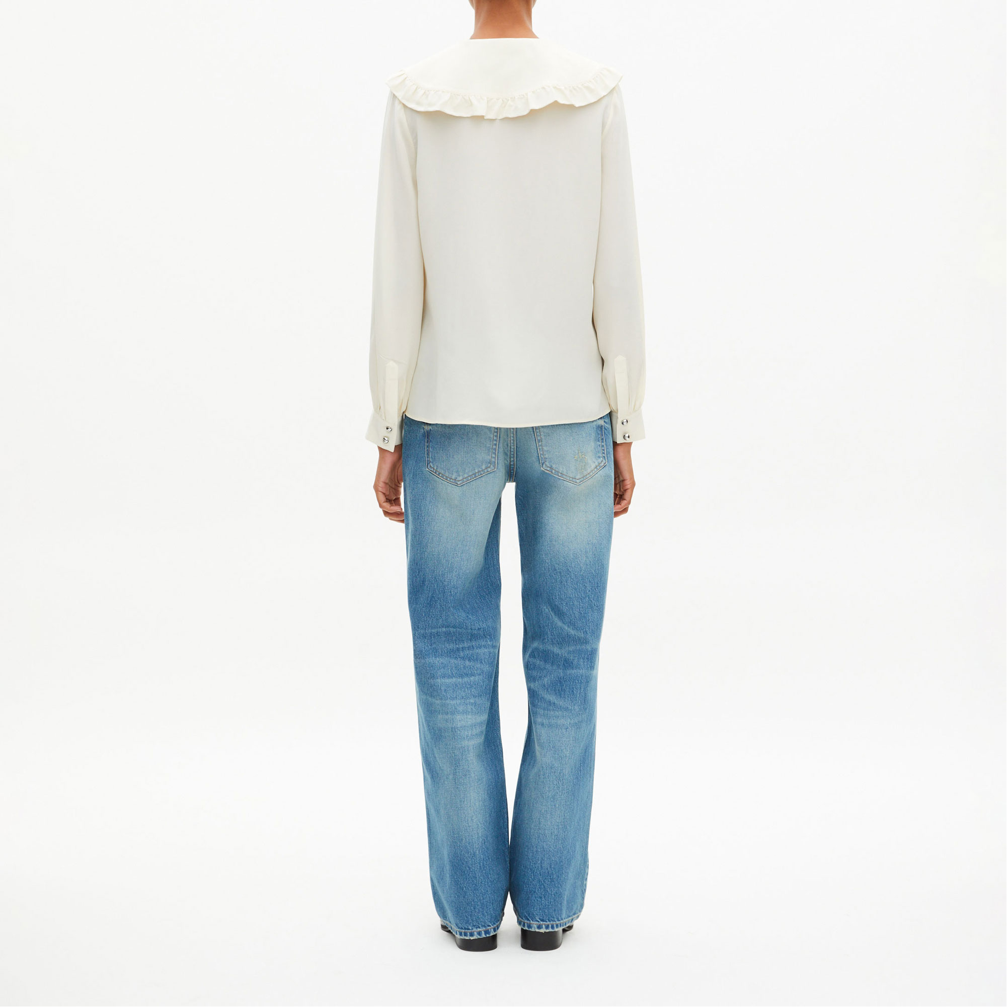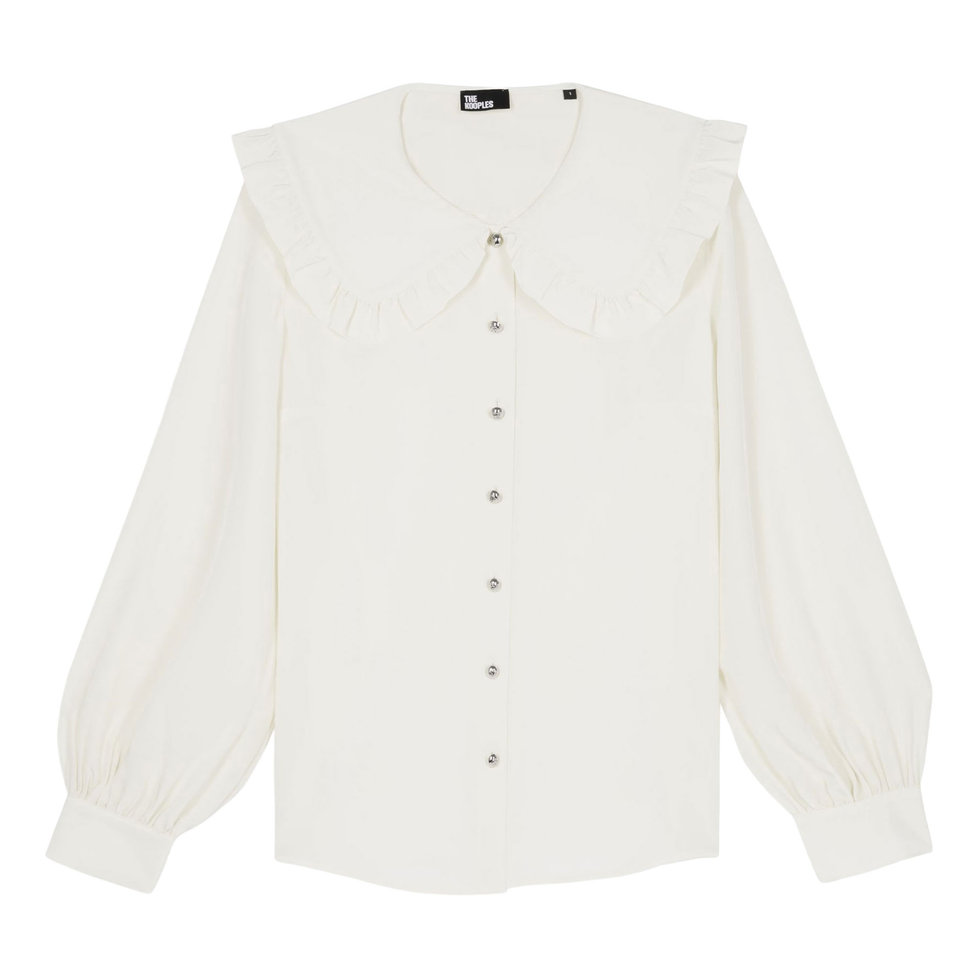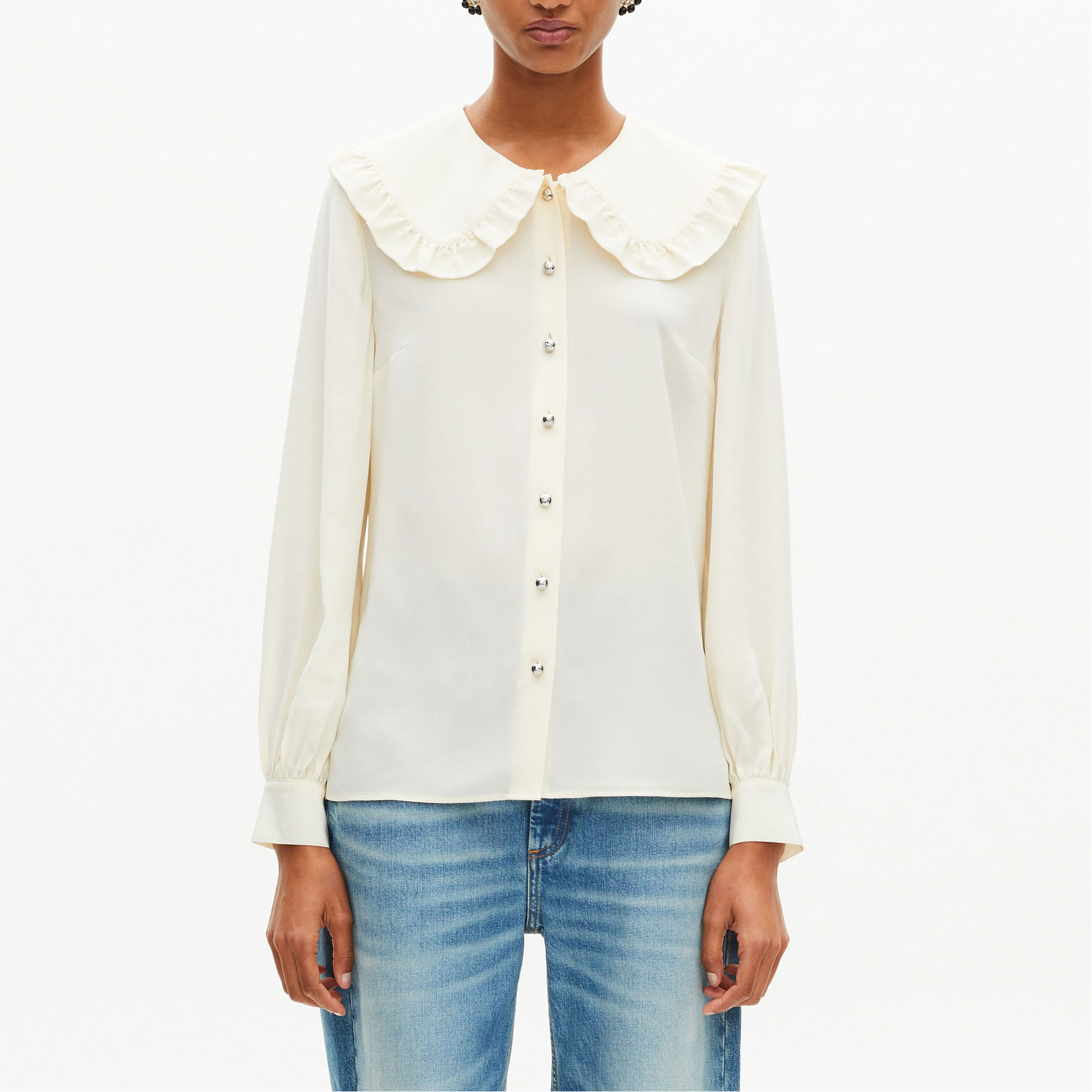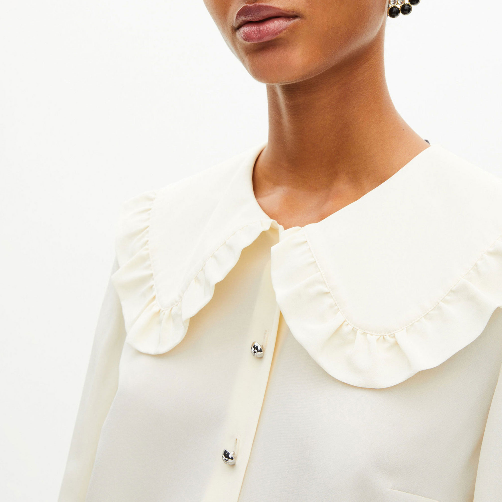 - Silk construction, straight cut, wide collar, ruffle details, buttoned cuffs
