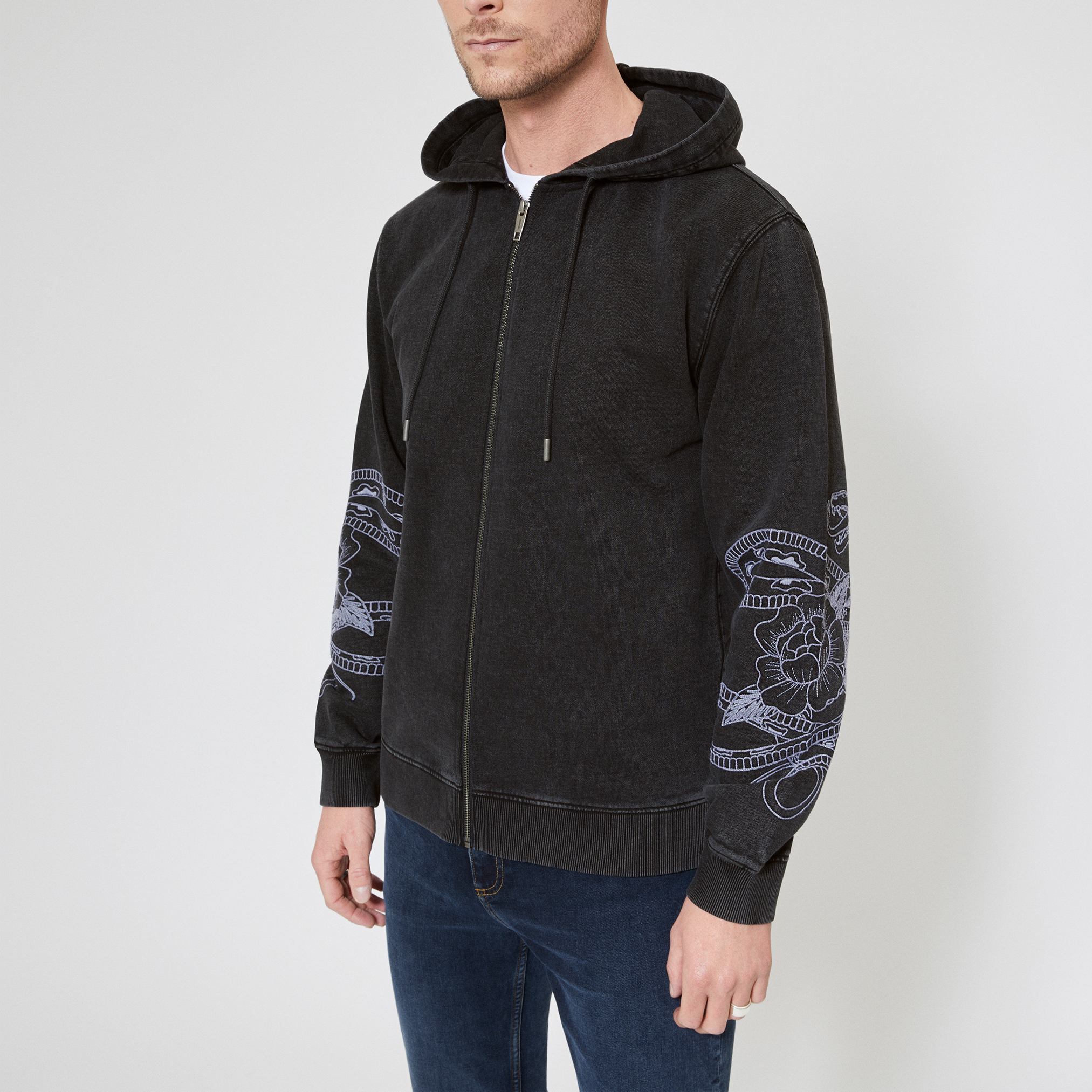 - Straight cut, zip closure, hood with drawstring, long sleeves, contrast snake embroidery on sleeves, ribbed edges