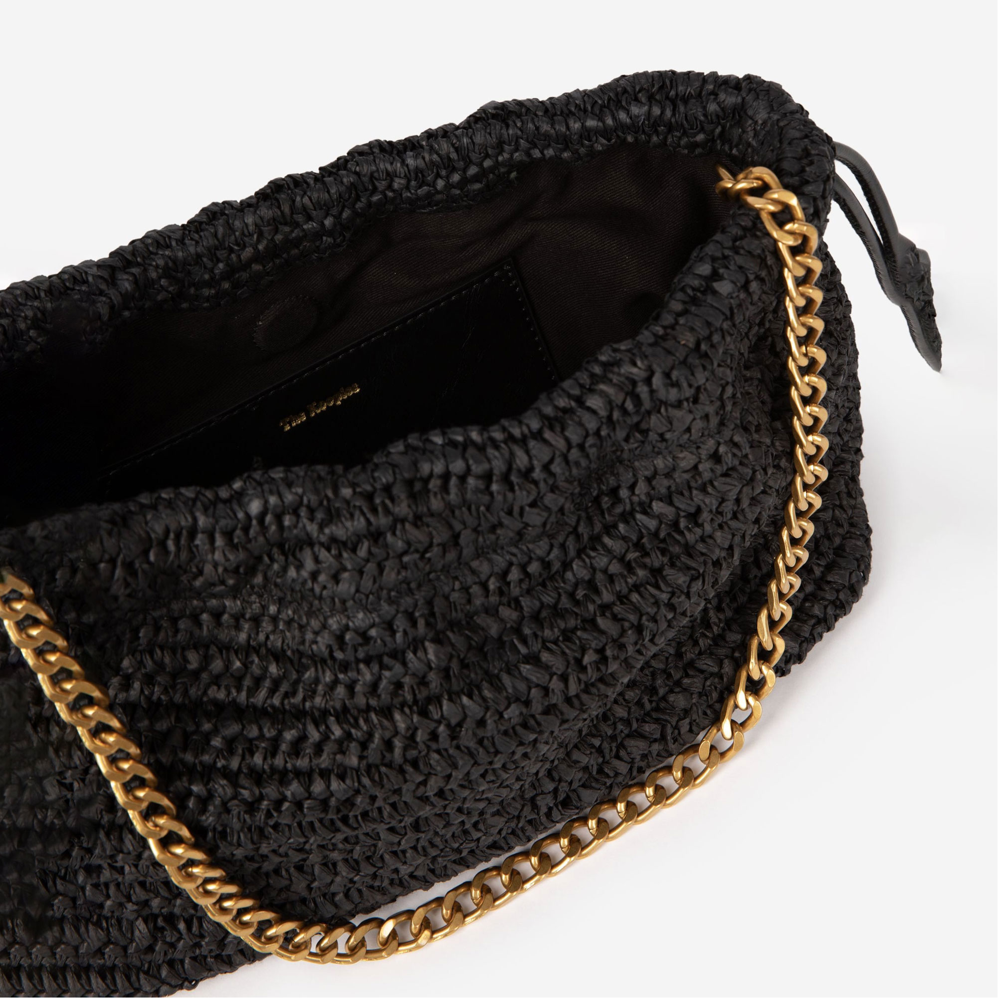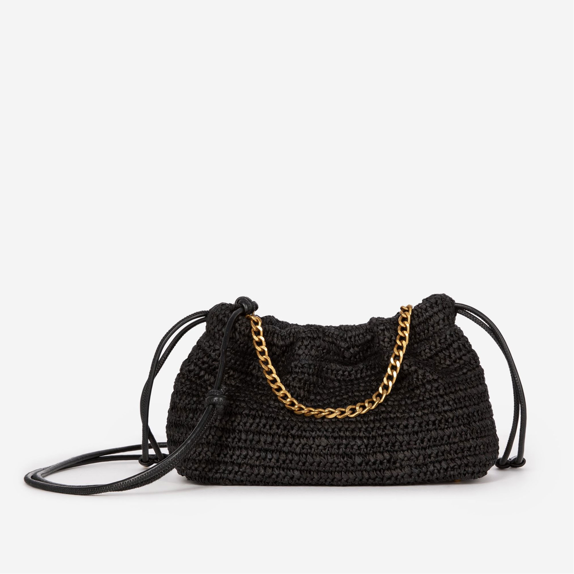 - Raffia, gold-tone metalwork, chain for shoulder carry, removable shoulder strap, magnet closure, slide with drawstring