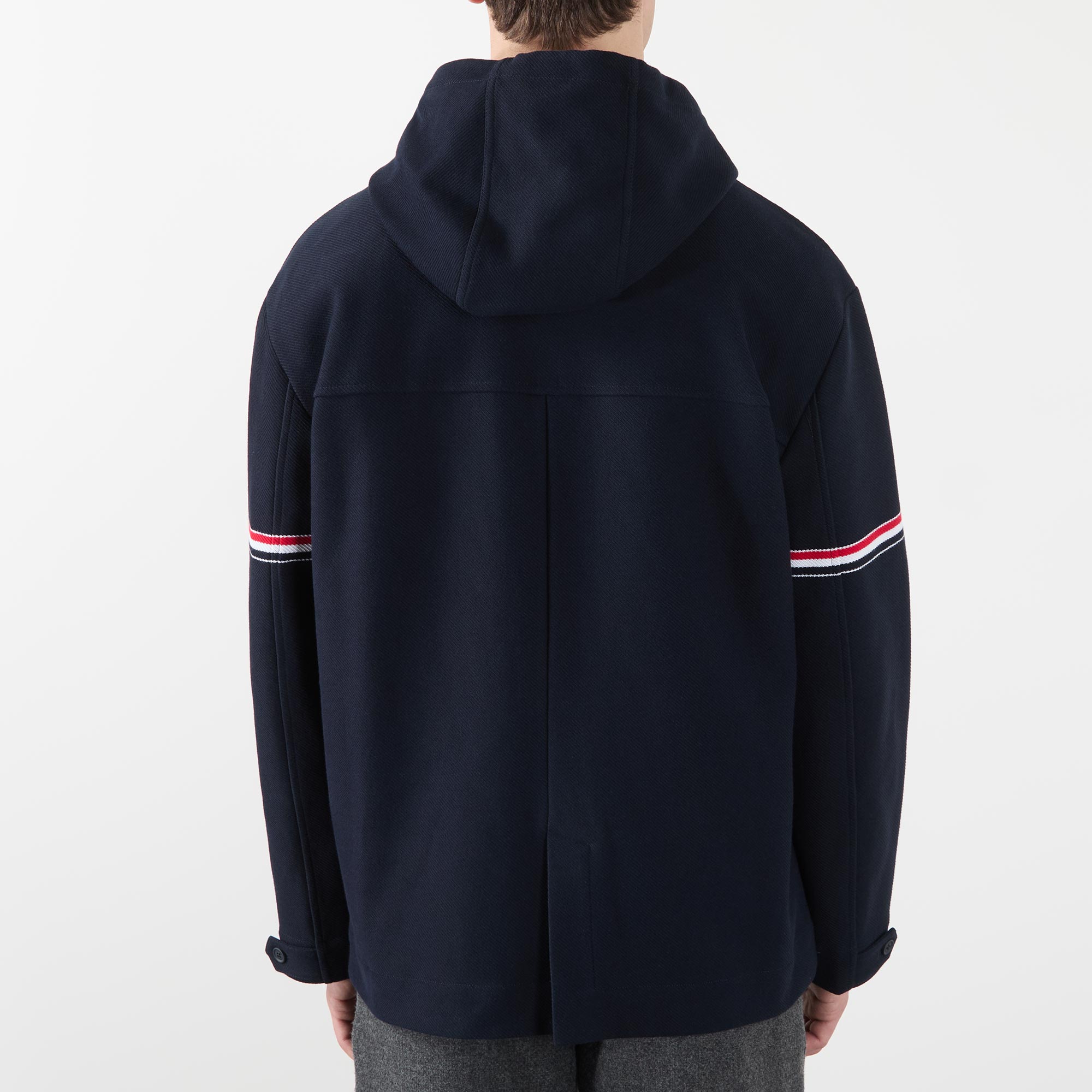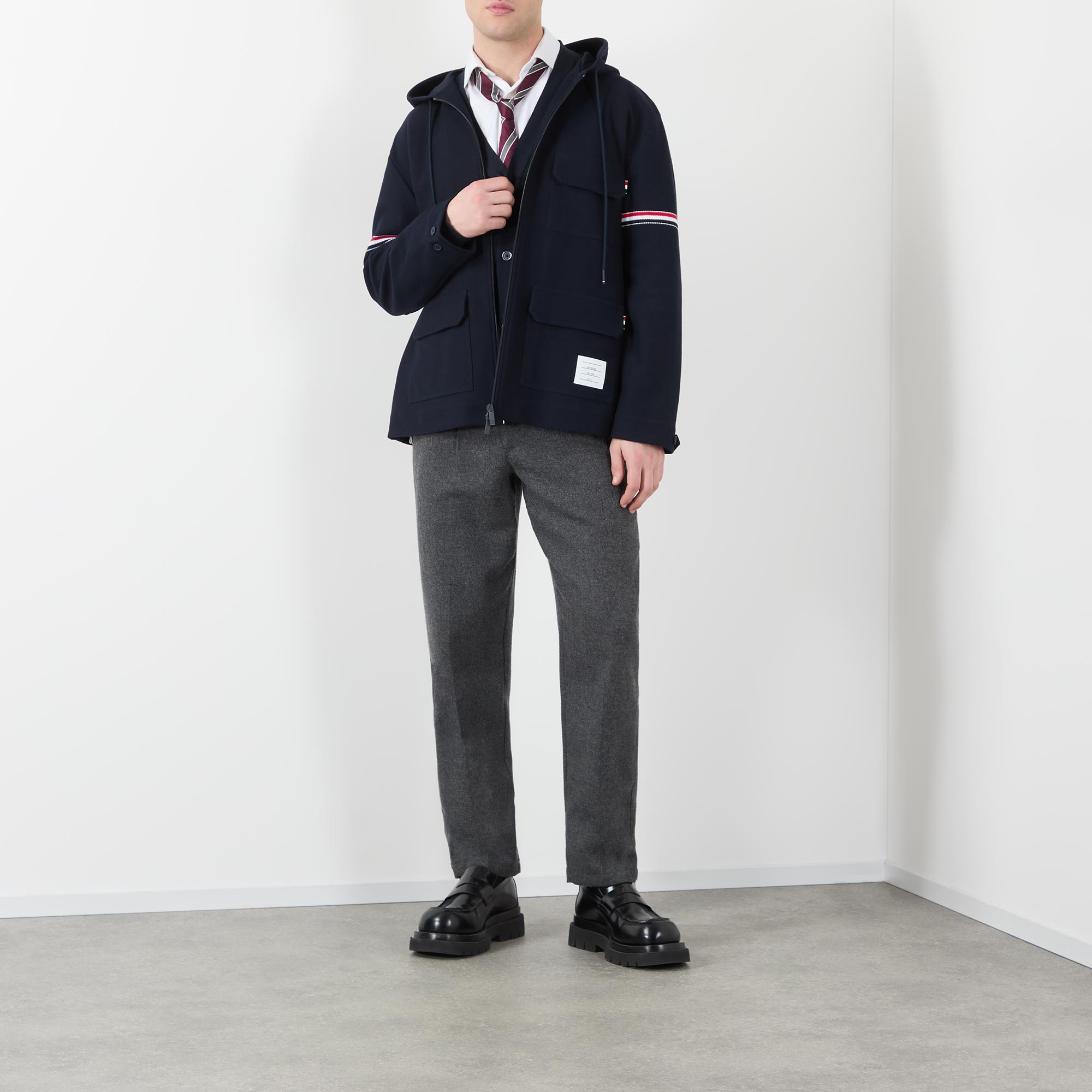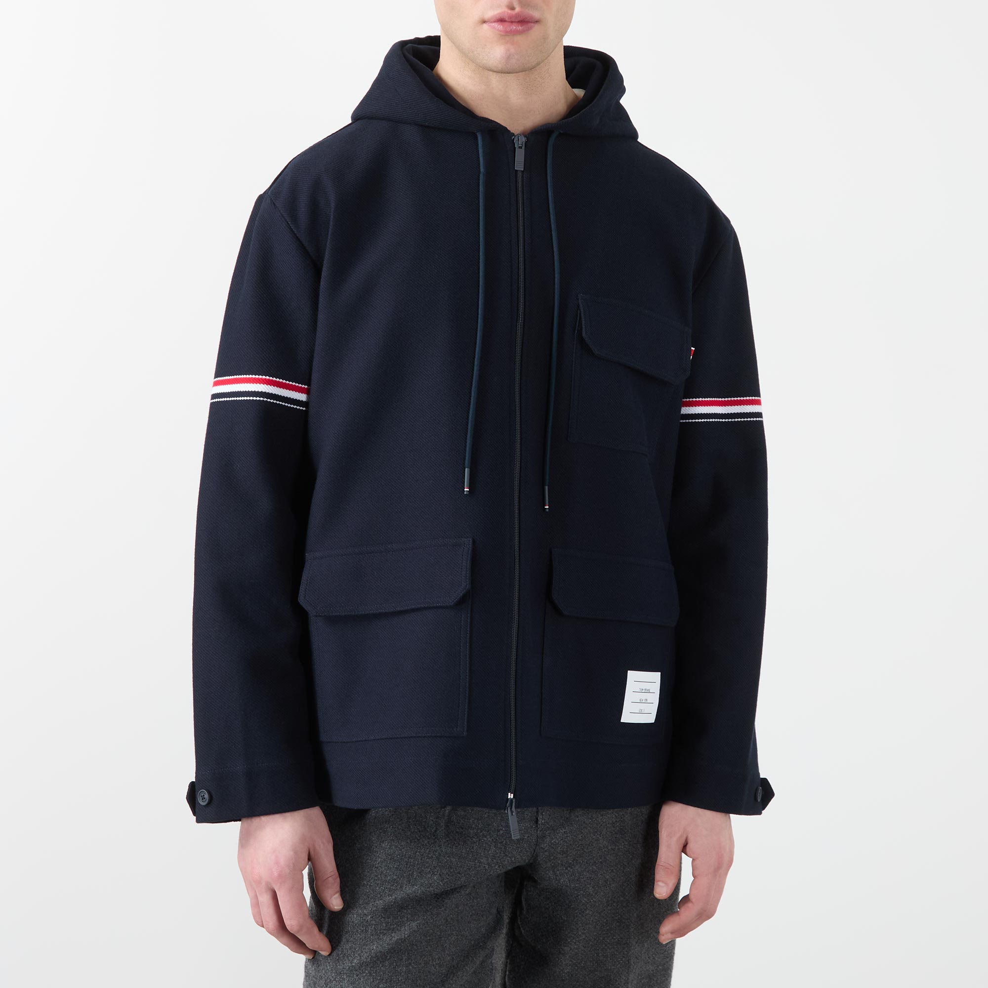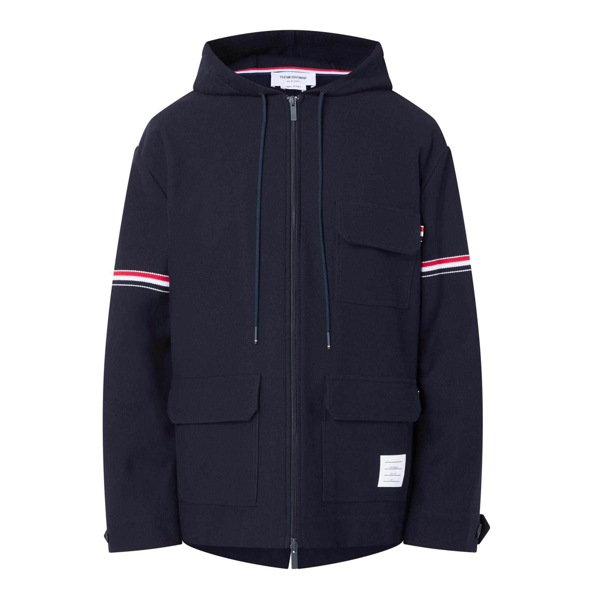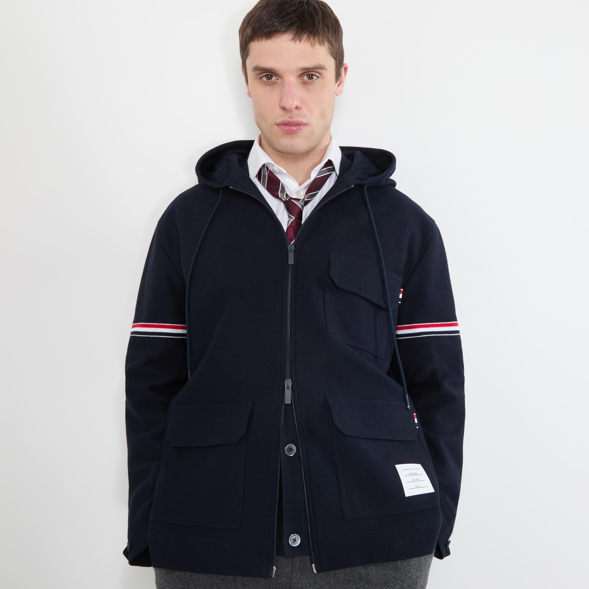 - Hood with drawstring adjustable fit, two-way zip fastening, tab adjustable cuffs, multiple patch pockets, stripe armband details, vent to the back, technical fabric