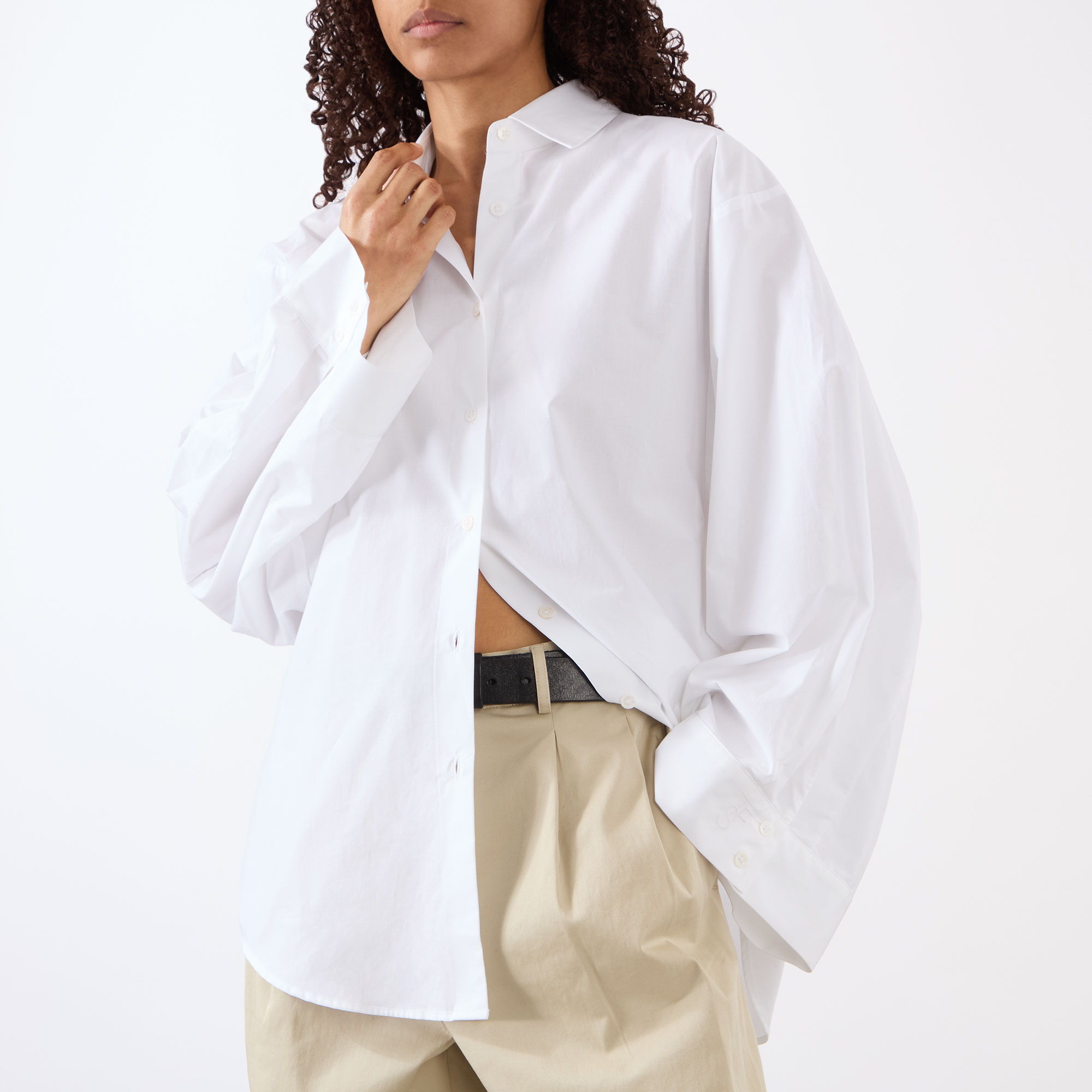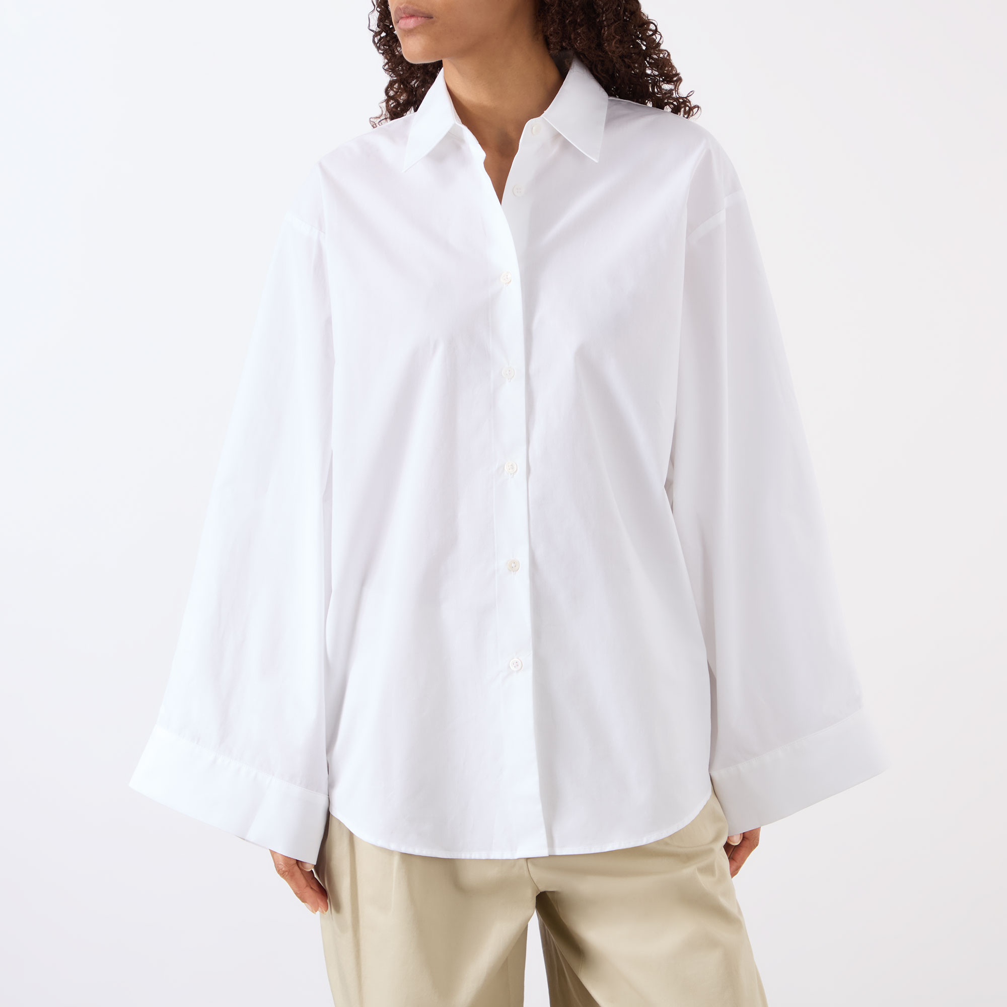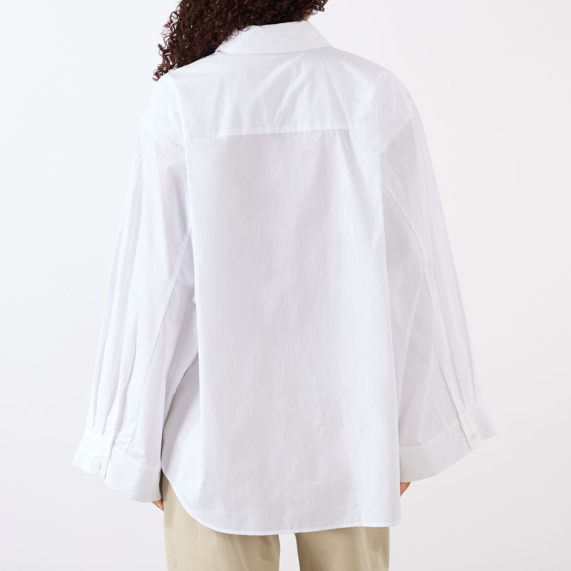 - Point collar, dropped shoulders, long wide sleeves, pleat detailing, buttoned cuffs, front button placket, curved hem, tonal stitching