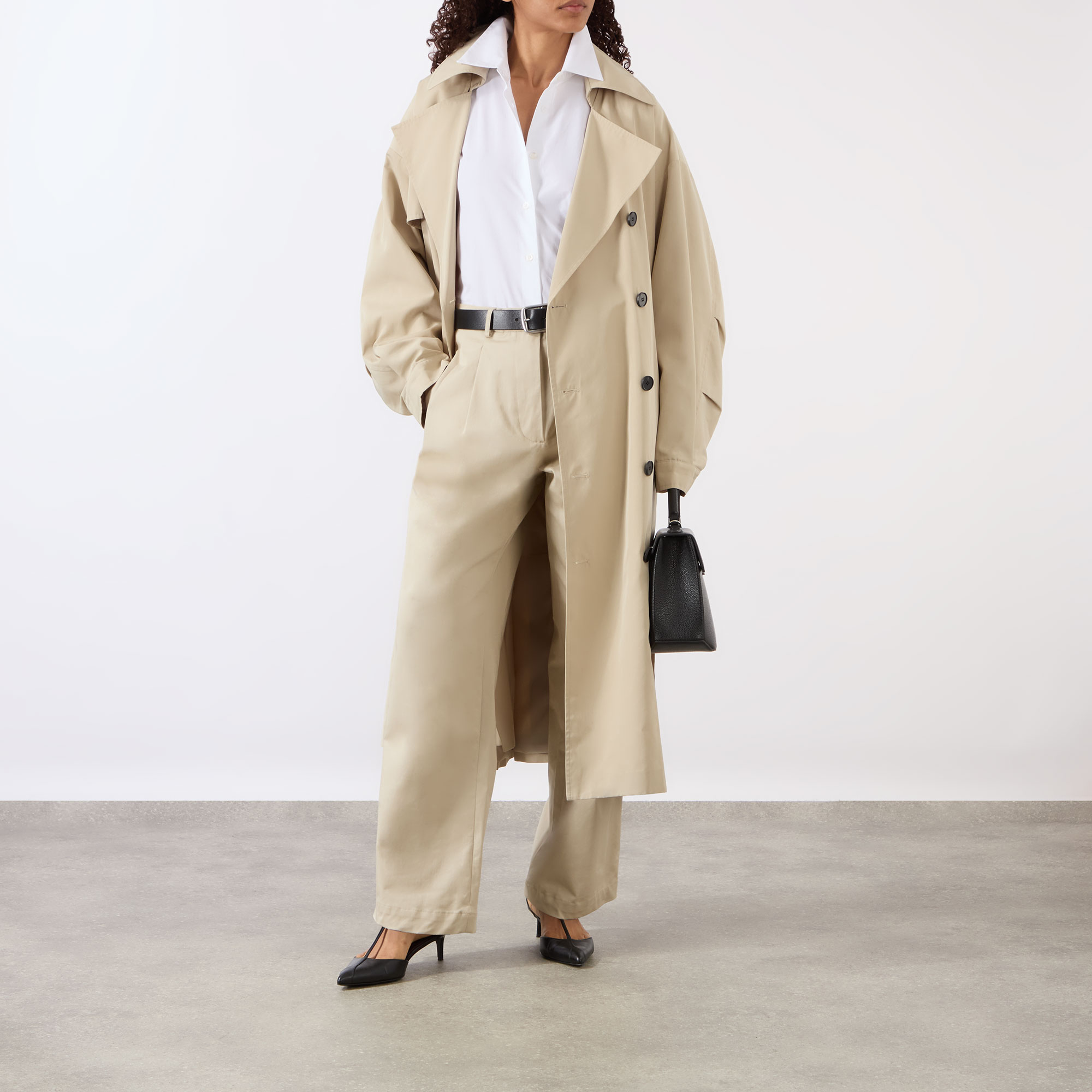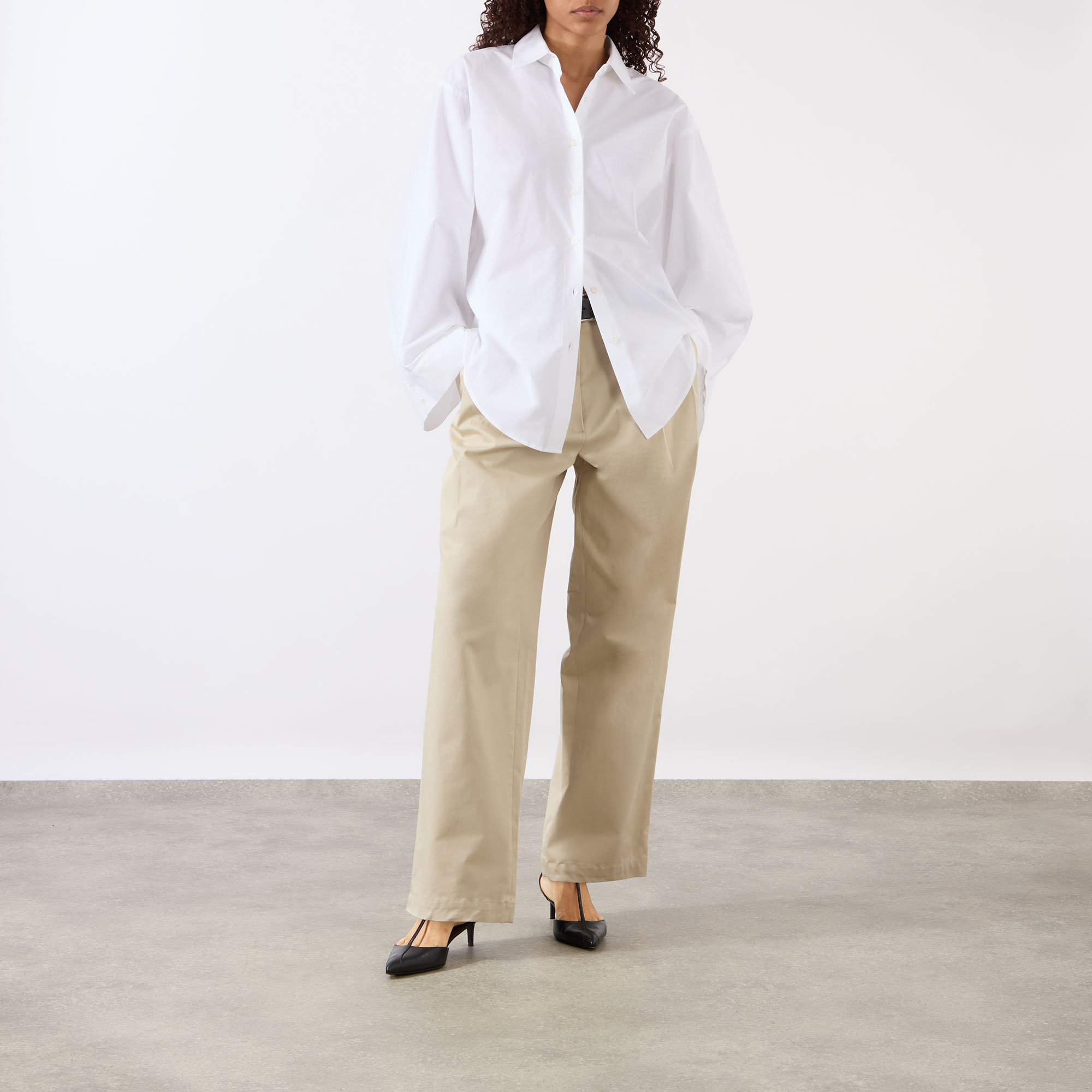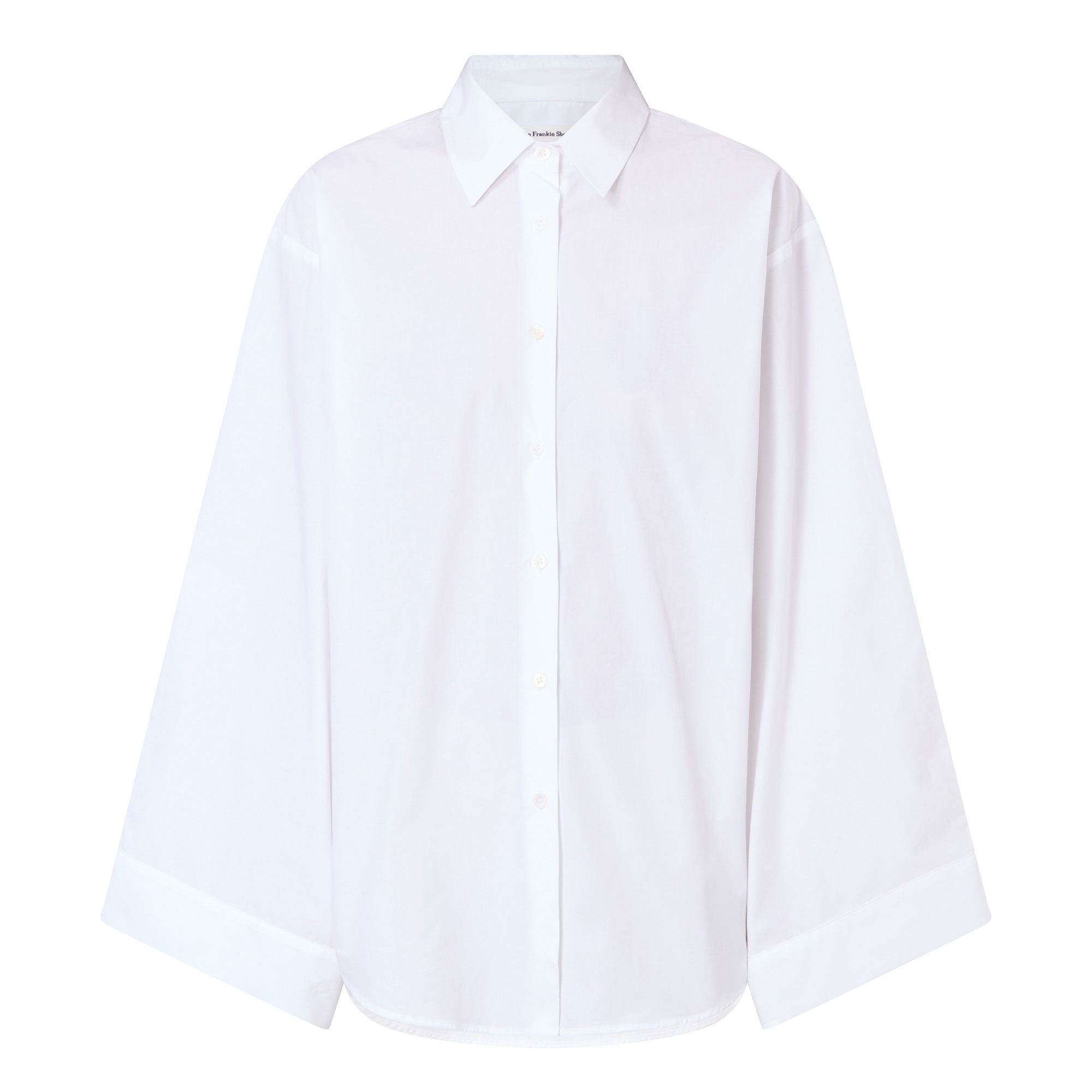 - Point collar, dropped shoulders, long wide sleeves, pleat detailing, buttoned cuffs, front button placket, curved hem, tonal stitching