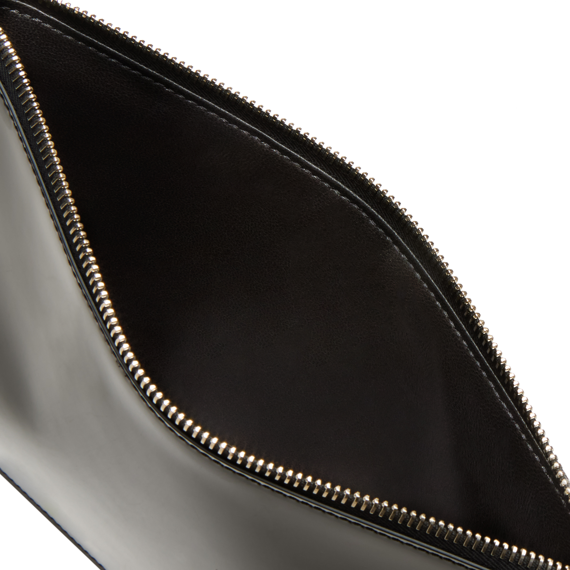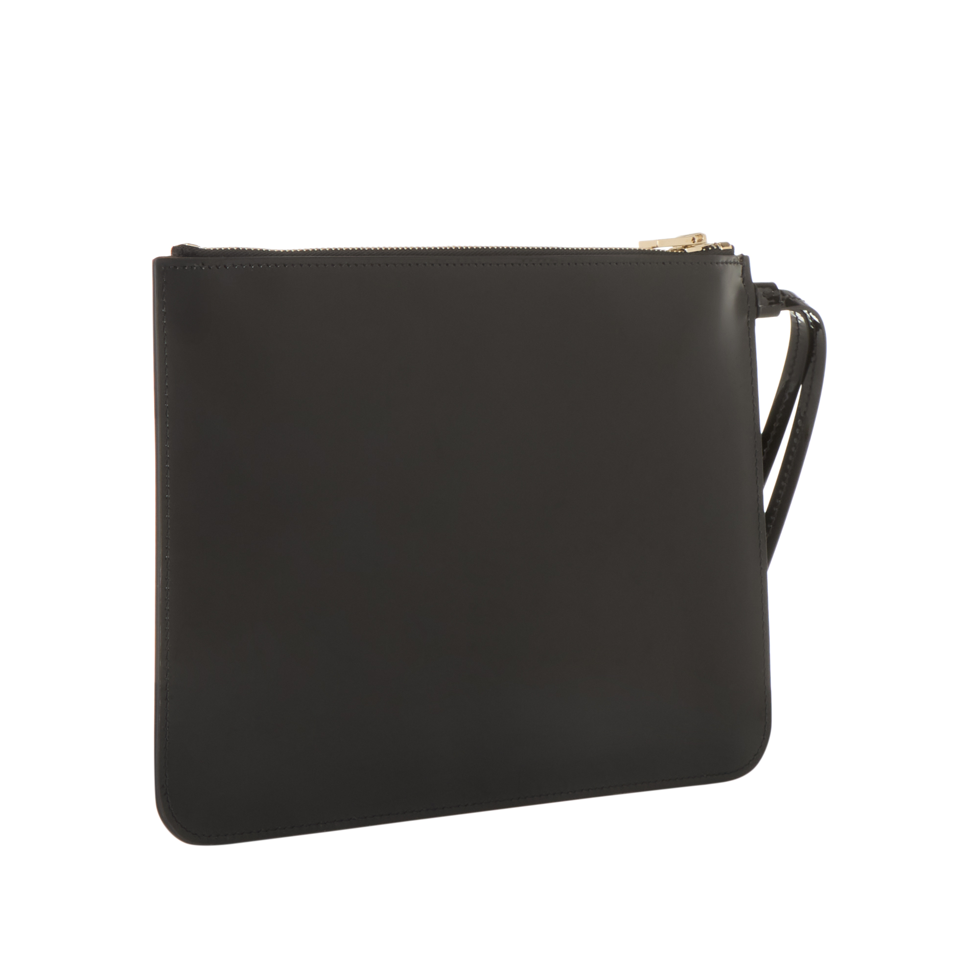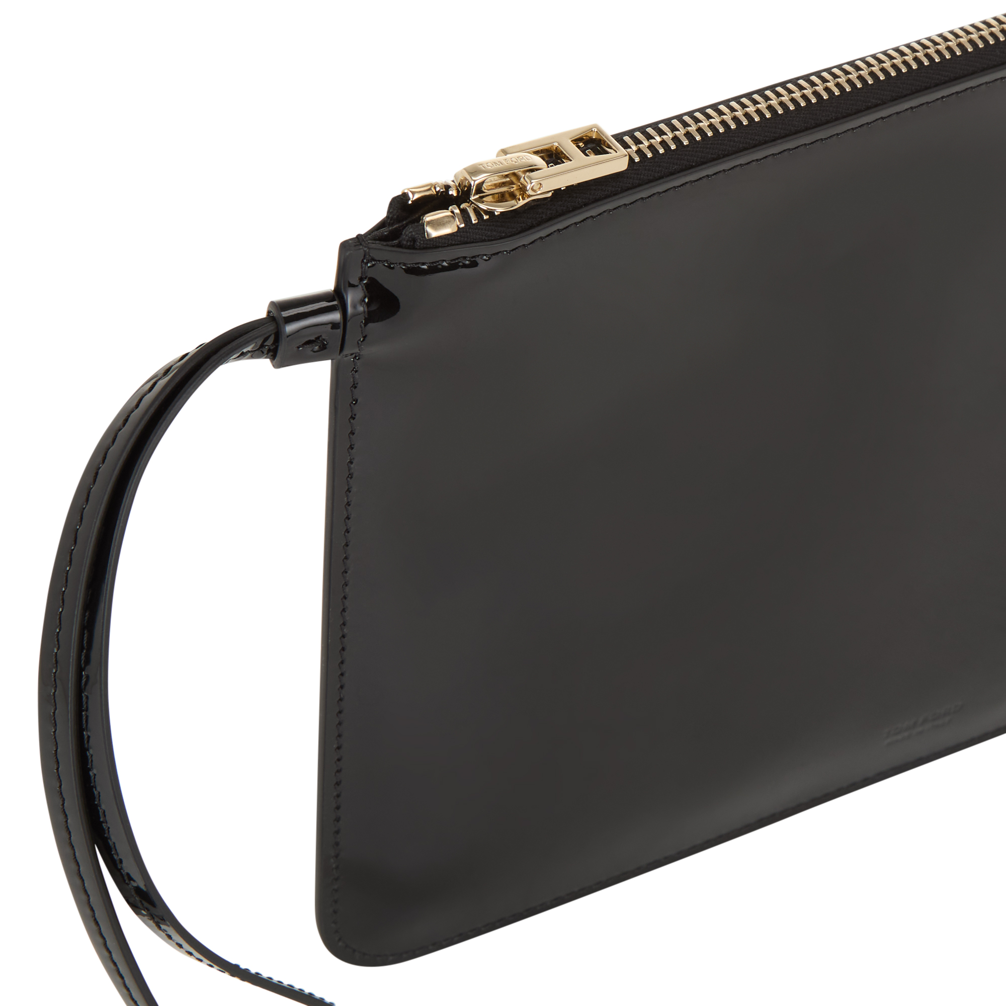 - Top zip fastening, gold-tone hardware, slim silhouette, wrist strap, debossed logo at front, patent leather finish