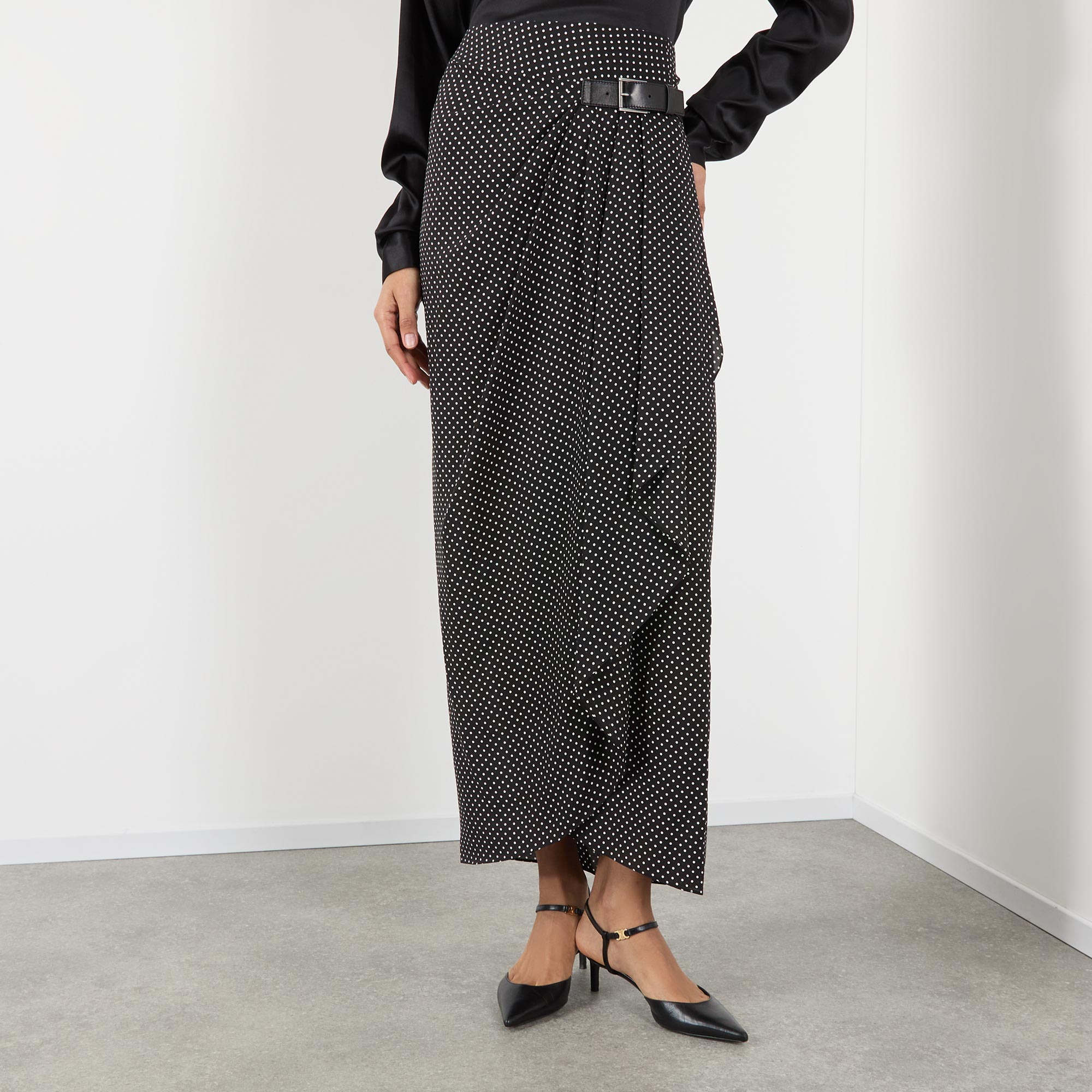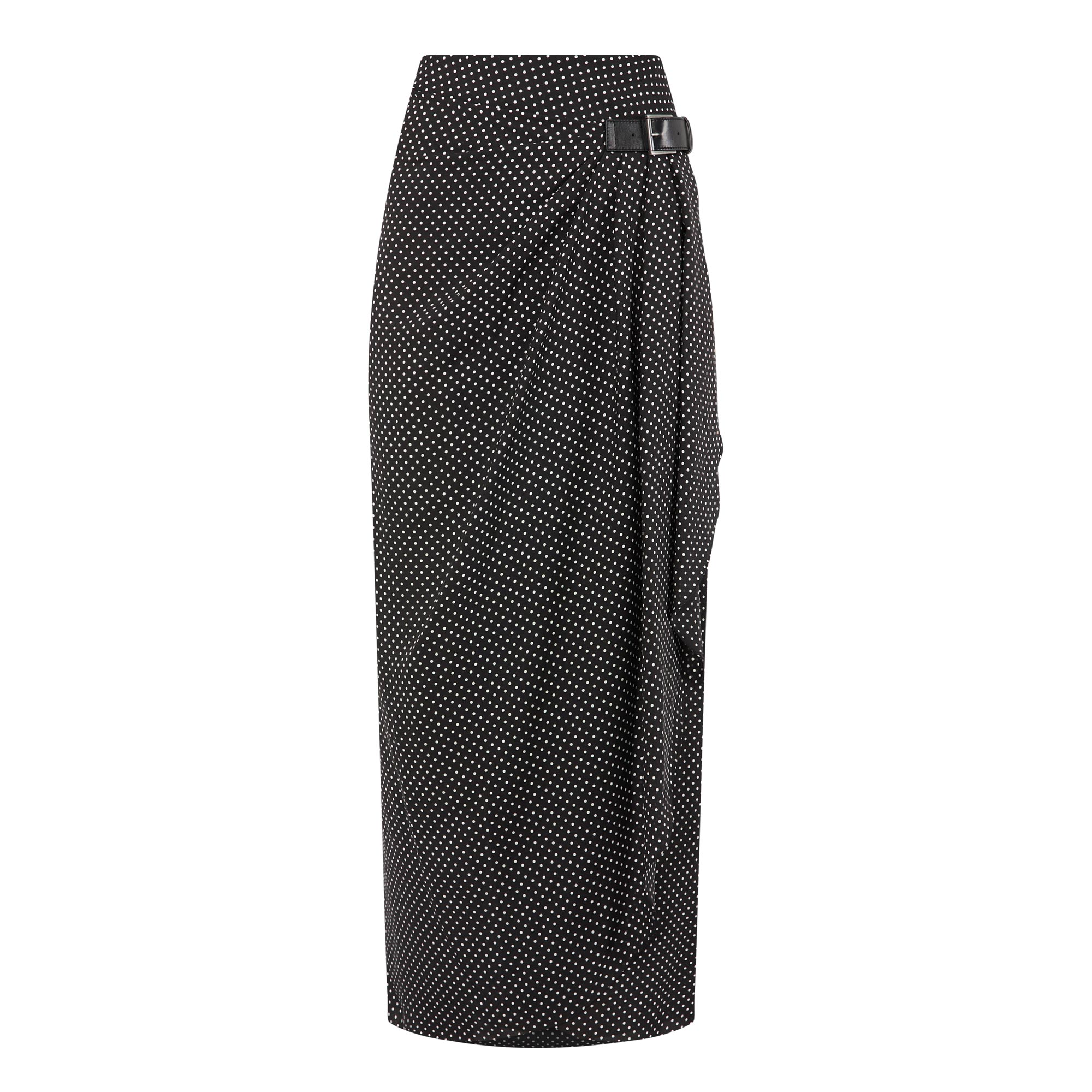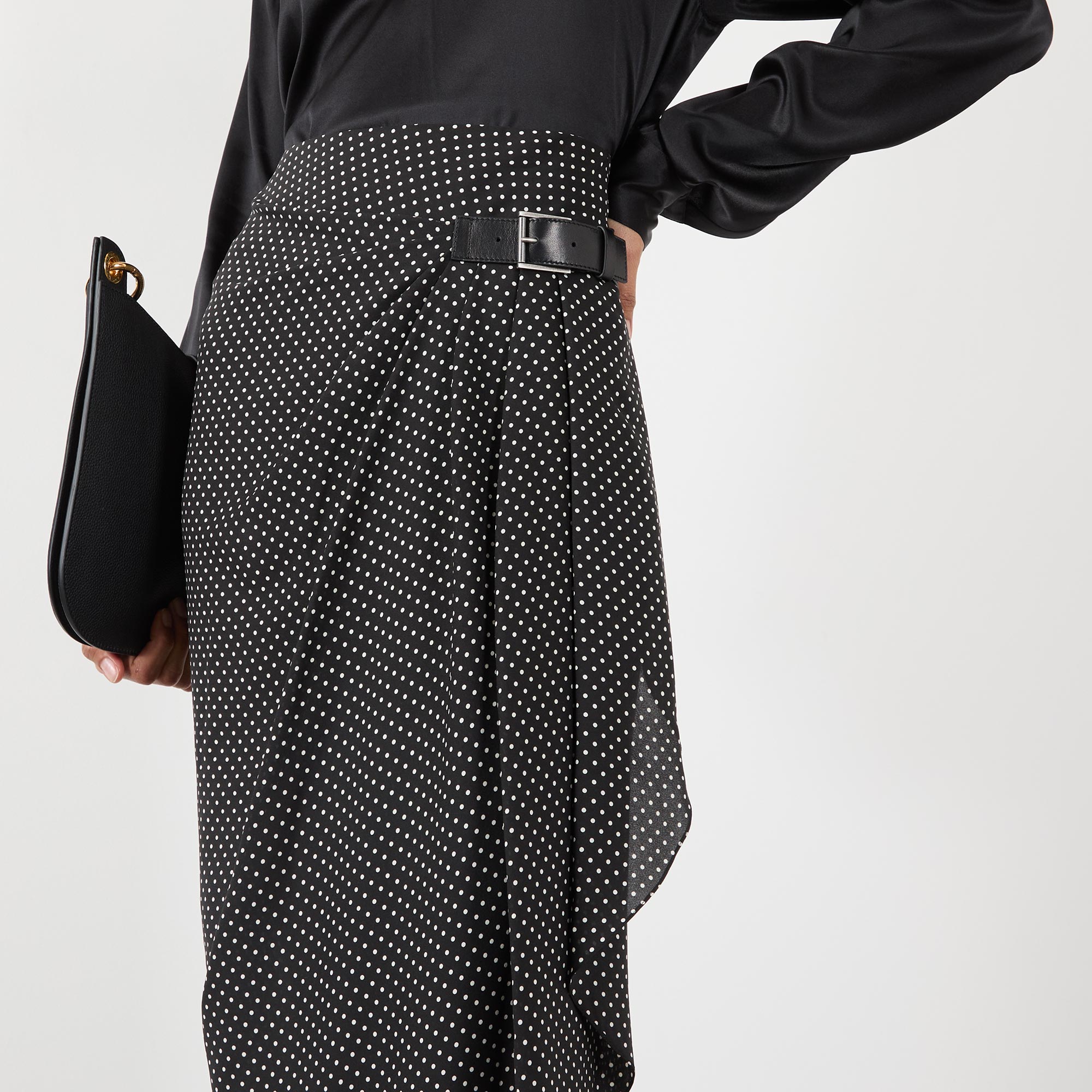- High-rise, wrap style design with gathered detailing, leather belt fastening, silver-tone hardware, asymmetric hem, polka dot print, midi length