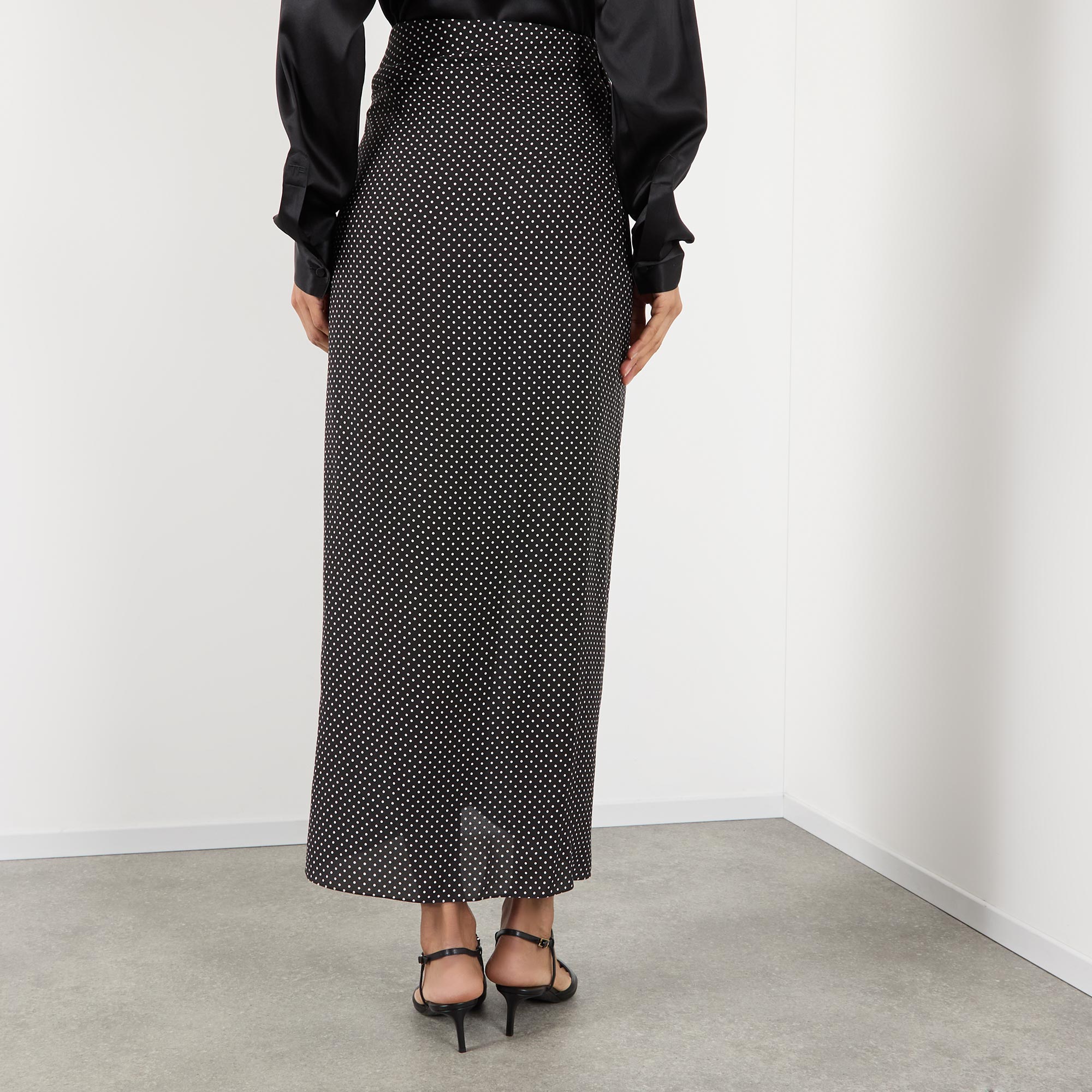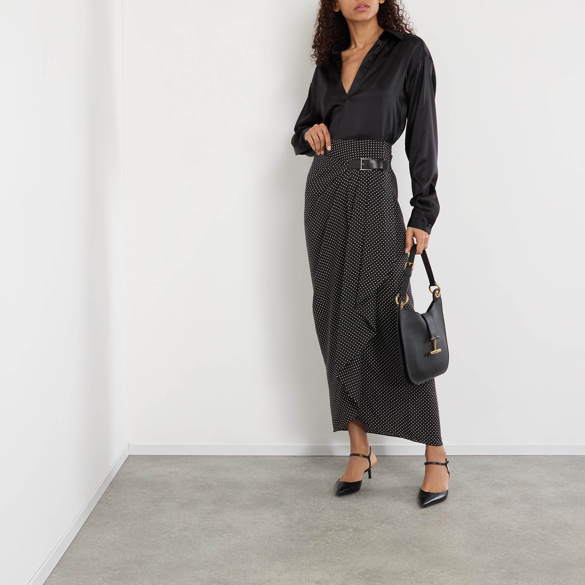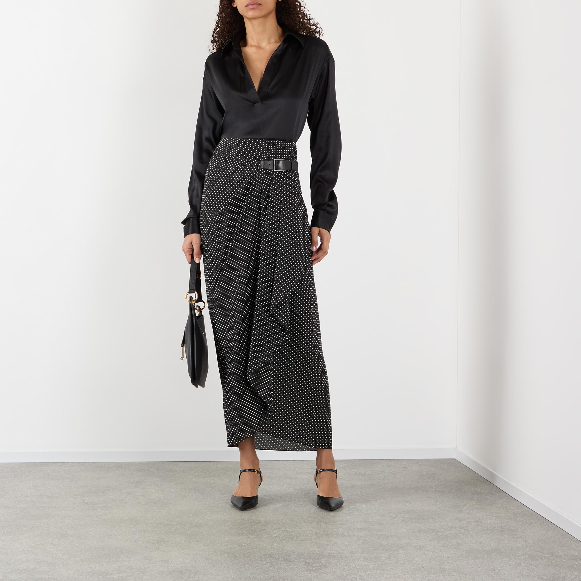 Tom Ford's SS26 collection offers a selection of sharp tailoring, with a healthy dose of flowing, feminine designs and fluid forms, take this skirt. Spun from pure silk and adorned in a polka dot pattern, the wrap-style design fastens with a leather belt, while gathered to one side creating an asymmetric hem for a relaxed edit.