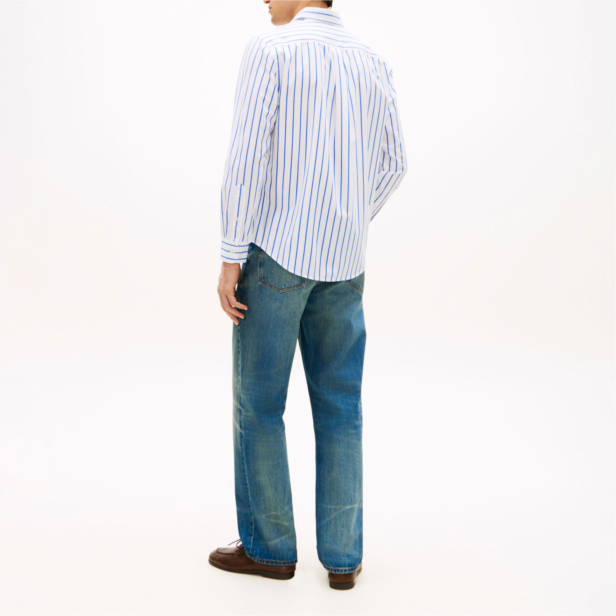 • Flex-enhanced, peached poplin fabric, all-over vertical stripes, button-down collar, rounded one-button cuffs, box pleat, shirttail hem, signature tape inside neckline, branding details, flag logo embroidery, long sleeves