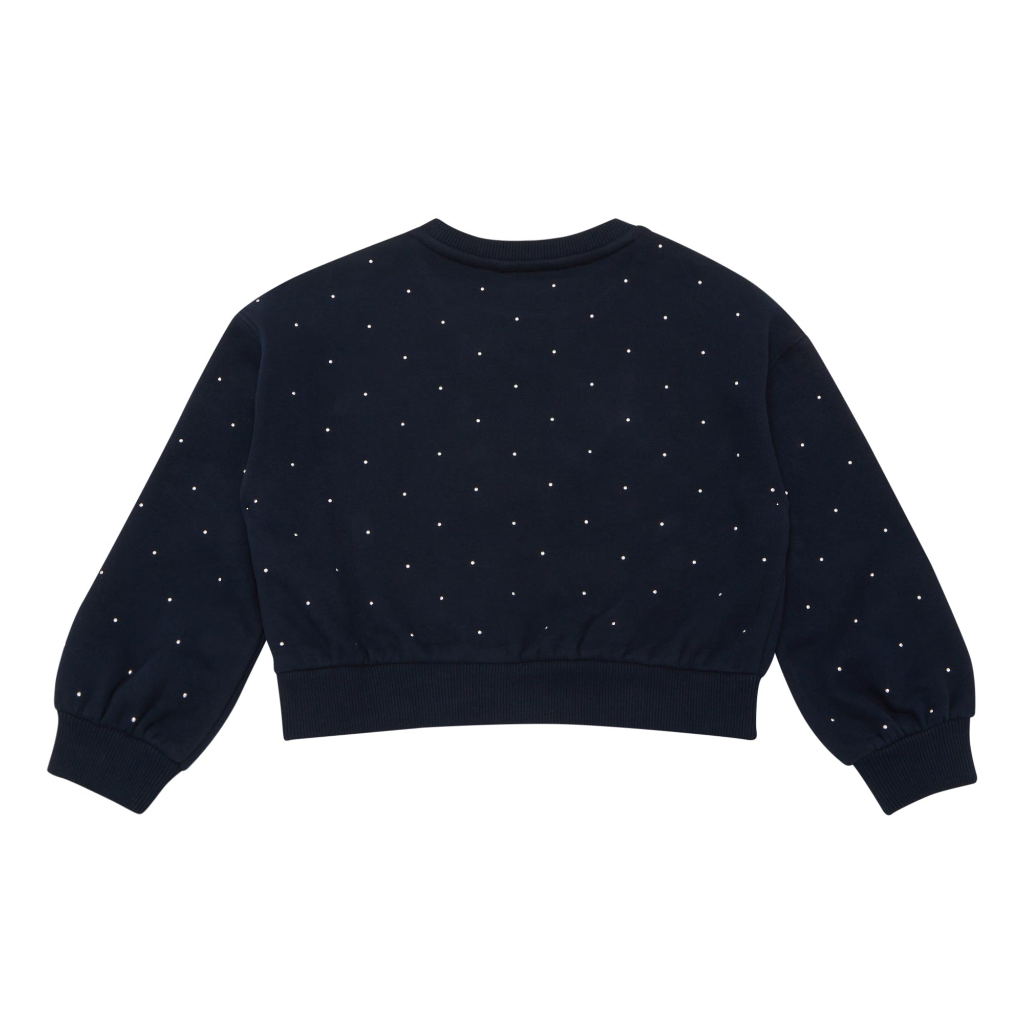• Flag logo, round neck, long sleeves, studded details, straight hemline