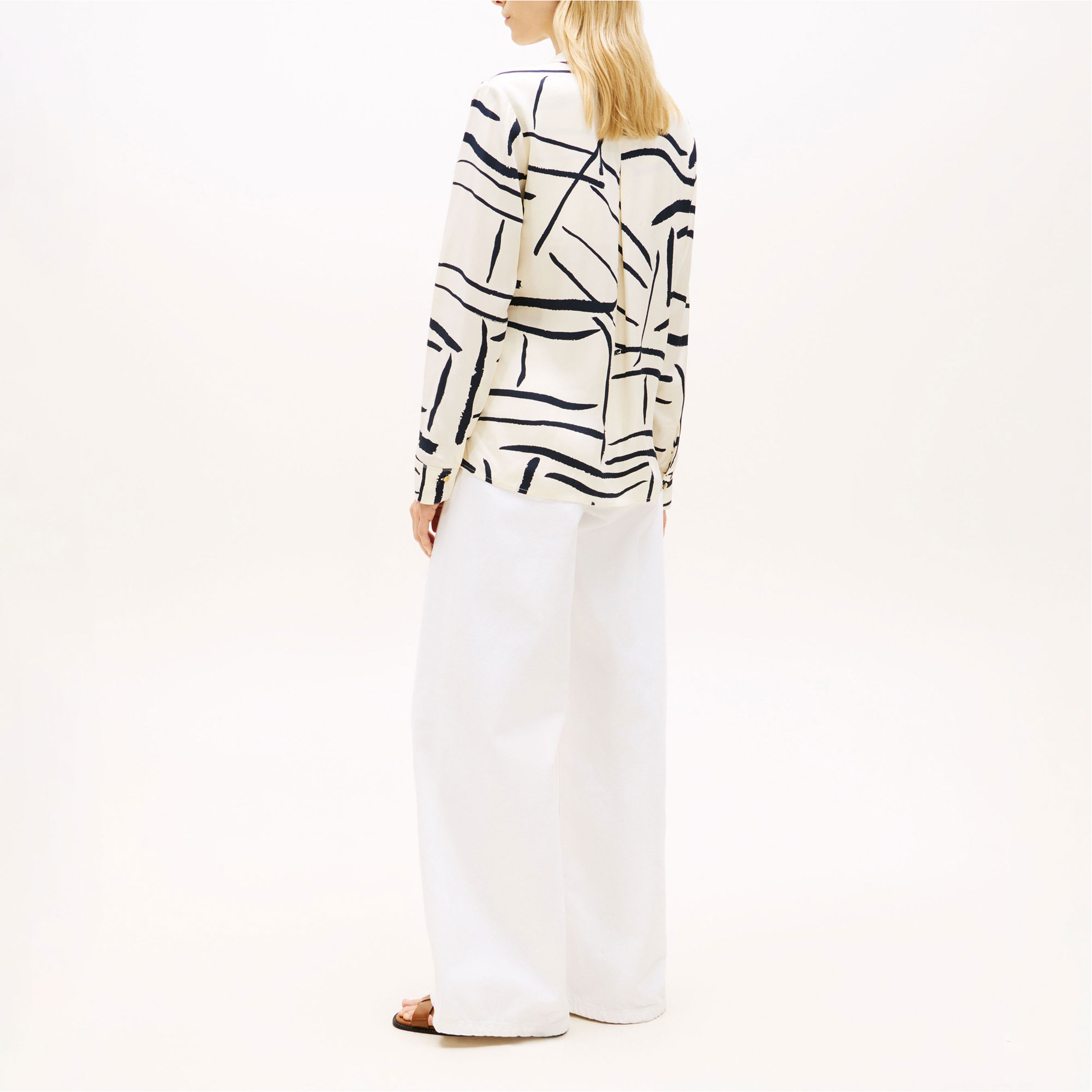 - Drapey twill, gold-tone embossed buttons, pleat on back, concealed placket, semi-spread collar, one-button cuffs, signature tape inside neckline, flag embossed on buttons