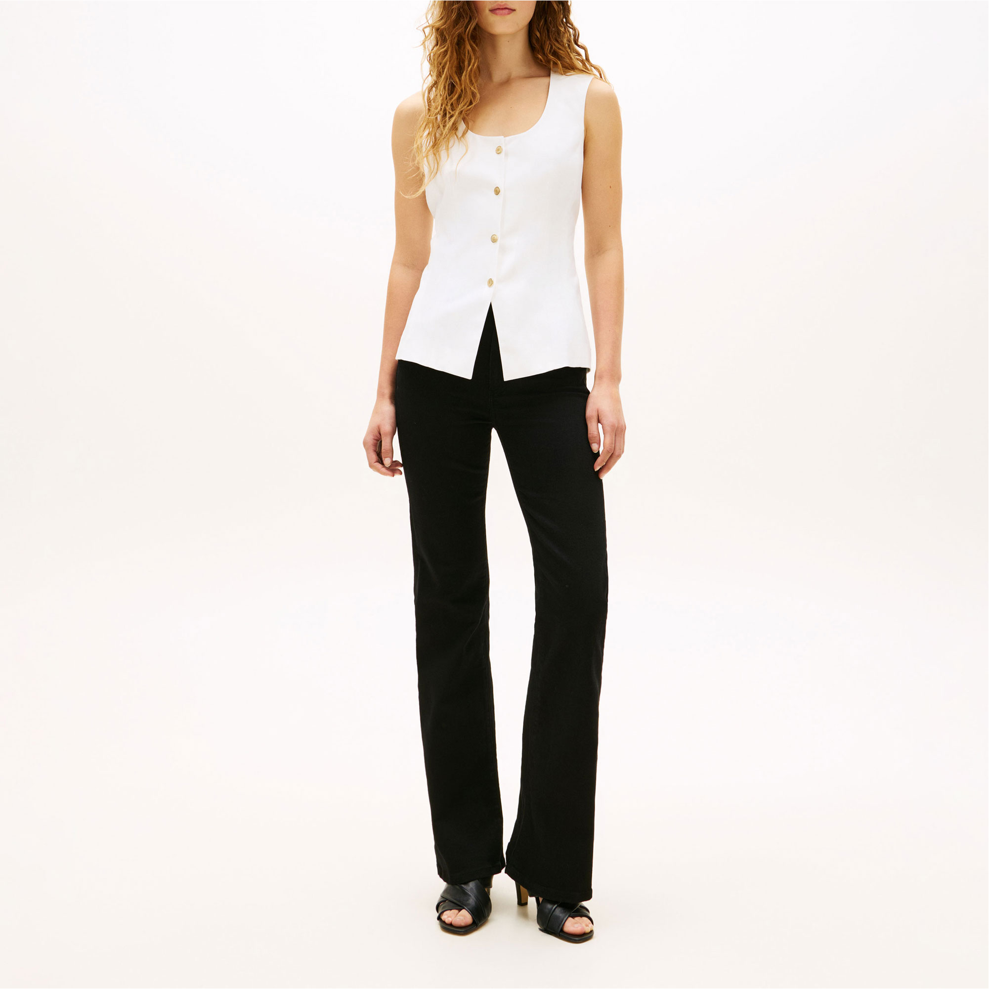 - Stretch linen-blend fabric, scoop neck, gold-tone buttons, fully lined, signature tape inside neckline, logo flag embossed on buttons