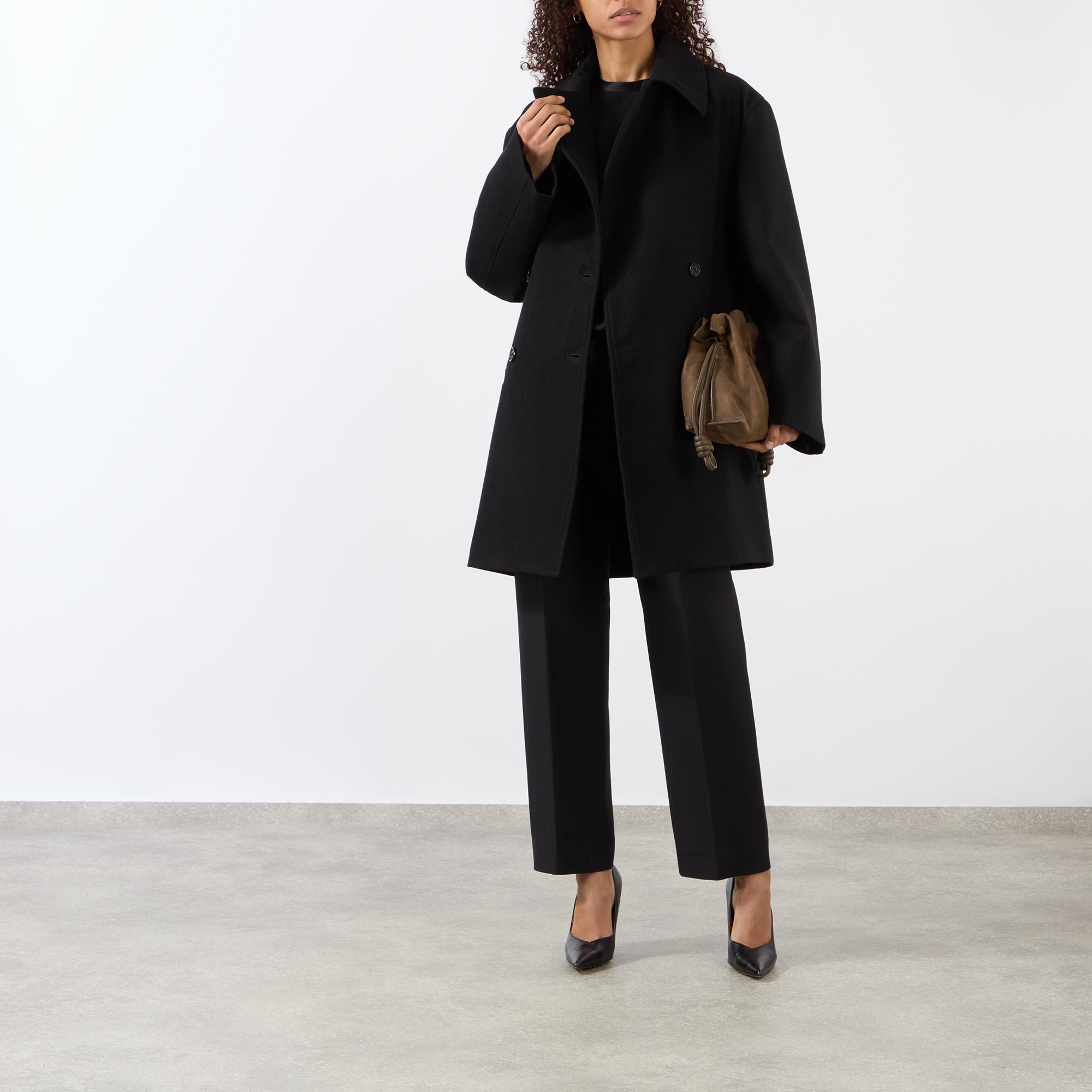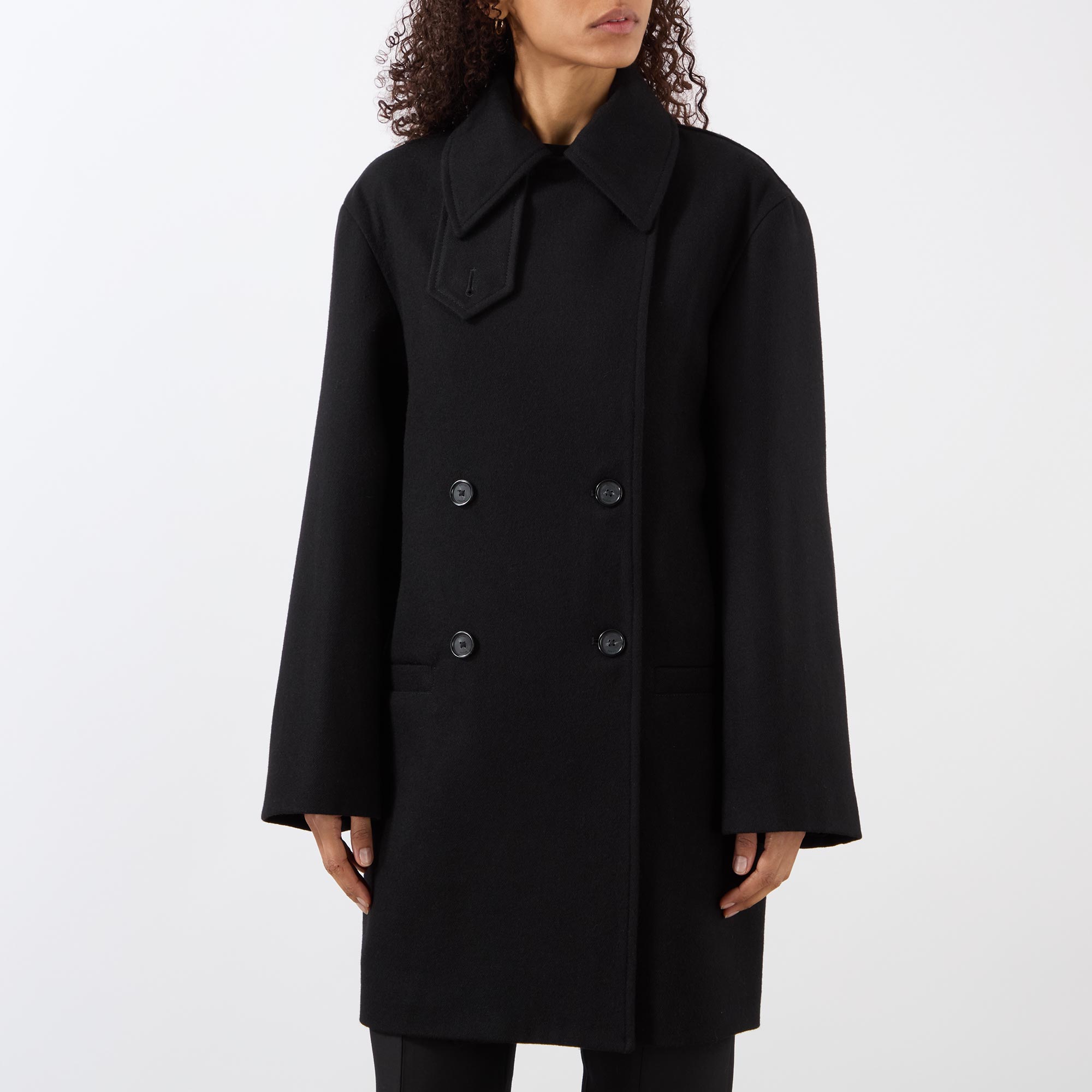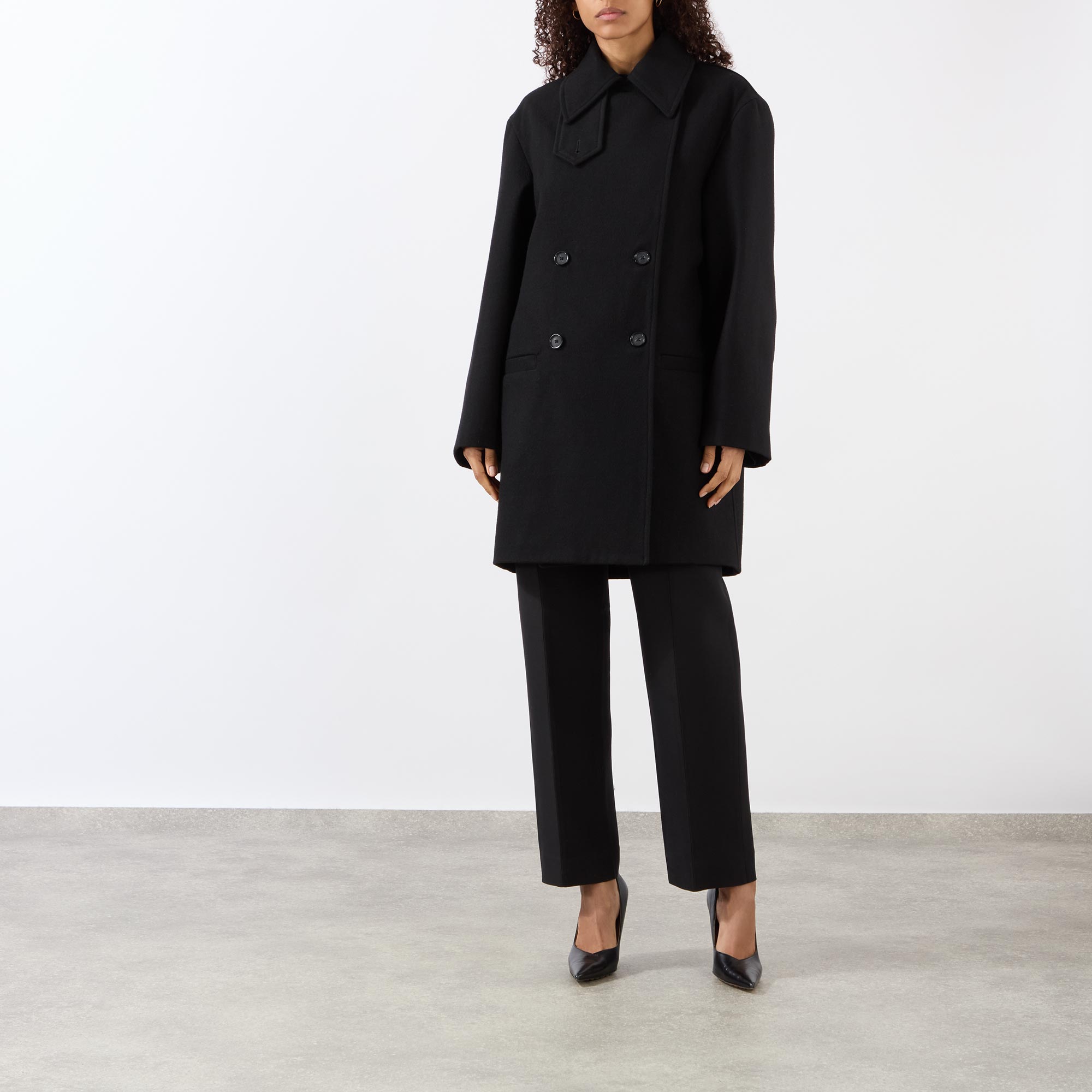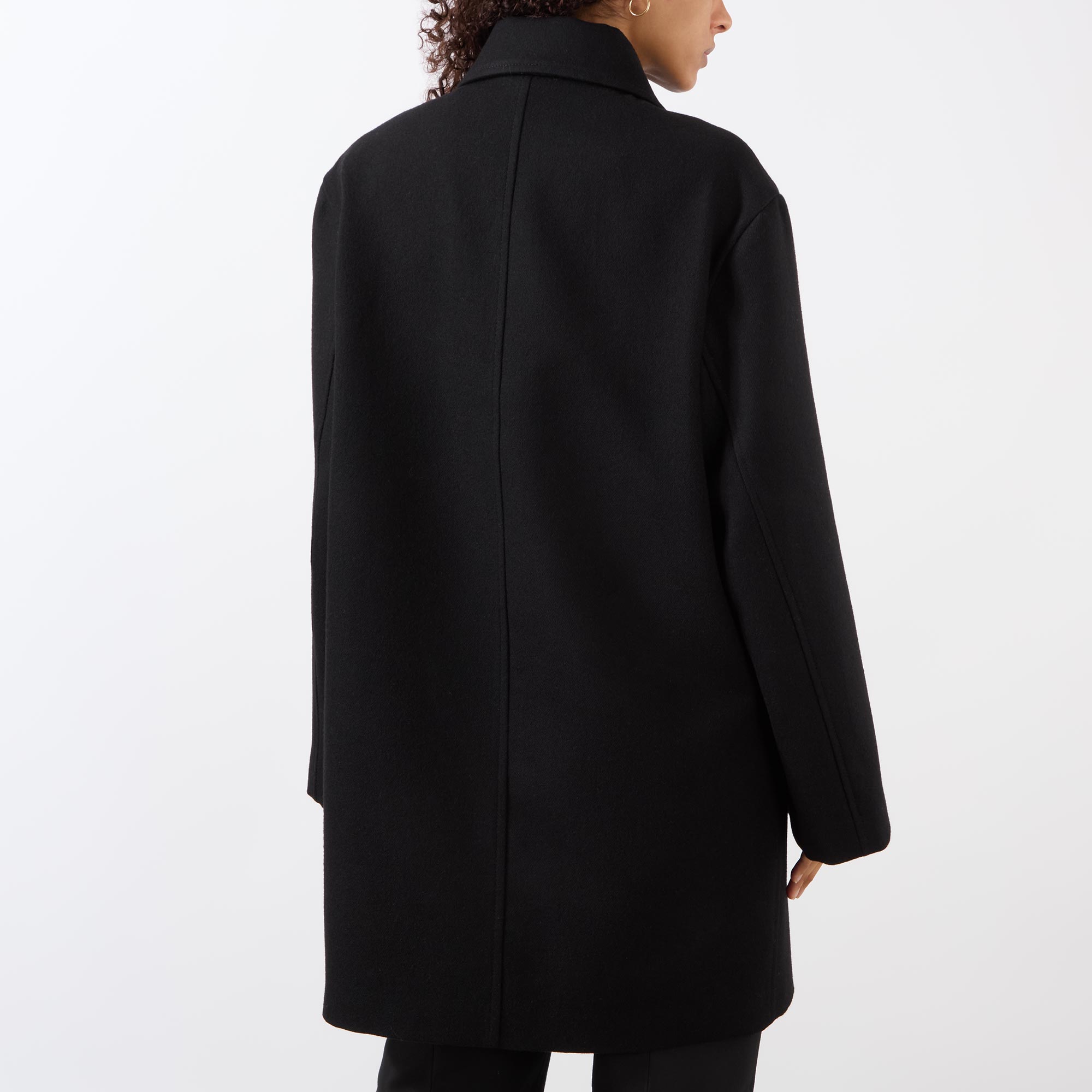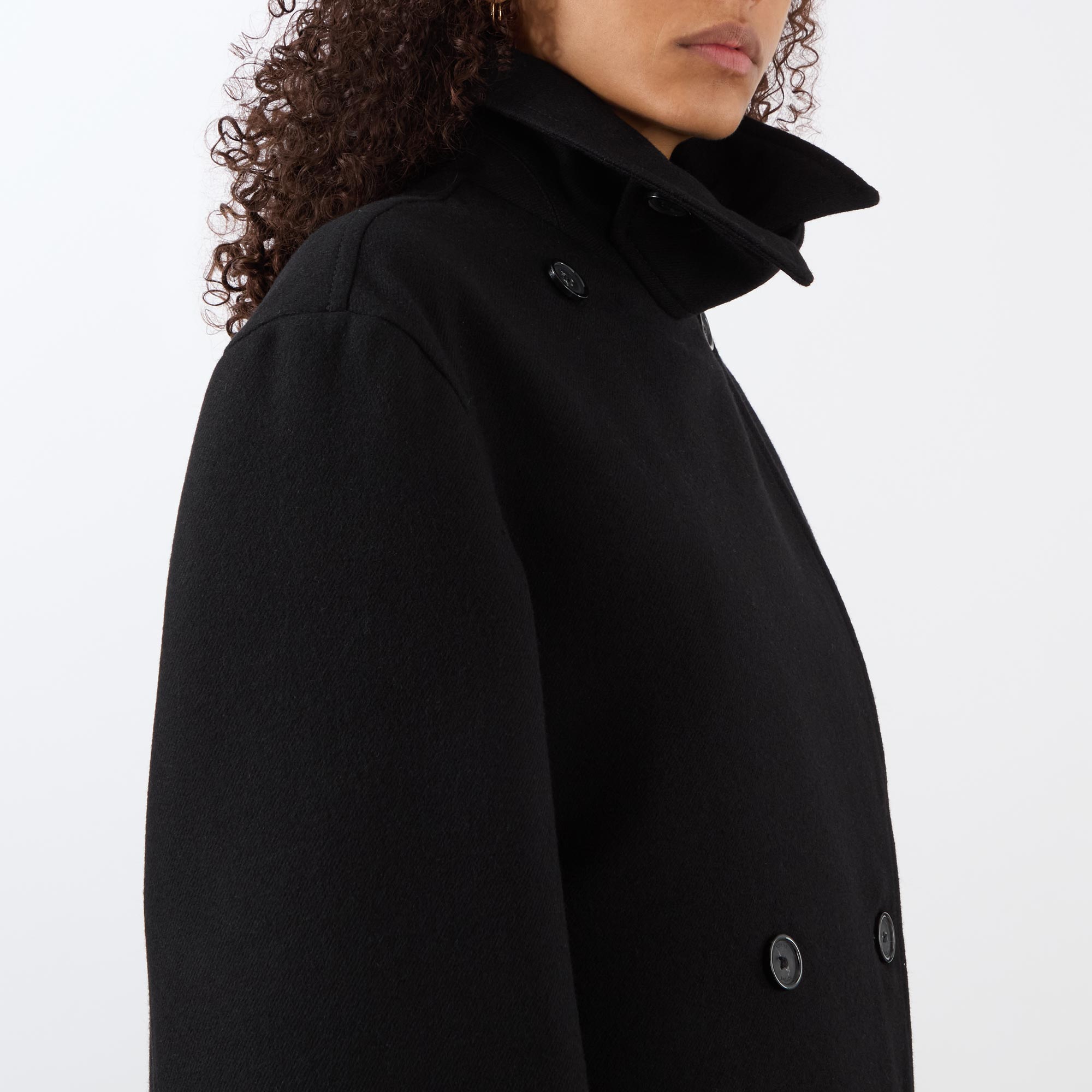 - Double breasted design, point collar, throat tab fastening, dropped shoulders, long sleeves, front button fastening, two horizontal welt pockets, straight hem, longline design, lined, soft finish