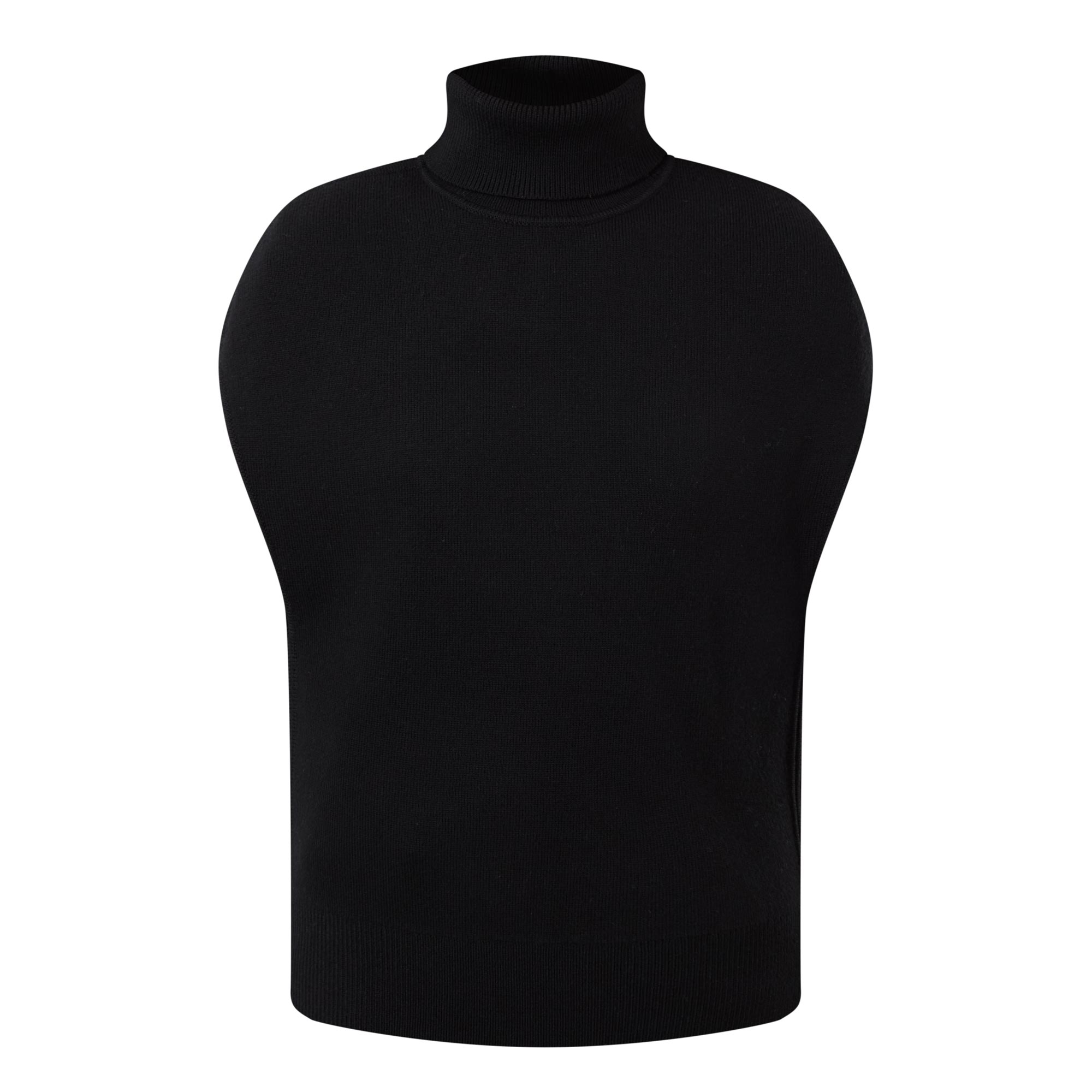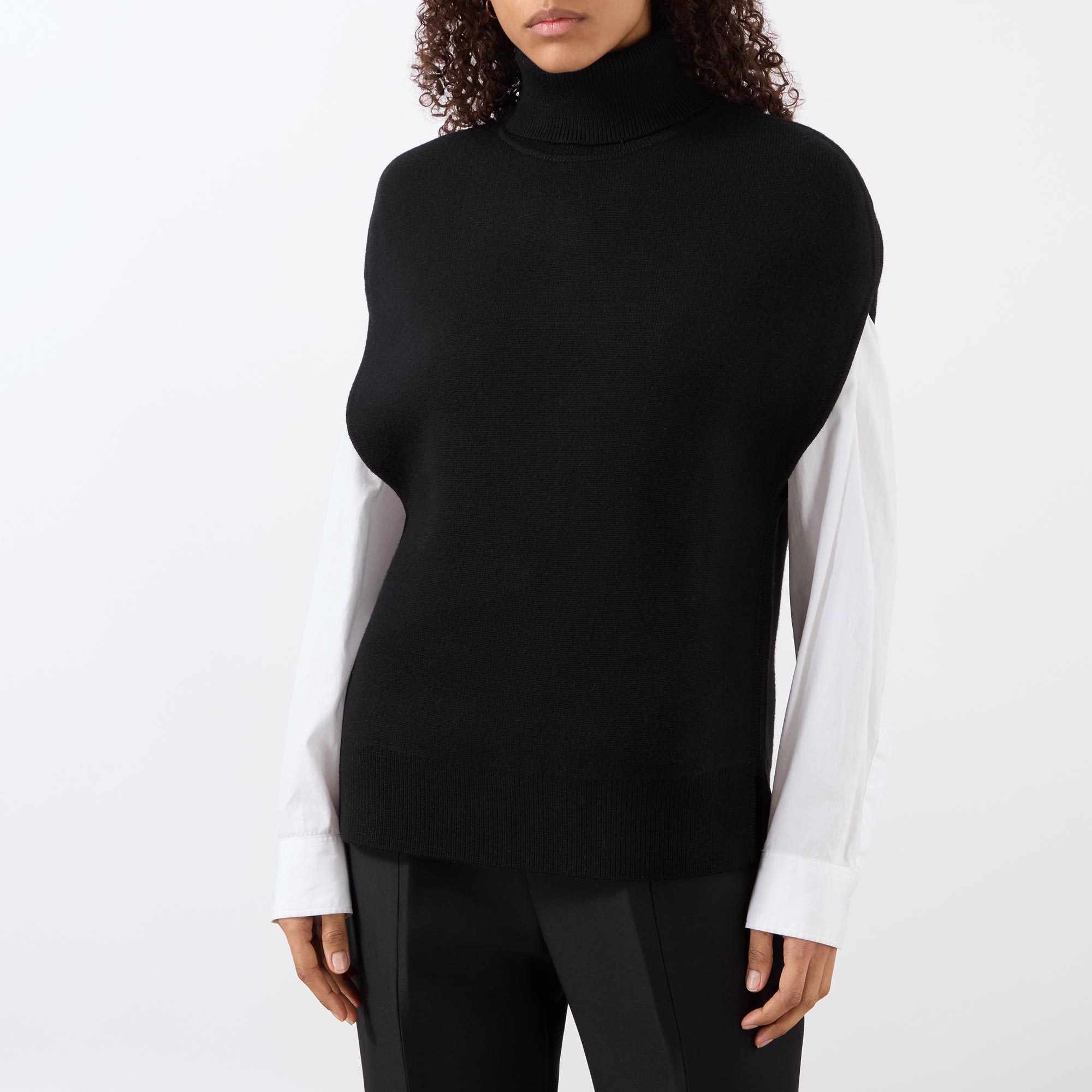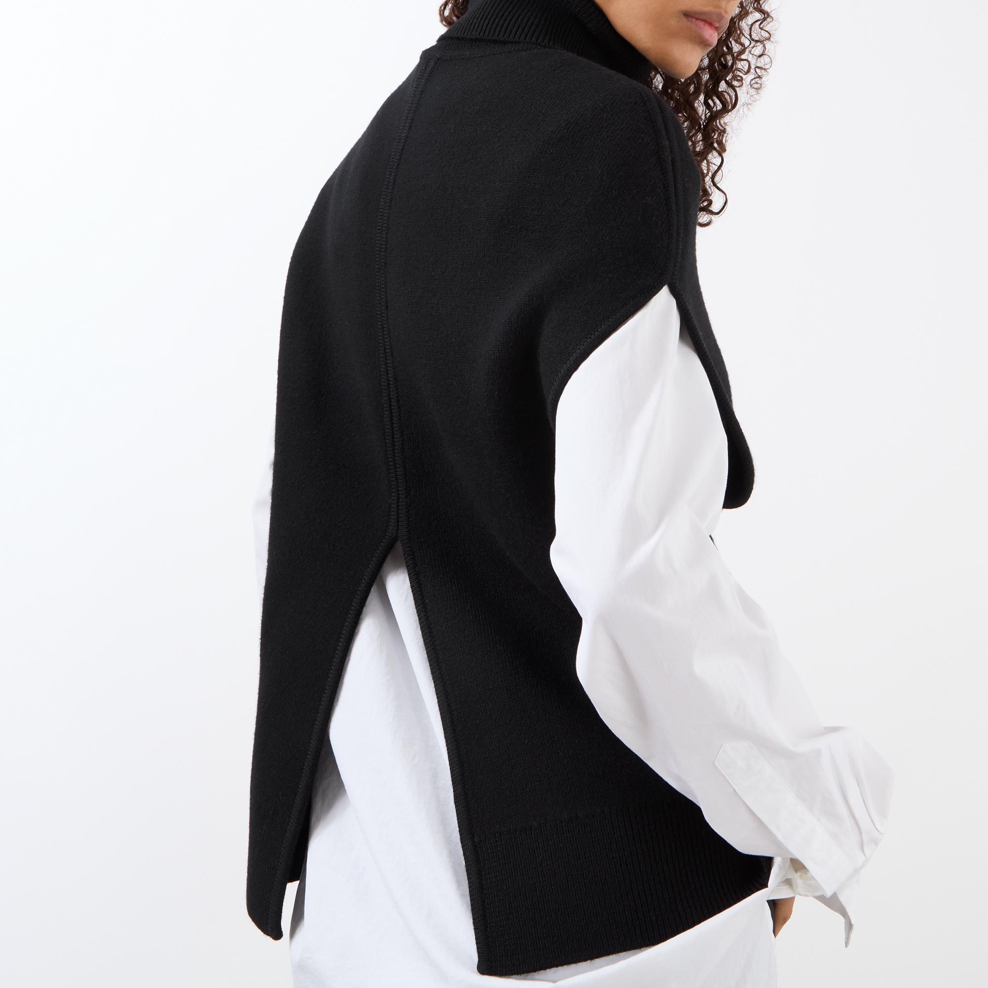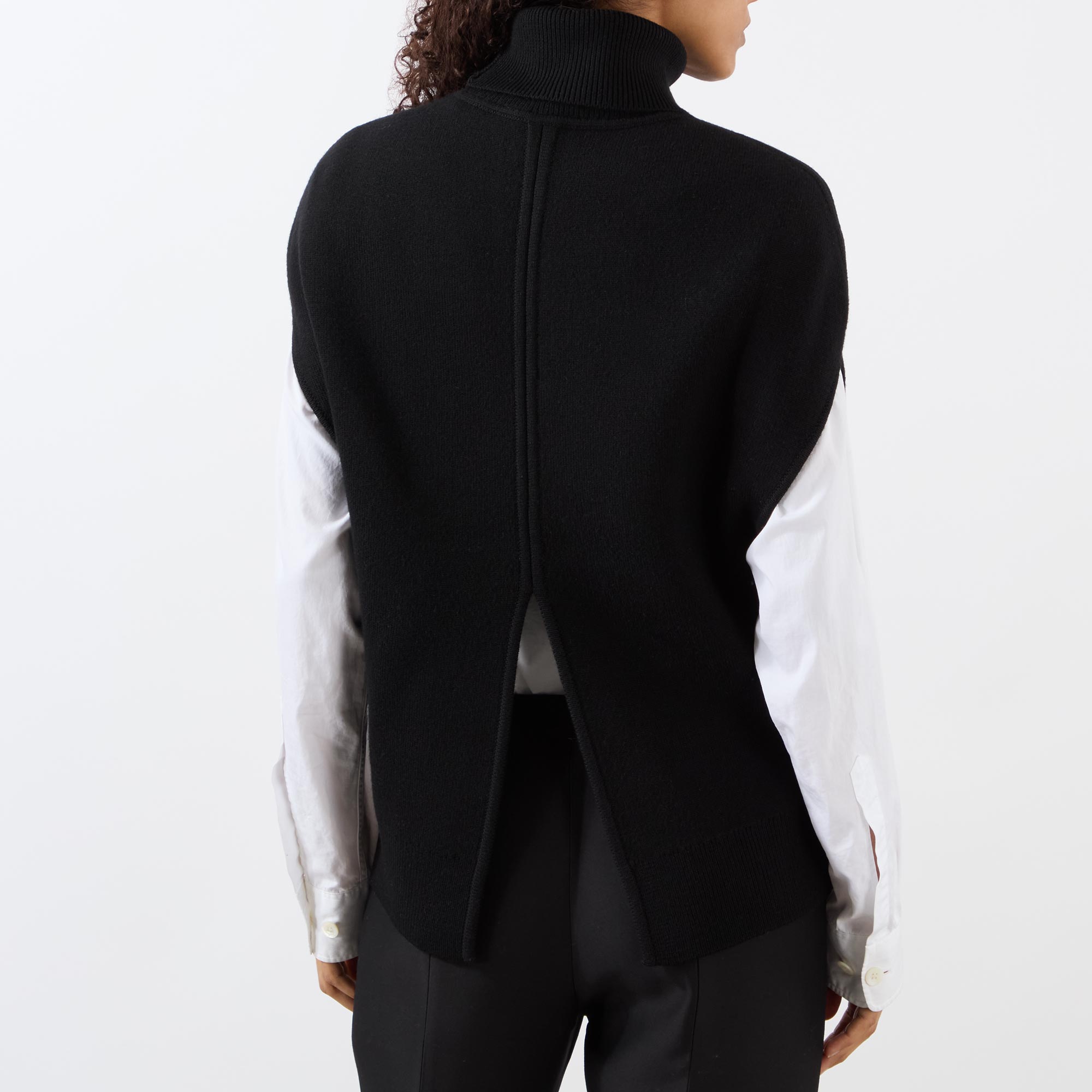 - Turtleneck, cape silhouette, rear seam detailing, split back design, double-faced knit construction, soft finish
