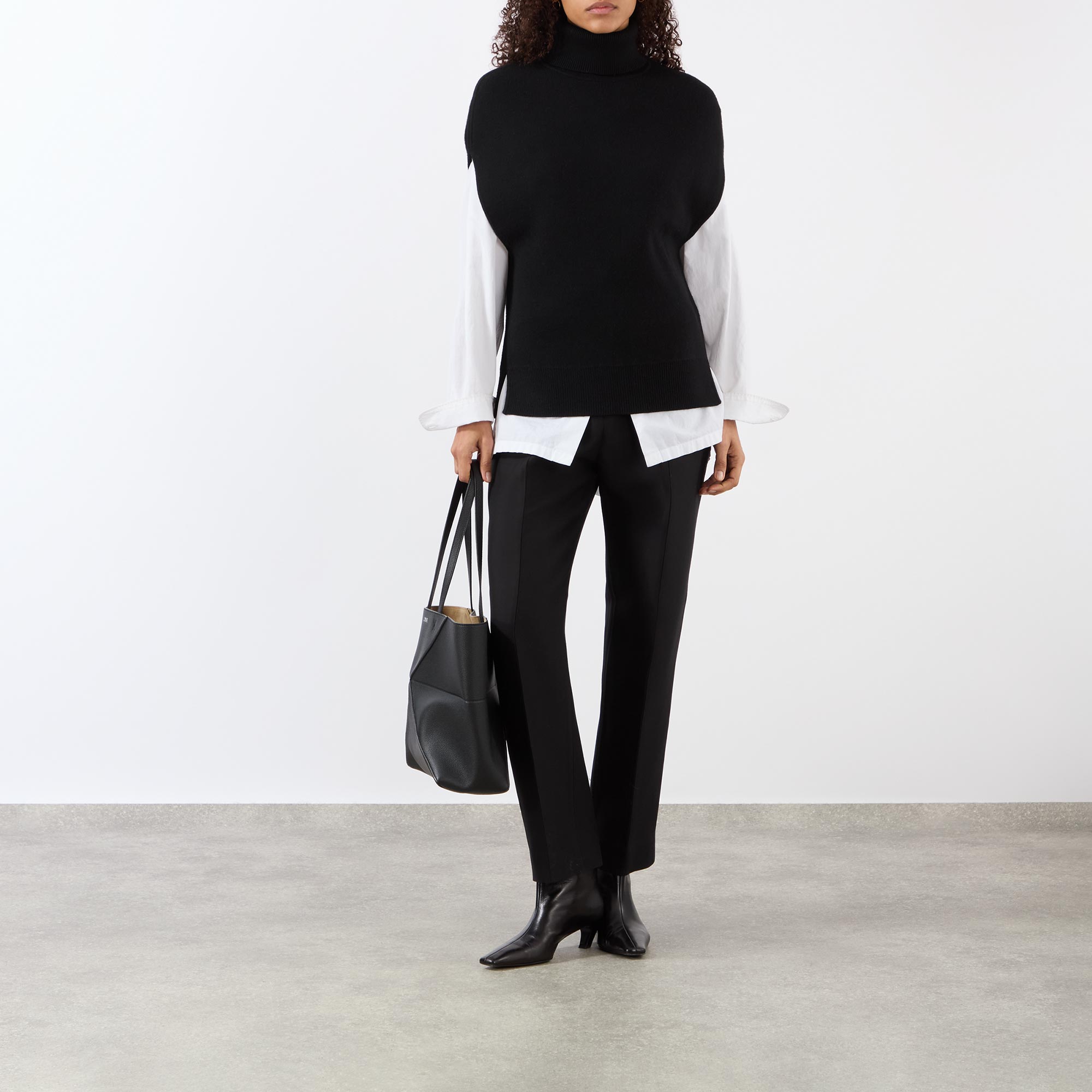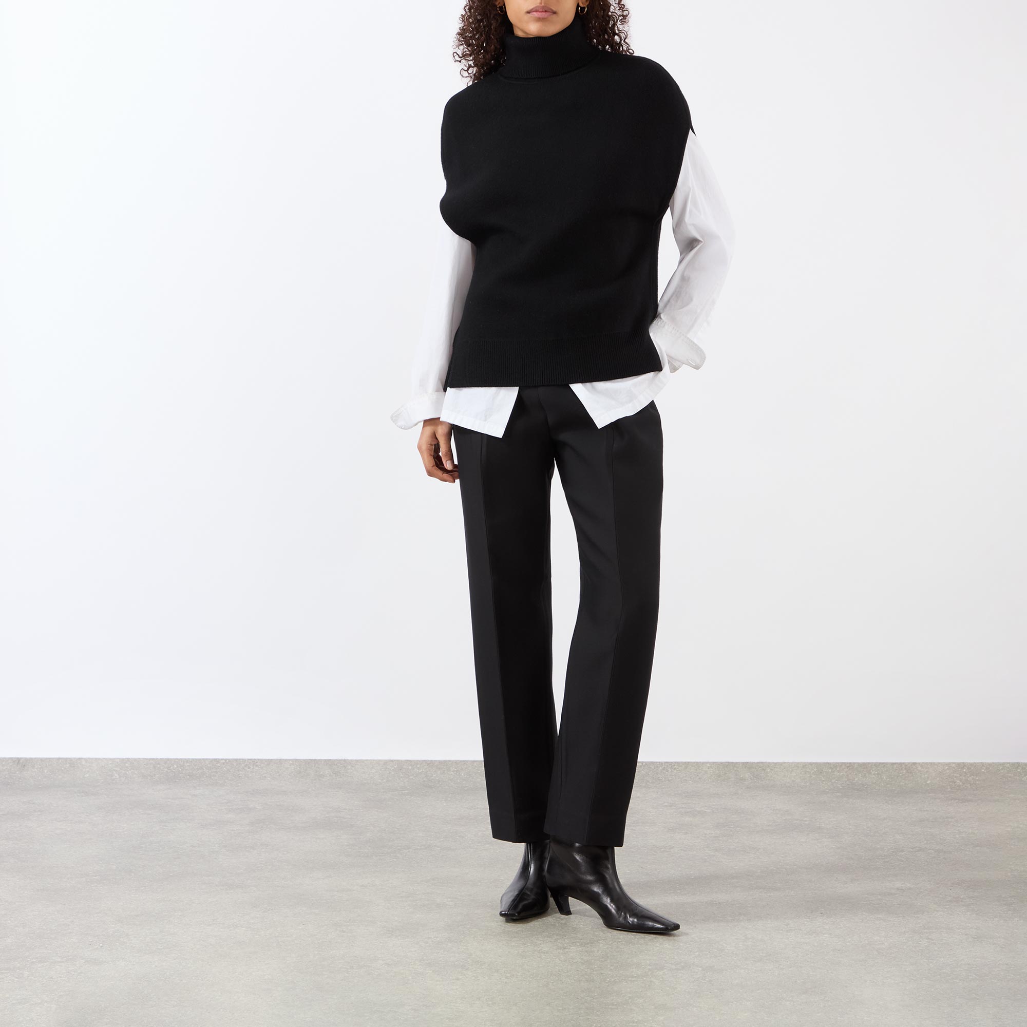 Totême's SS26 collection focuses on wardrobe archetypes reinterpreted through softness and subtlety, take this cape. Cut to a sleeveless silhouette, the double-faced design is framed by a turtleneck and features a rear split detail for versatile styling. Perfect for layering in the cooler months.