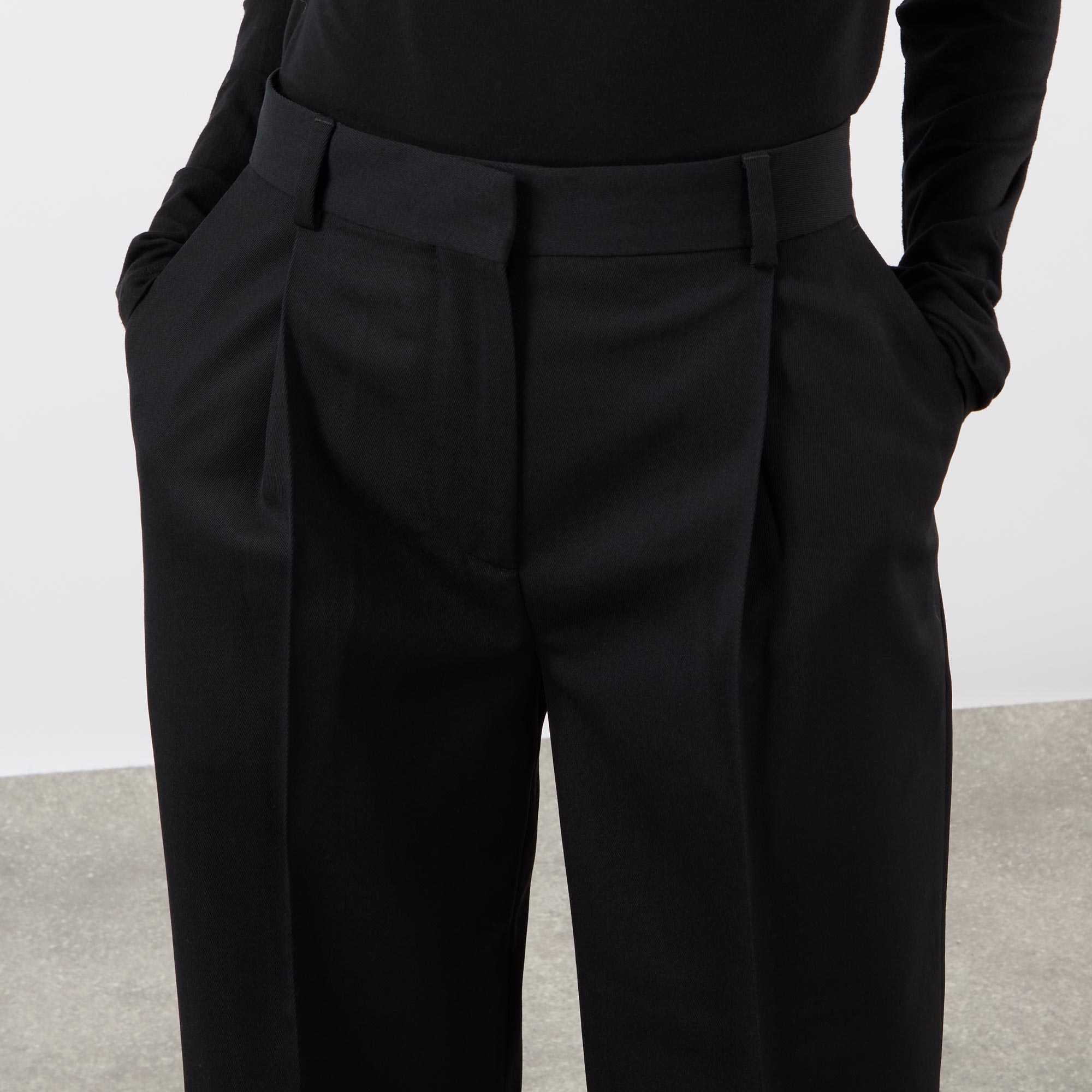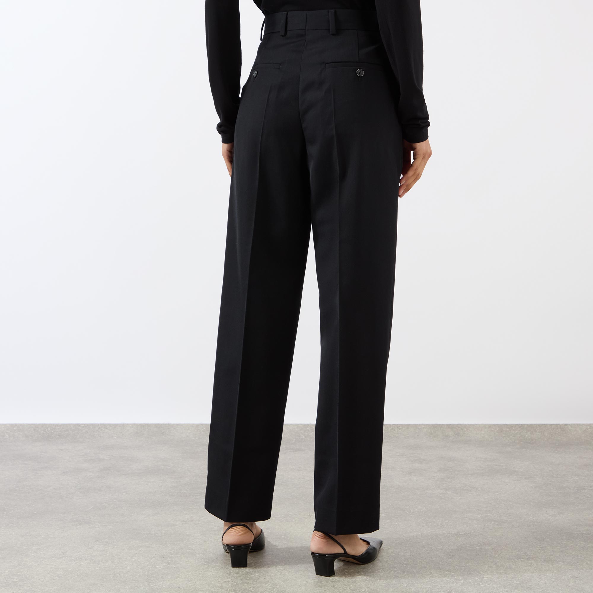 - Mid rise, straight leg, belt loops, concealed fly with hook and bar fastening, front pleats, two side entry pockets, two rear welt pockets with button fastenings, clean hems, pressed creases