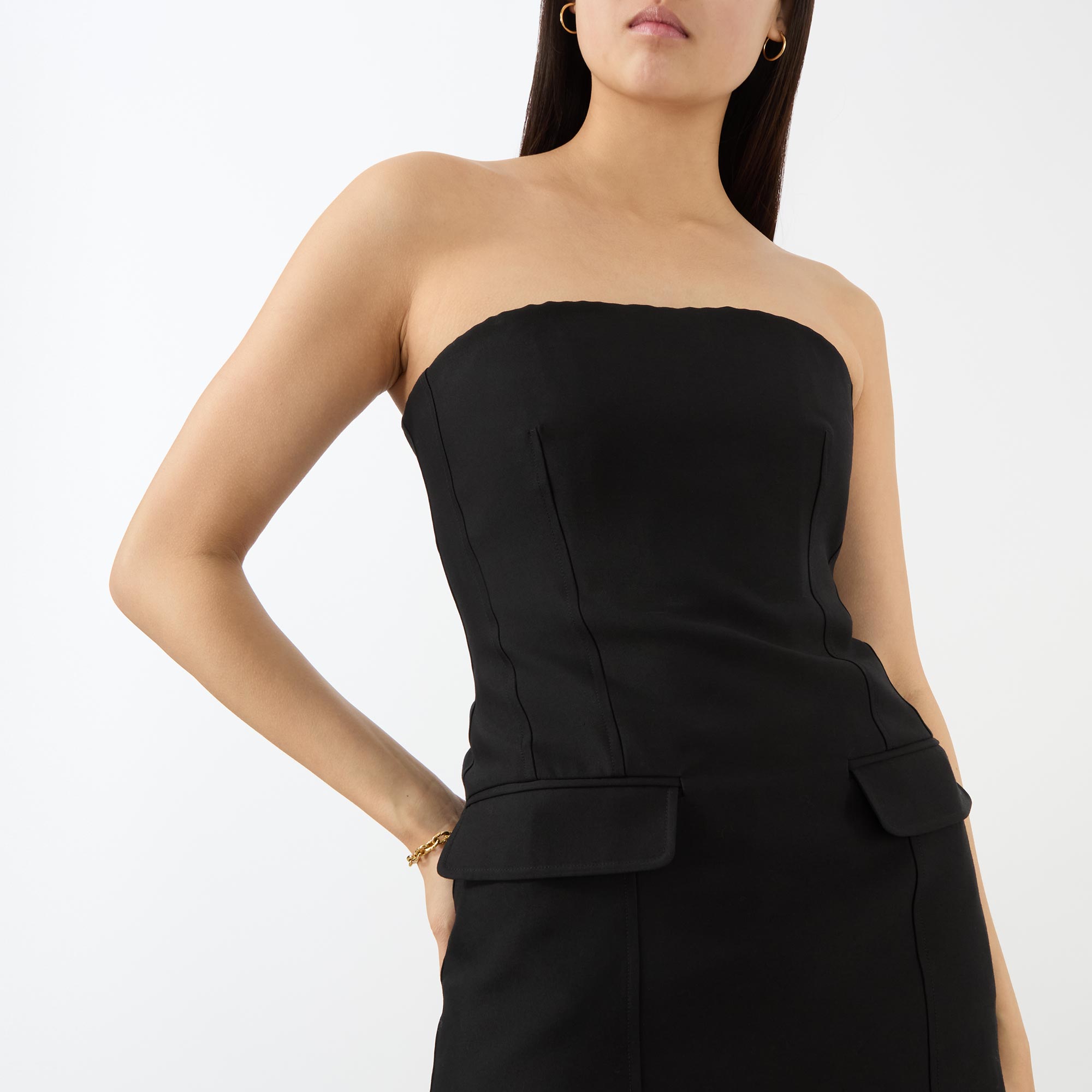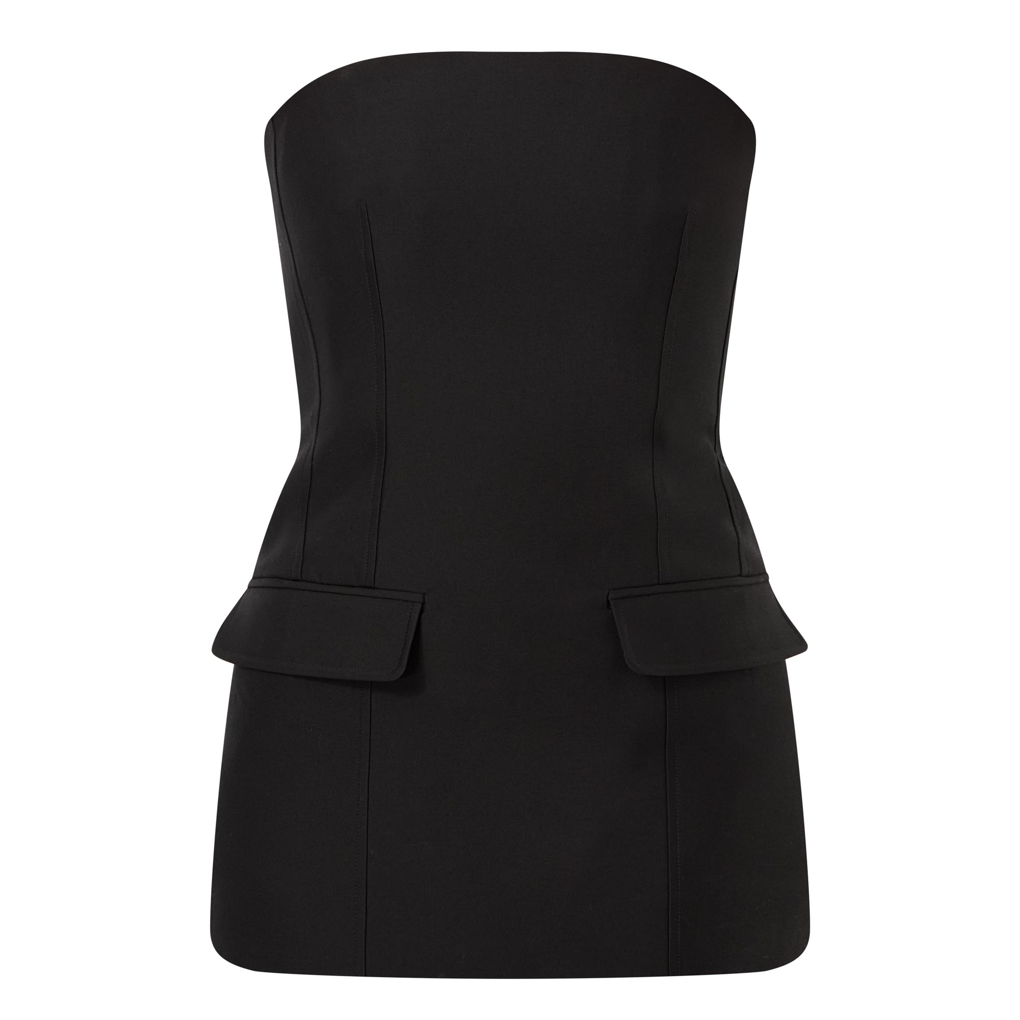 - Strapless design, rear zip fastening, darted construction, soft curvature at the waist, two hip flap pockets, straight hem, lined