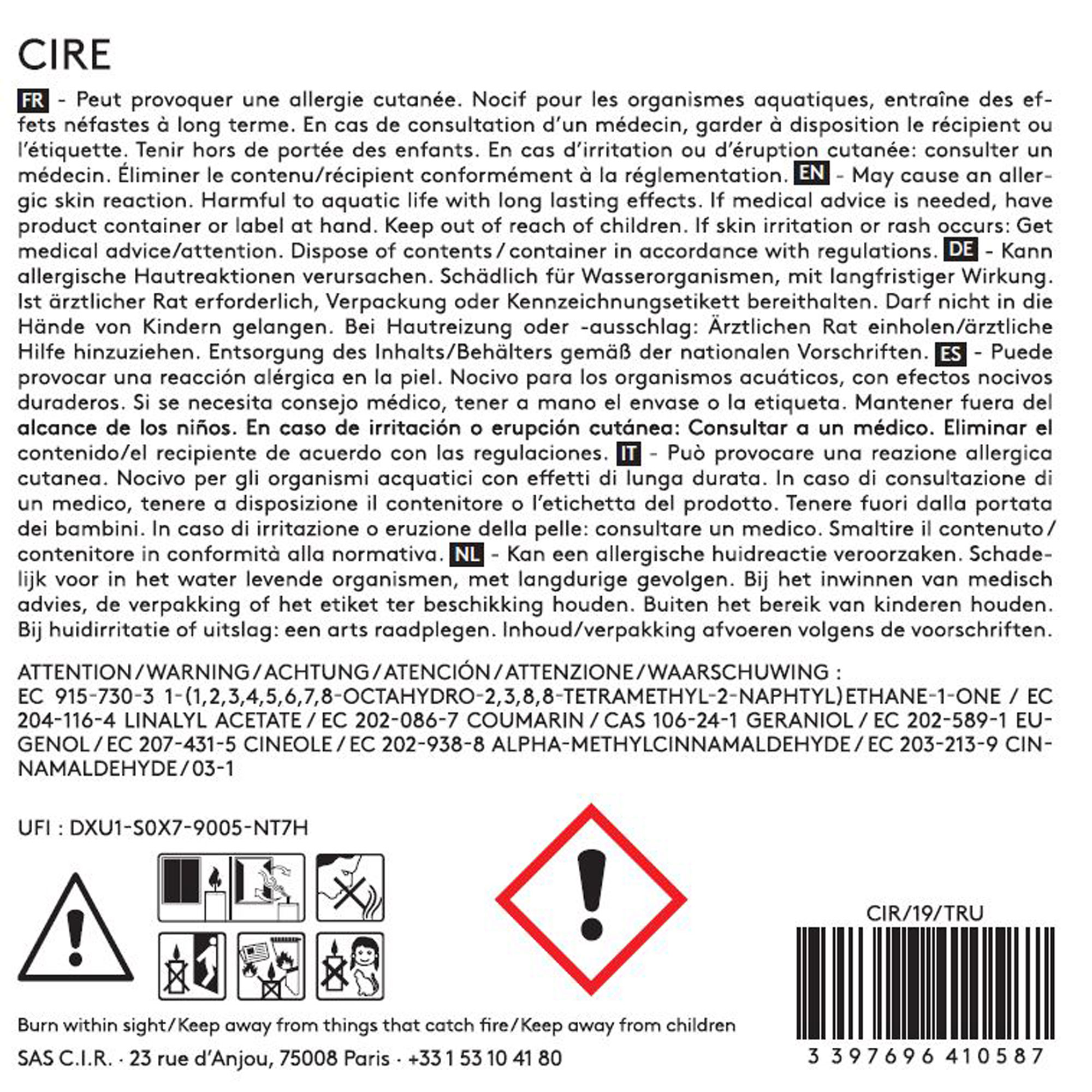 - Warning: May cause an allergic skin reaction. Harmful to aquatic life with long lasting effects. IF ON SKIN: Wash with plenty of water and soap. If skin irritation or rash occurs: Get medical advice/attention. Contains: OCTAHYDRO-TETRAMETHYL-2-NAPHTHALENYL)ETHANONE, LINALYL ACETATE, COUMARIN, GERANIOL, EUGENOL, EUCALYPTOL, ALPHA-METHYLCINNAMALDEHYDE, BETA-CARYOPHYLLENE, CINNAMALDEHYDE. Emergency telephone number : +33 (0)1 45 42 59 59. Association/Organisation : INRS / ORFILA http://www.centres-antipoison.net.