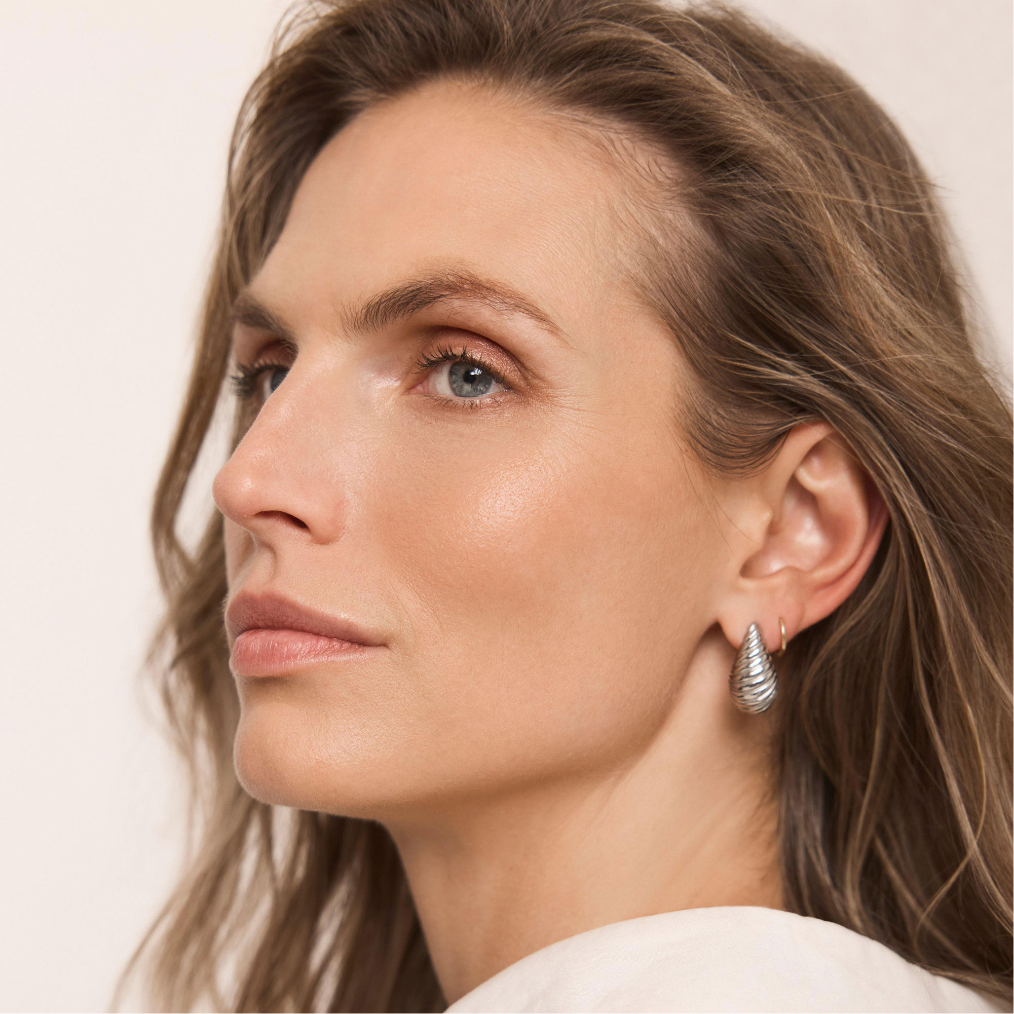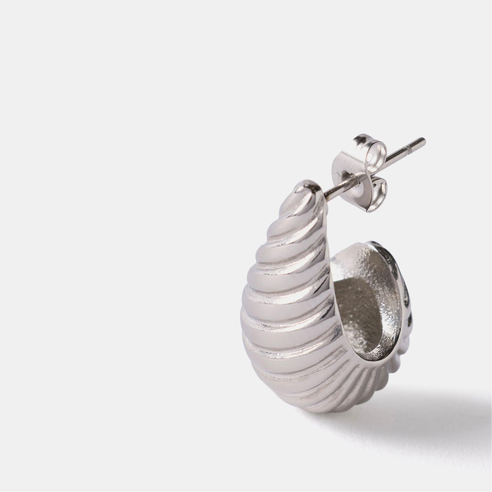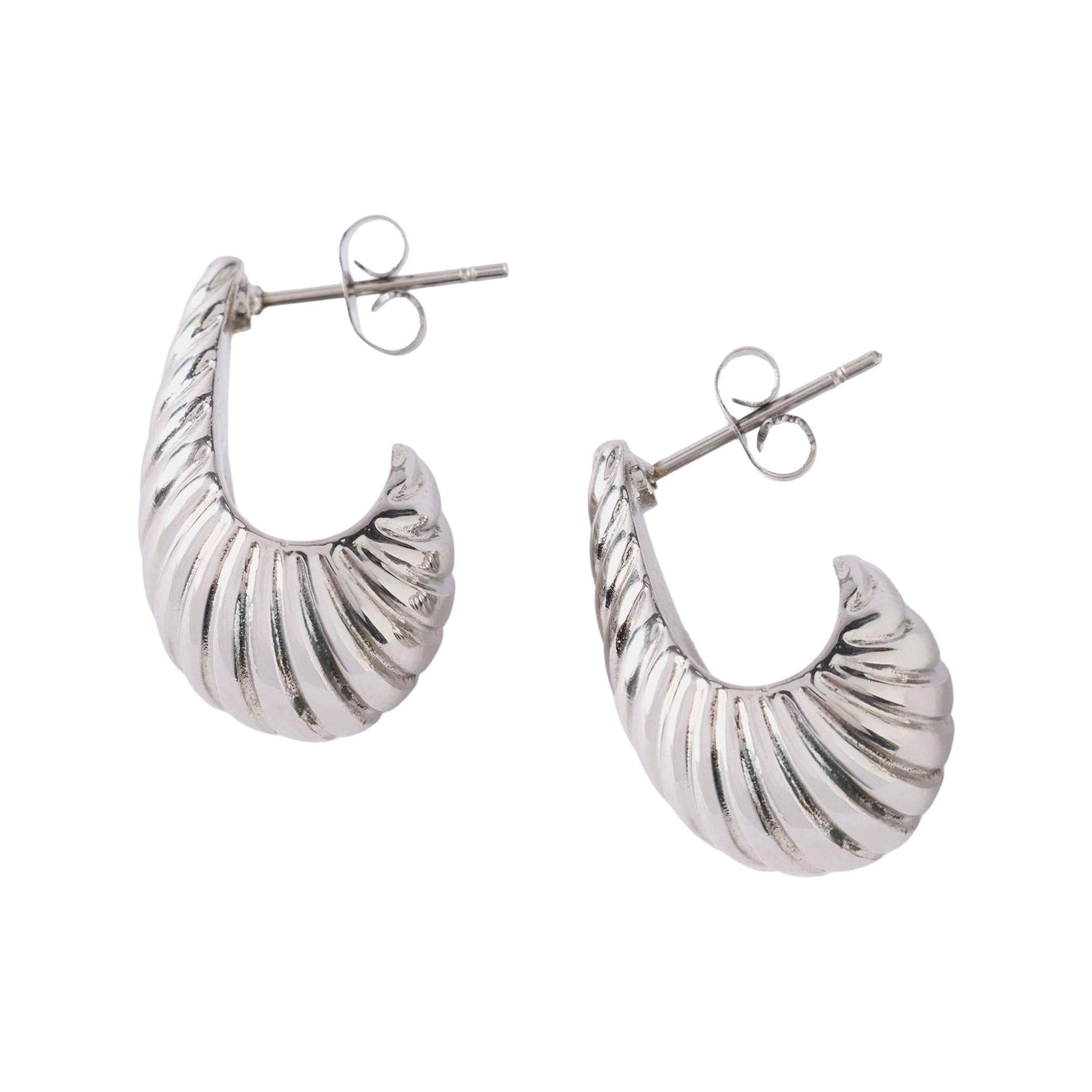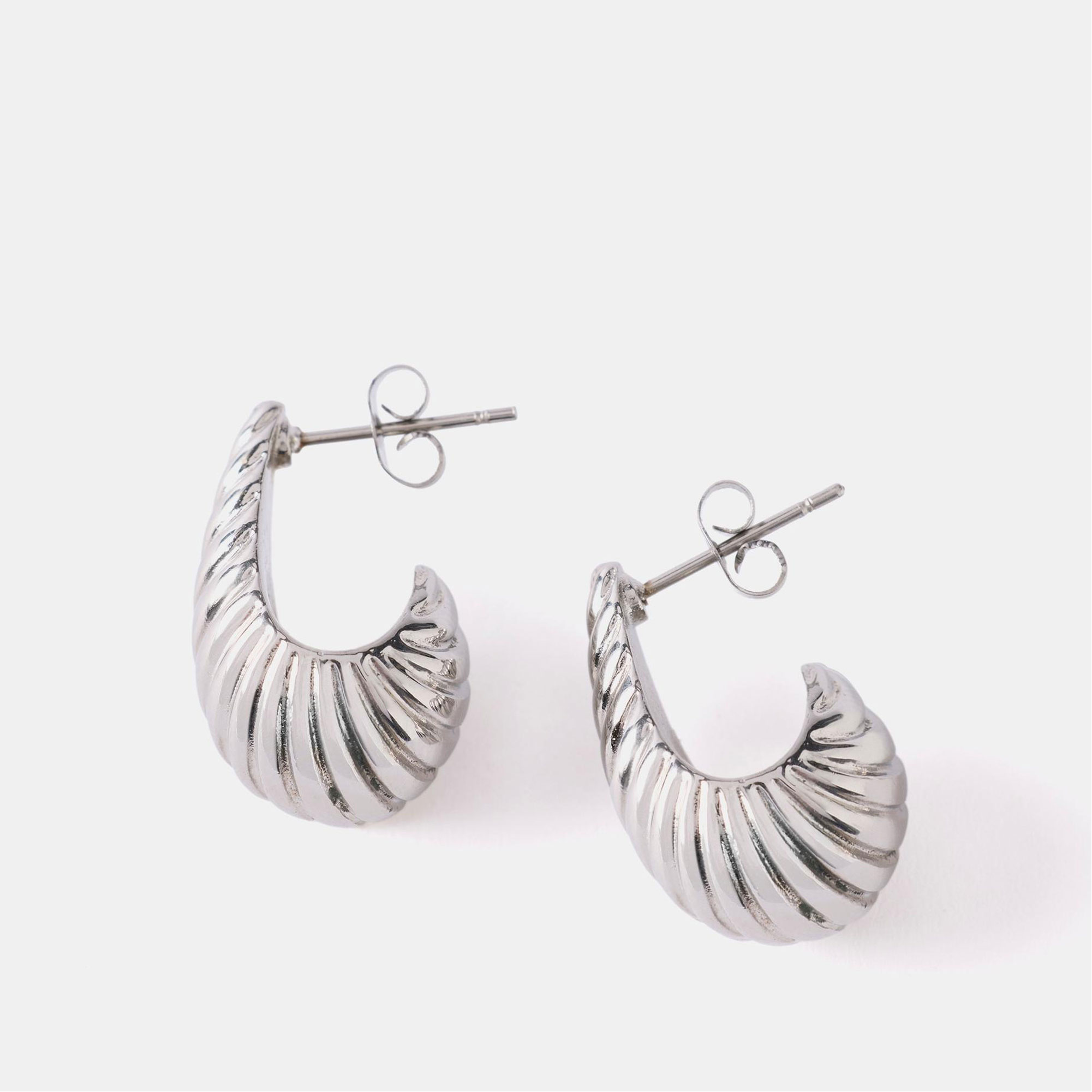 • Stainless steel, ribbed design, curved silhouette, huggie style, butterfly clasp fastening