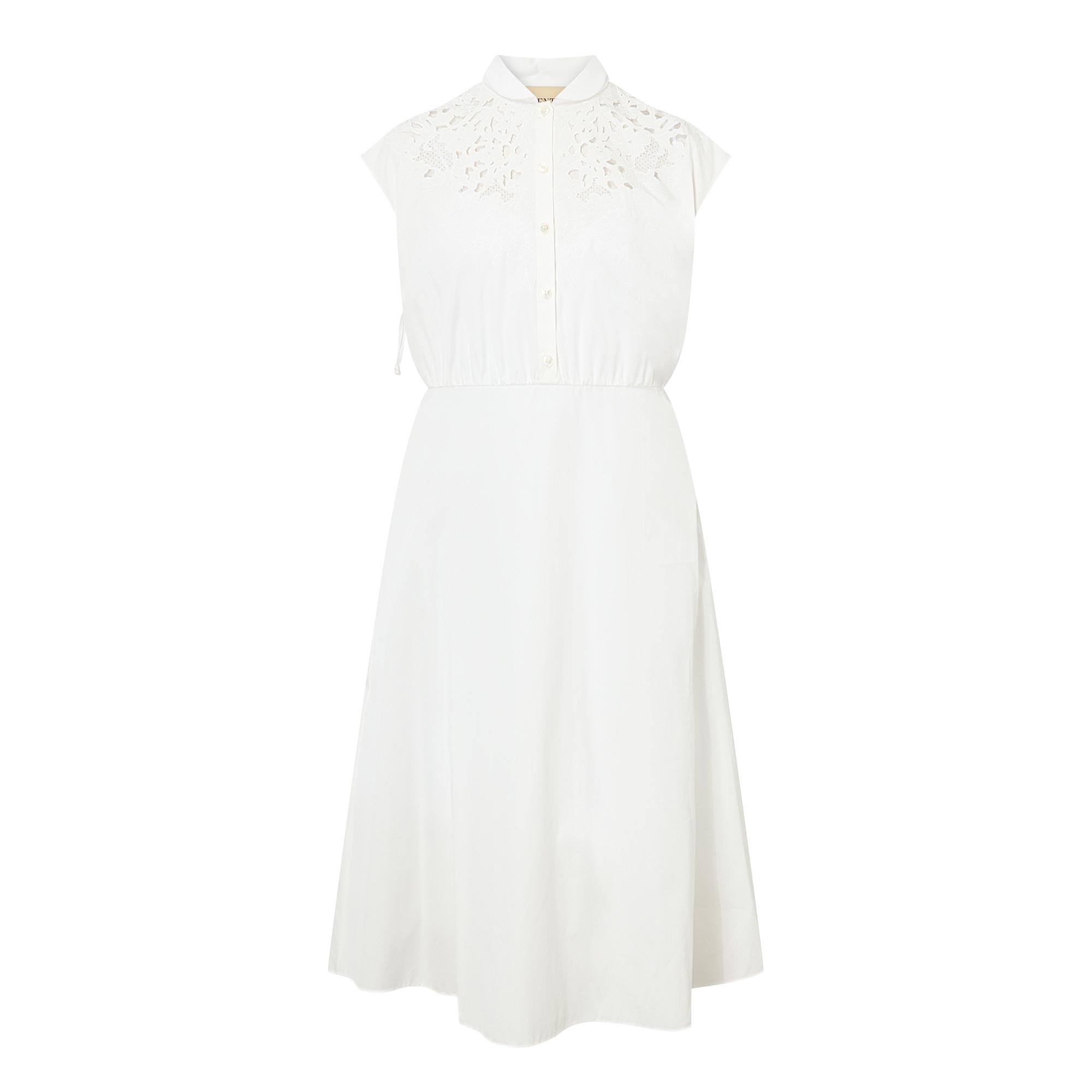 Soft romanticism underpins the SS26 collection from Valentino, highlighted in the design of this dress. Featuring a rounded collar, it falls to a midi length, finished with laser-cut and embroidered detailing.