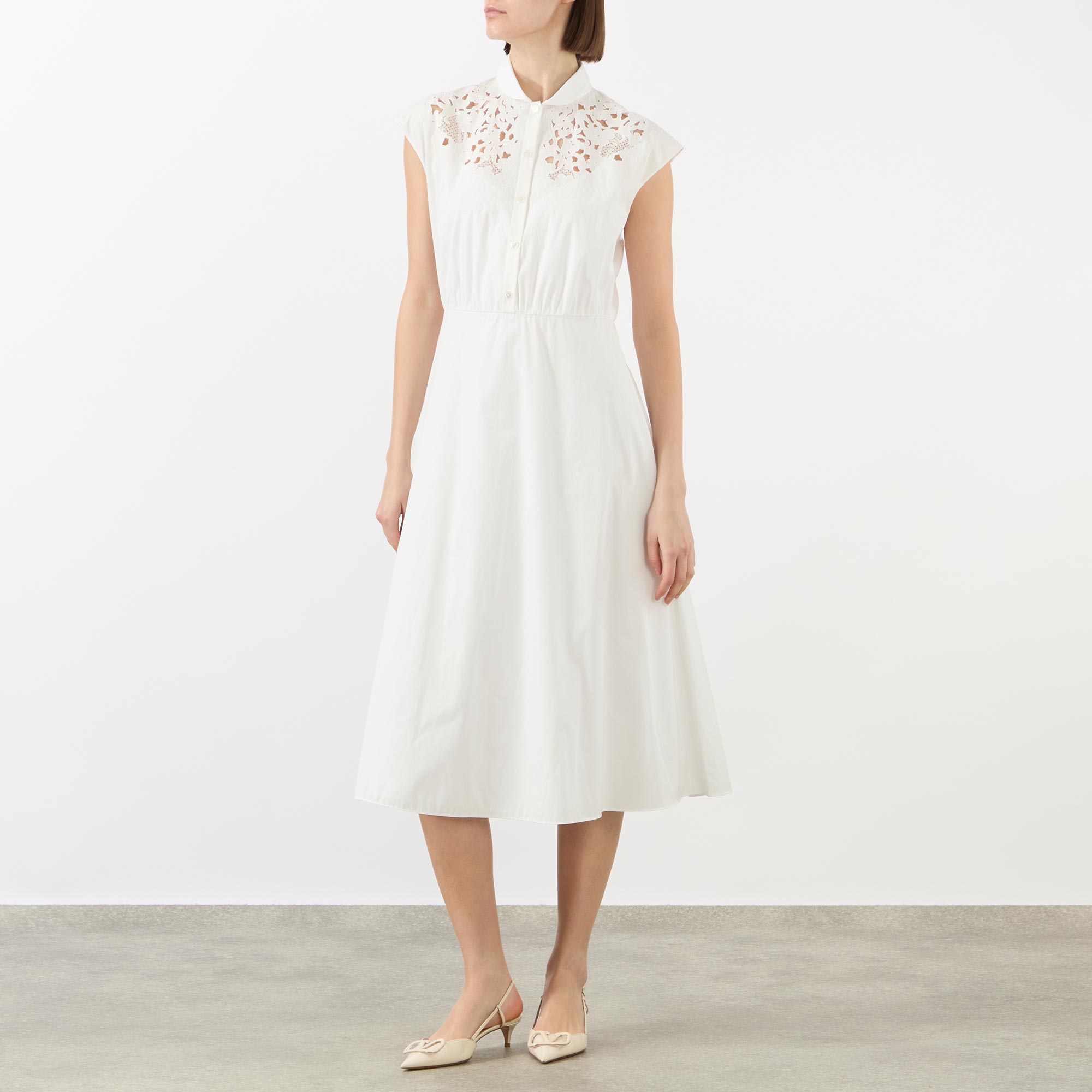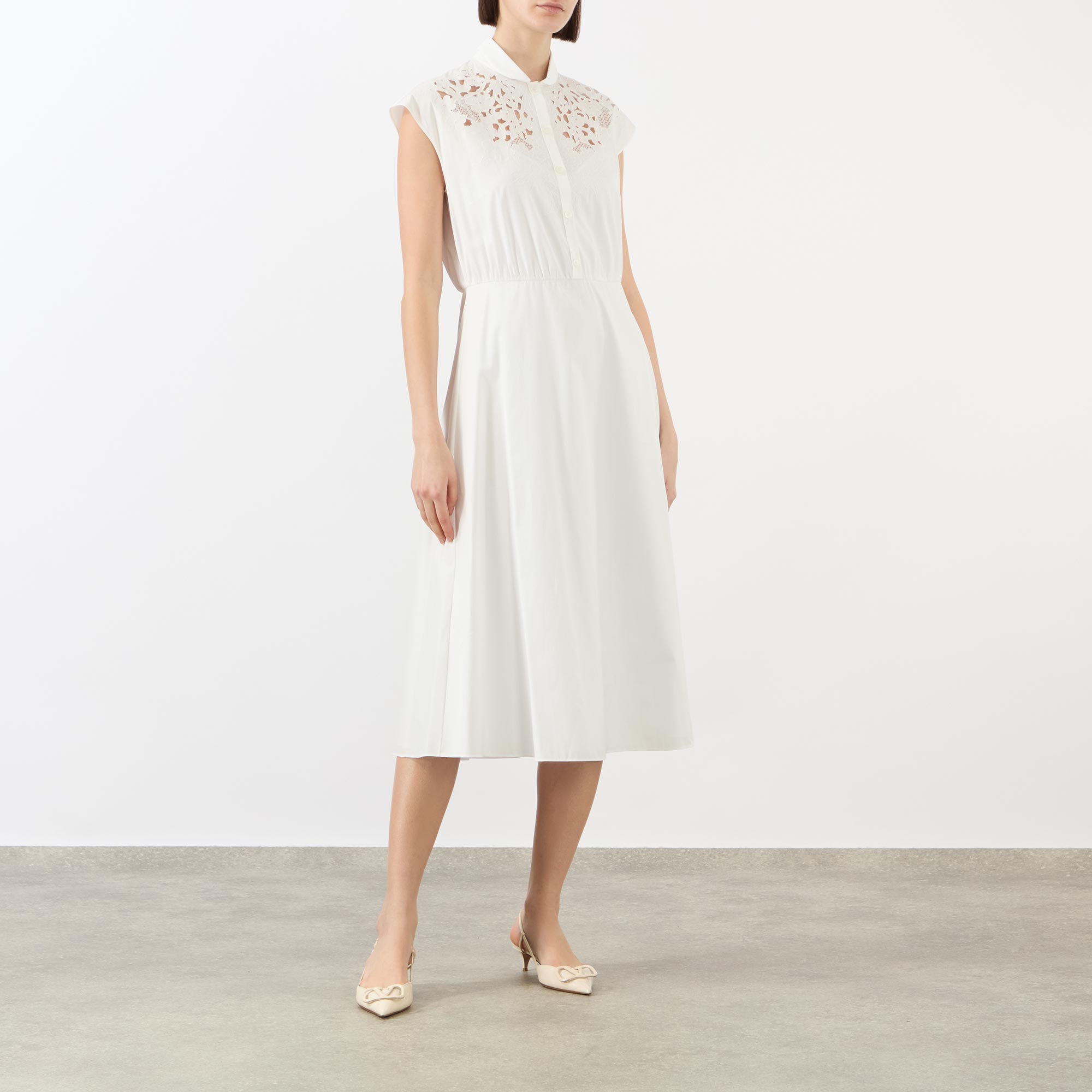 - Rounded collar, half-button fastening, fitted waist, midi length, cap sleeves, laser-cut and embroidery details, flared hemline
