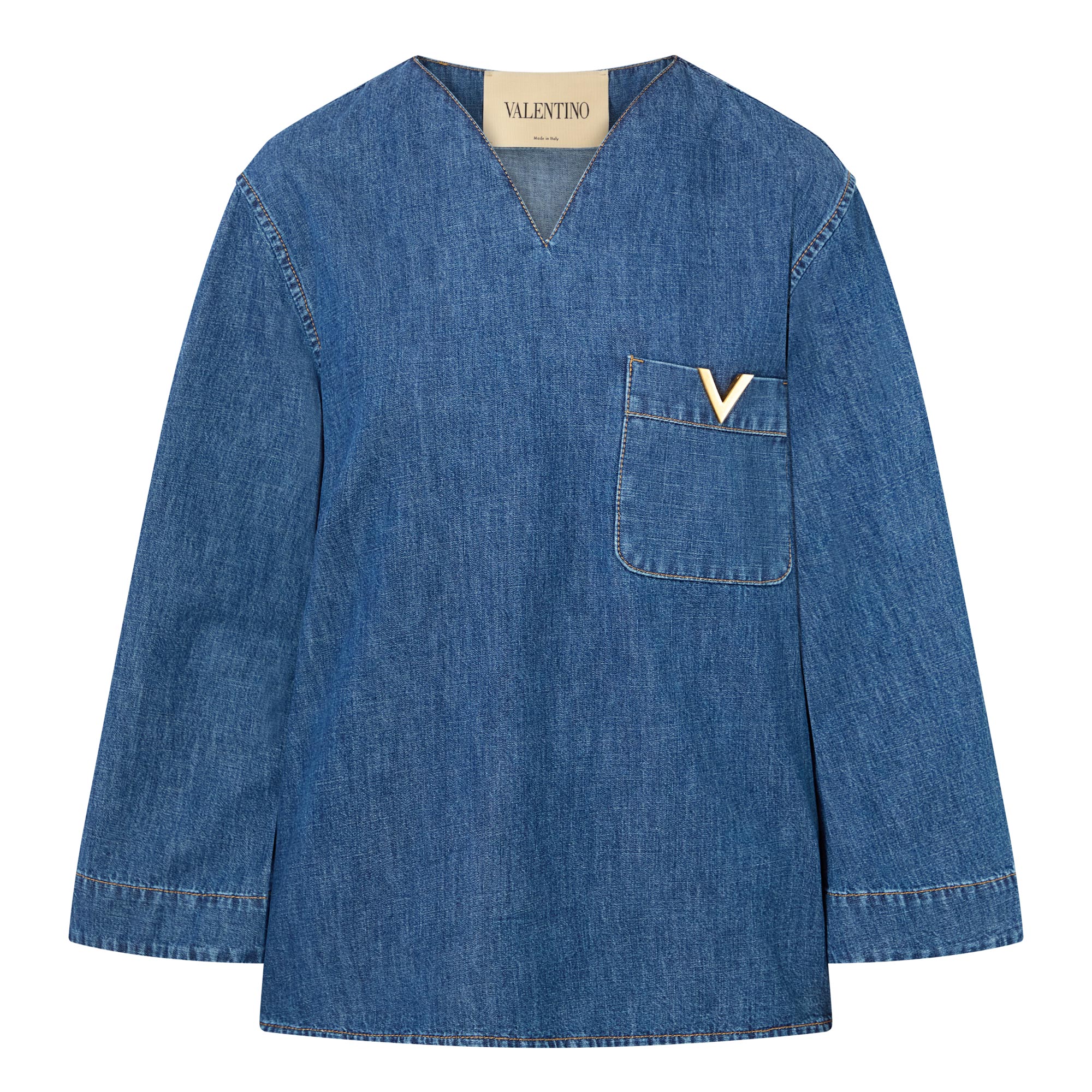 Gleaming logo hardware adorns a range of styles across the SS26 collection by Valentino, seen in the design of this blouse. It features a V-neckline and three-quarter-length sleeves, finished with a chest patch pocket and tobacco stitching.