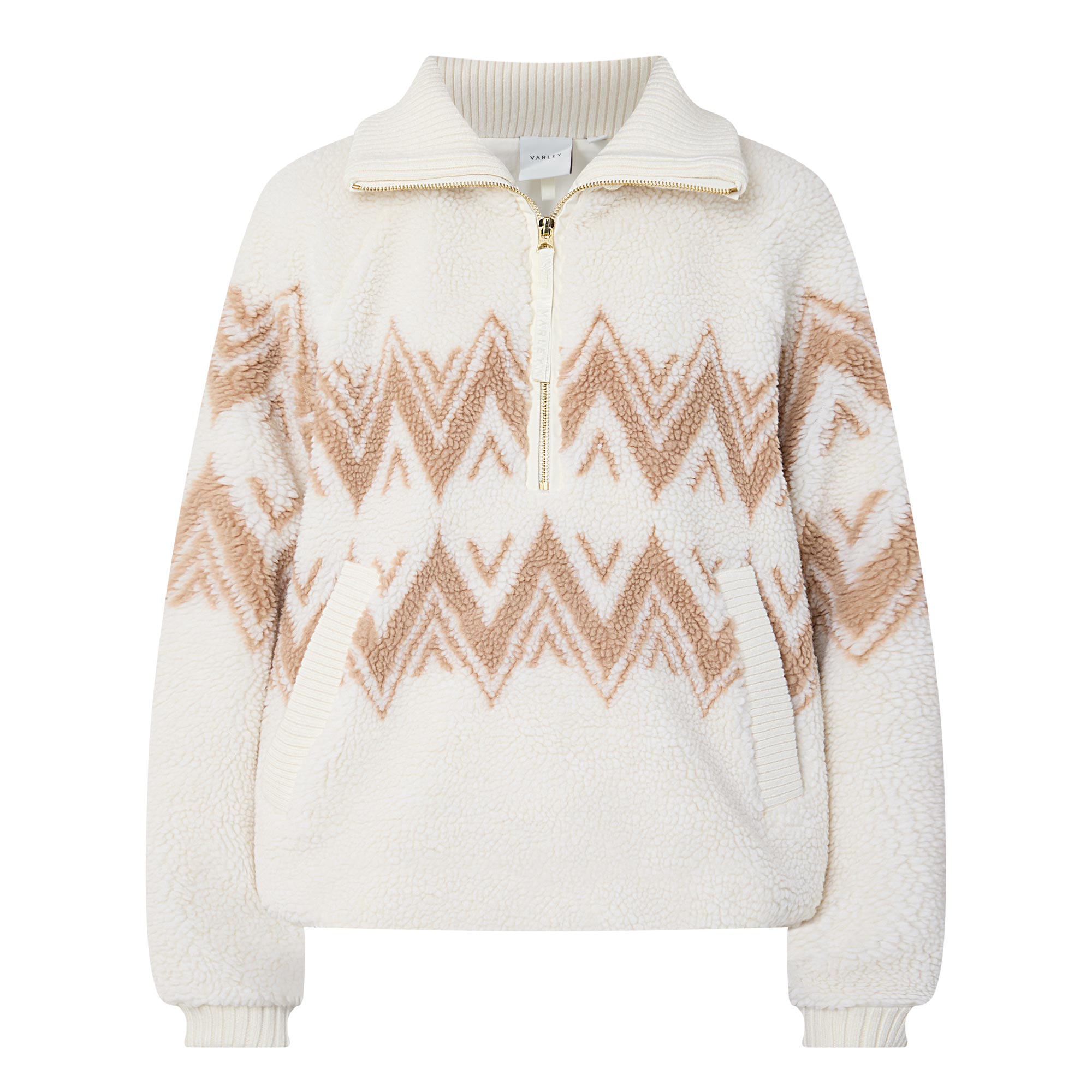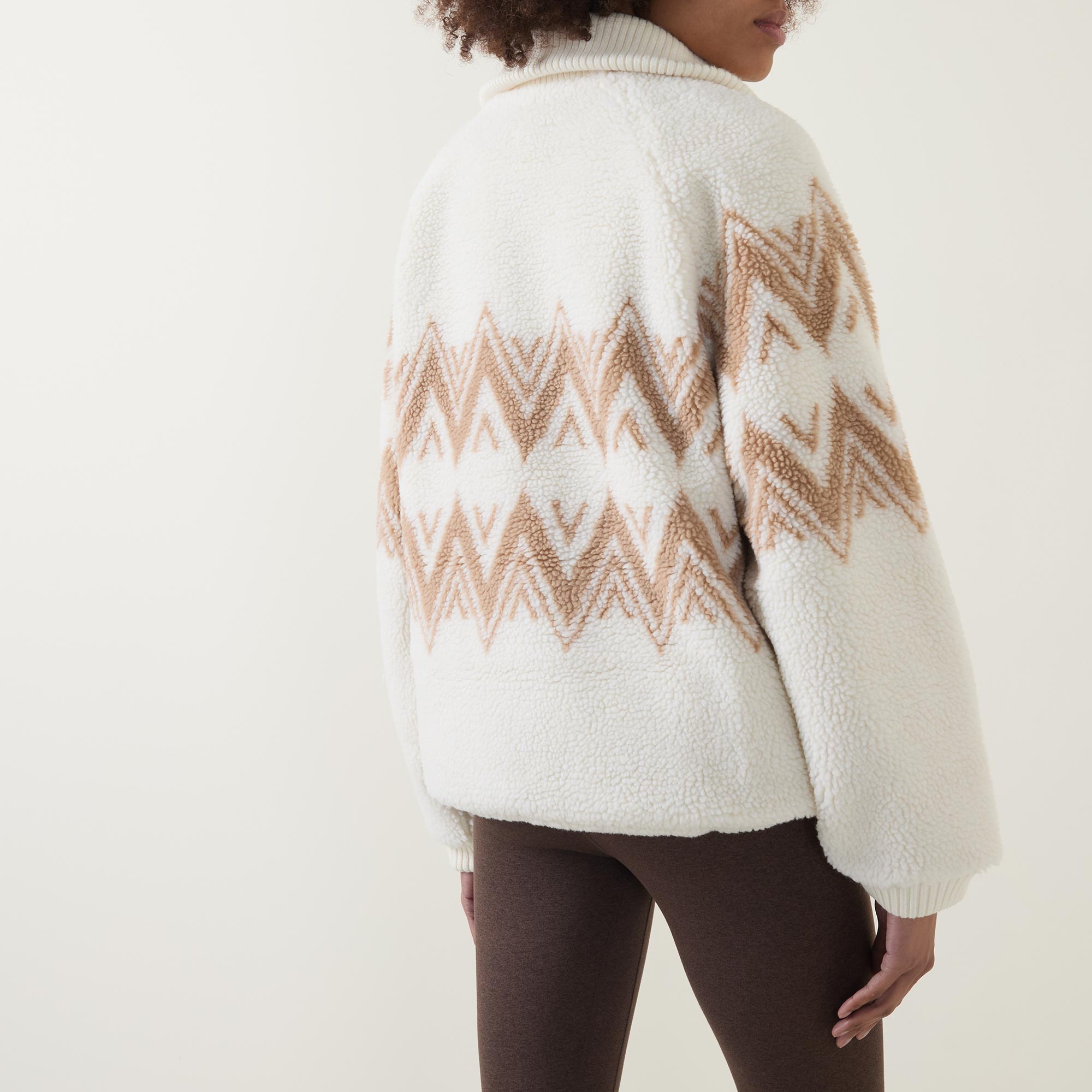 - Fold down collar, half zip placket, long sleeves, two angled welt pockets with ribbed trims, straight hem, gold-tone hardware, zig zag pattern, soft textured finish