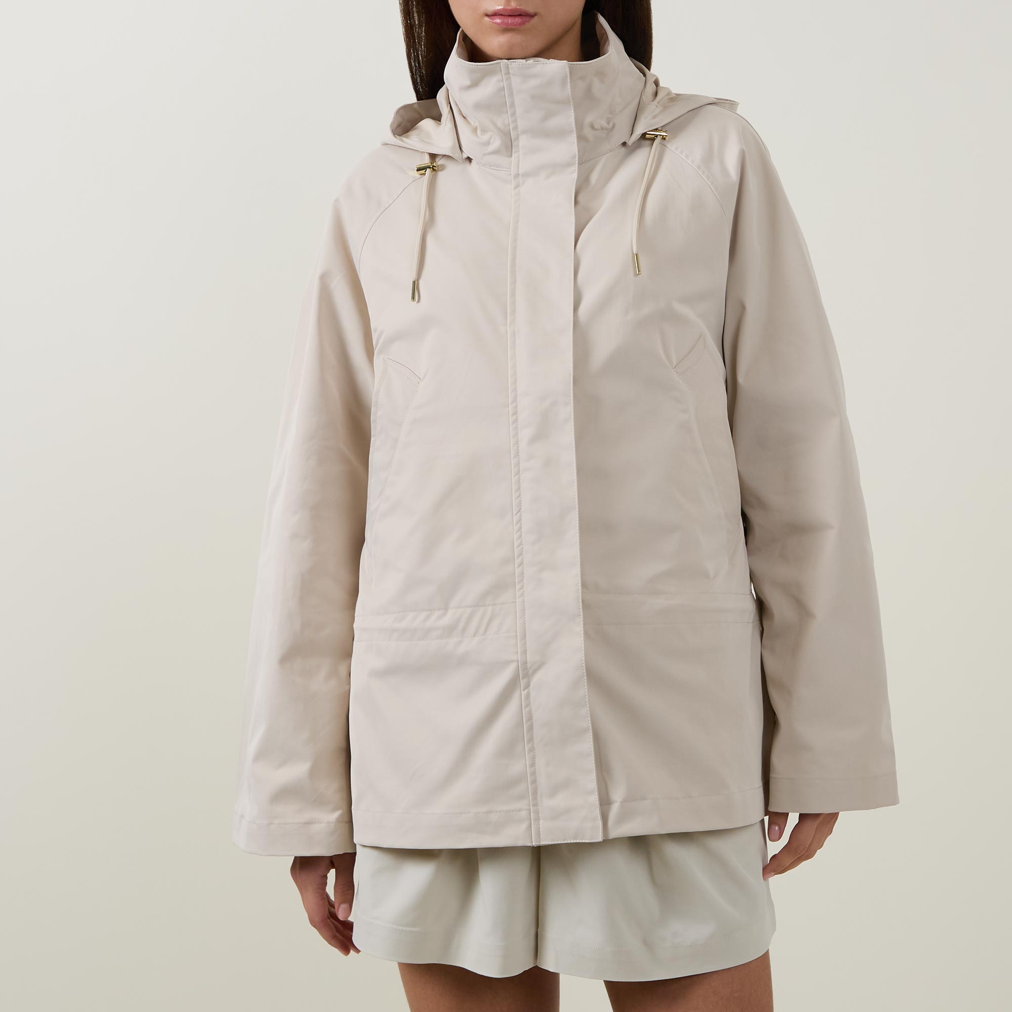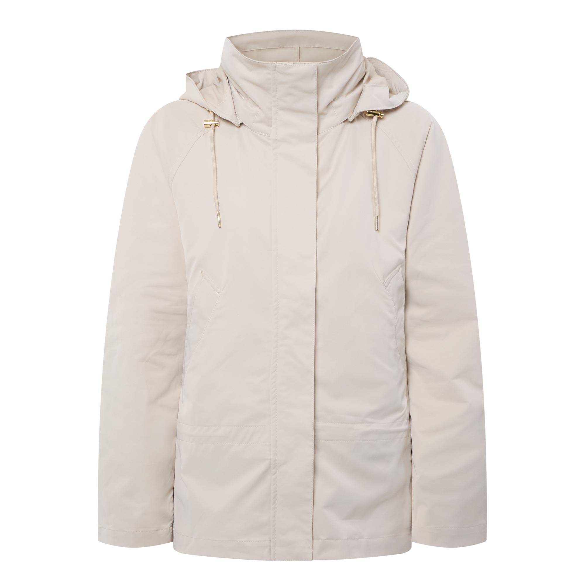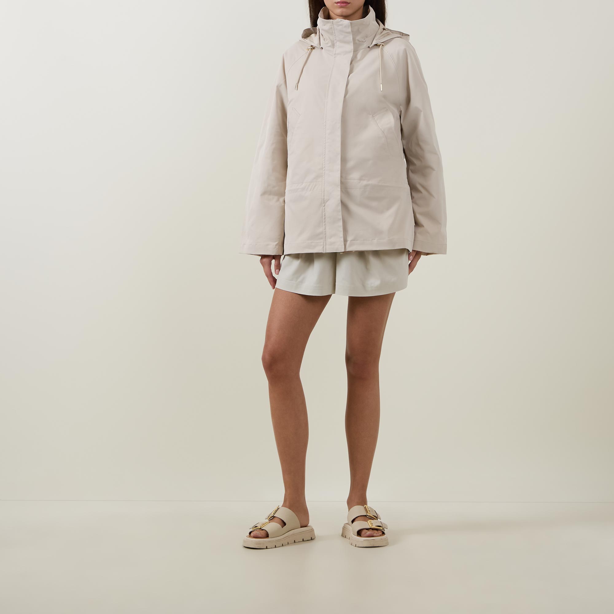 - Detachable snap-off hood with drawstring adjustable fit, concealed snap button and zip fastening, side entry pockets, storm flap, long sleeves, low-waist cinch detail, toggle fastening
